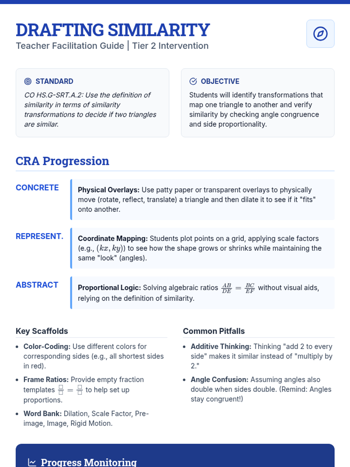 A targeted Tier 2 intervention lesson focusing on similarity through transformations, dilations, and triangle similarity criteria. Includes scaffolded instruction and progress monitoring.