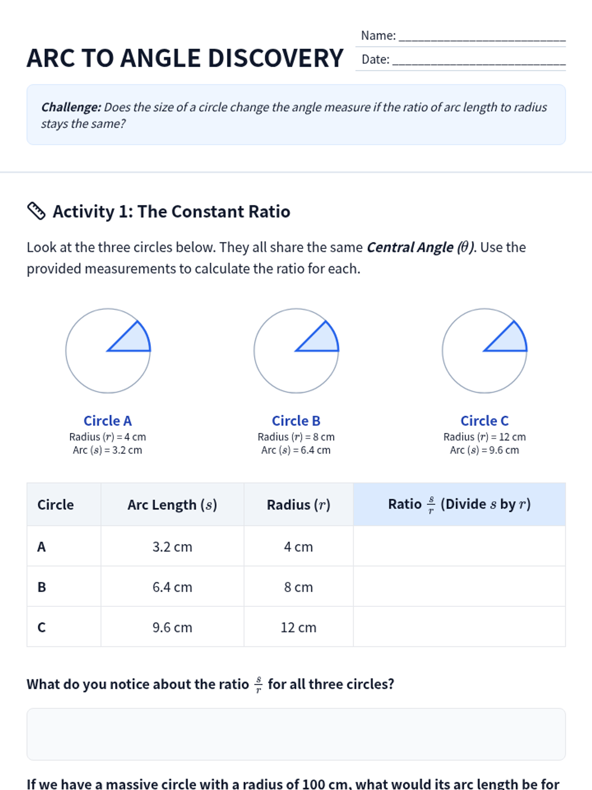 A targeted intervention lesson exploring the relationship between central angles, arc lengths, and sector areas through hands-on measurement and proportional reasoning.