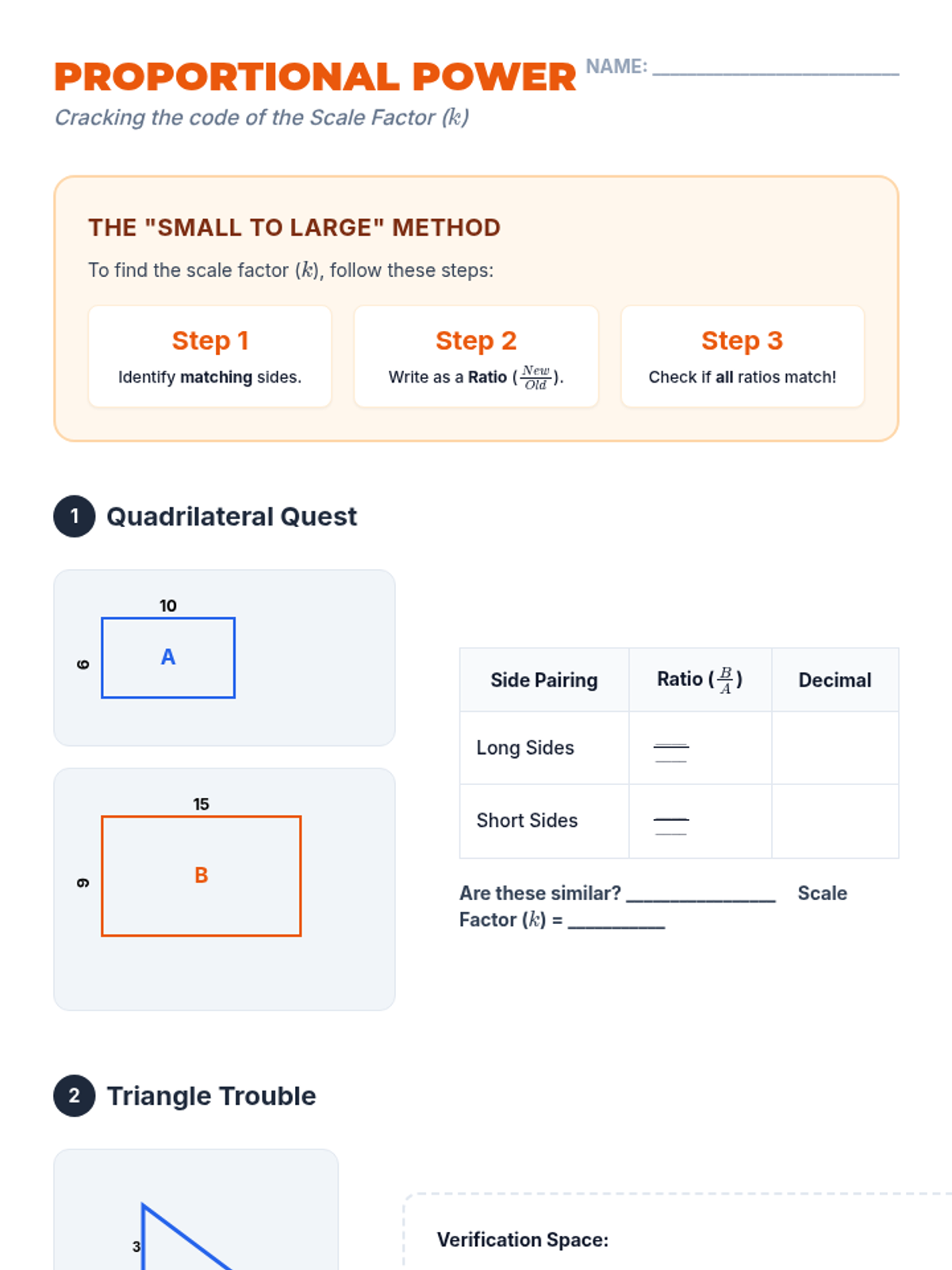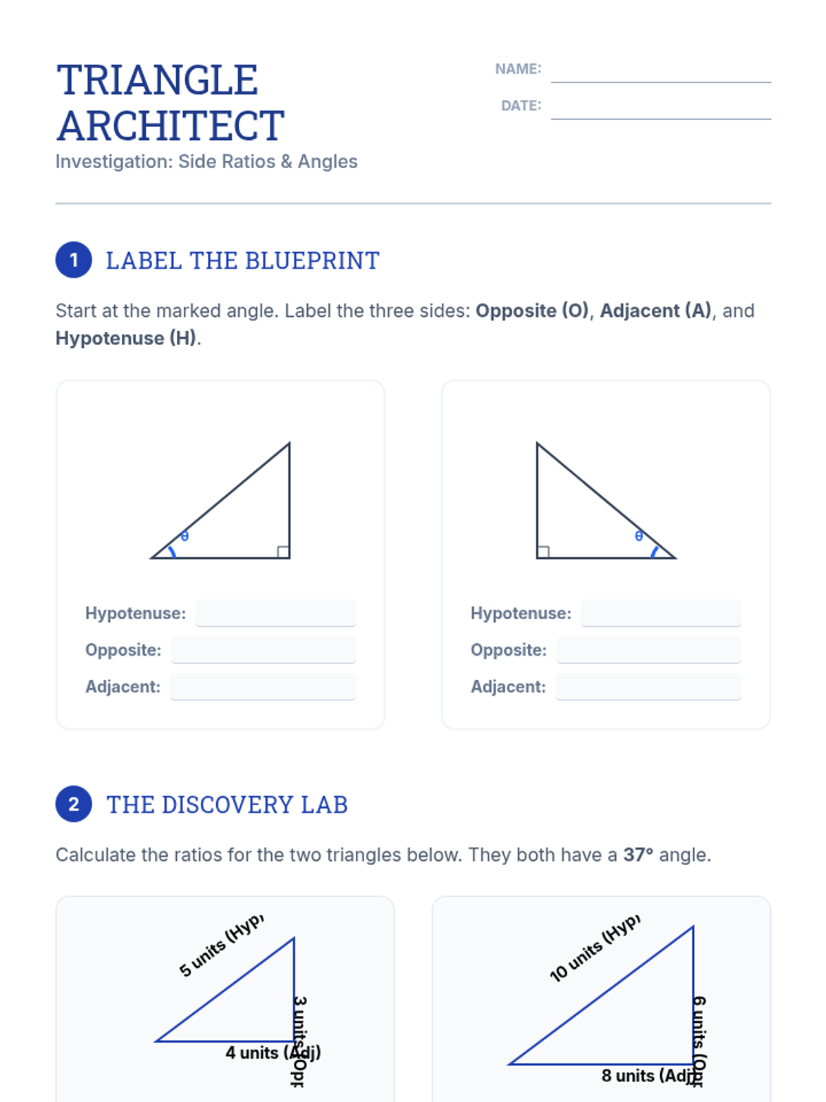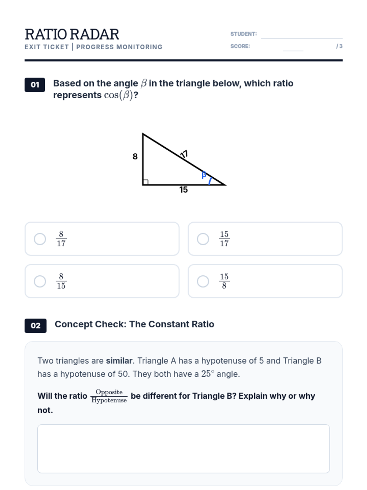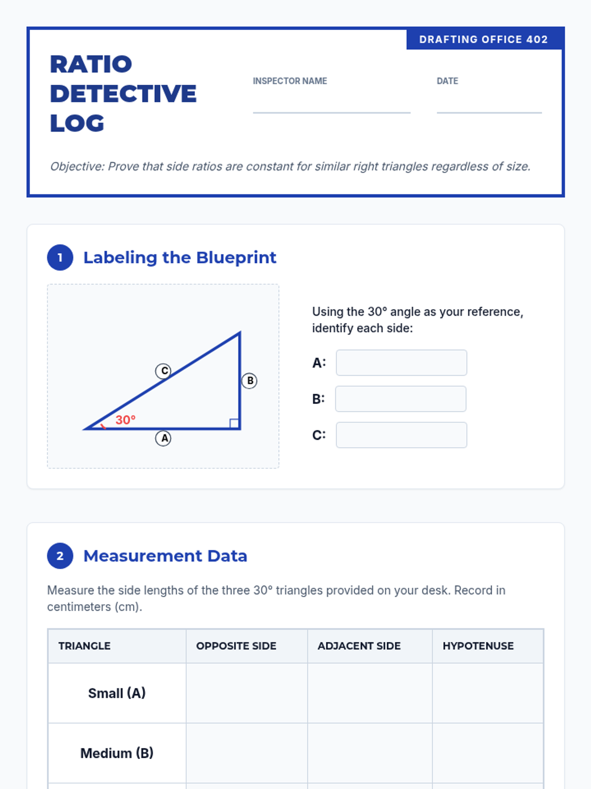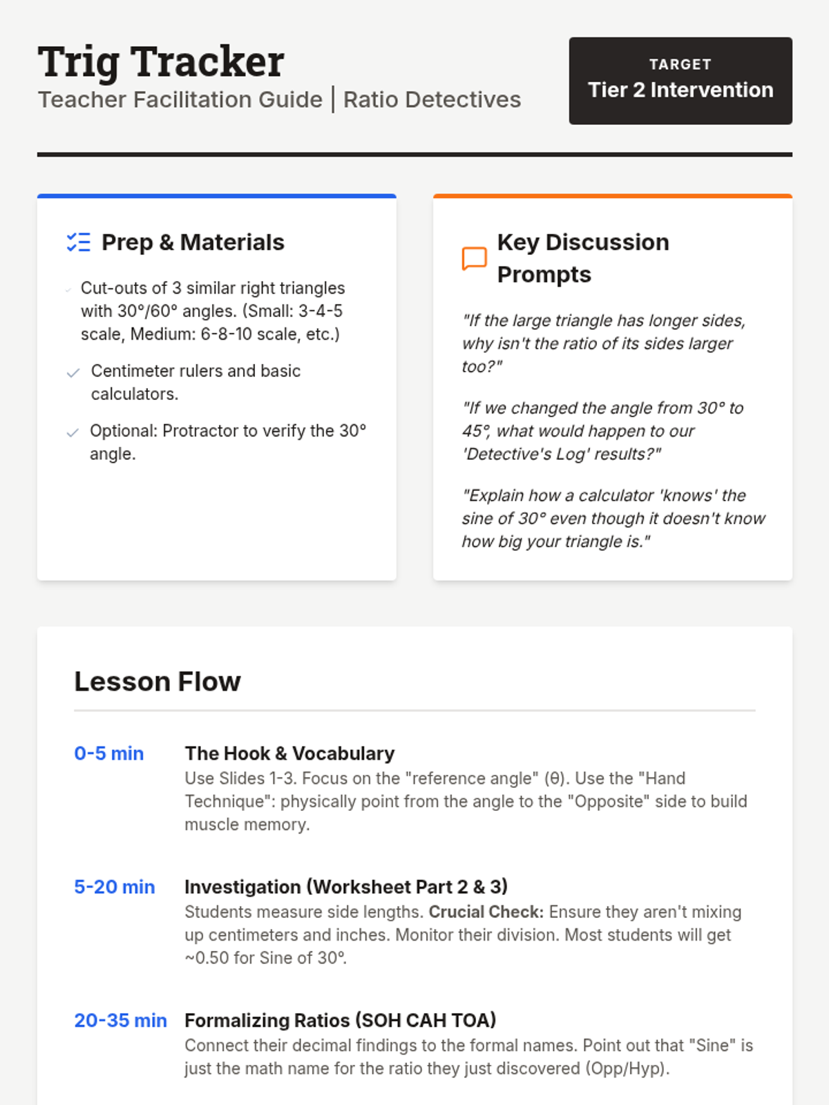 A targeted intervention lesson for Tier 2 students to discover trigonometric ratios (Sine, Cosine, Tangent) through hands-on measurement and comparison of similar right triangles. This lesson emphasizes the property that side ratios remain constant for specific angles regardless of triangle size.
