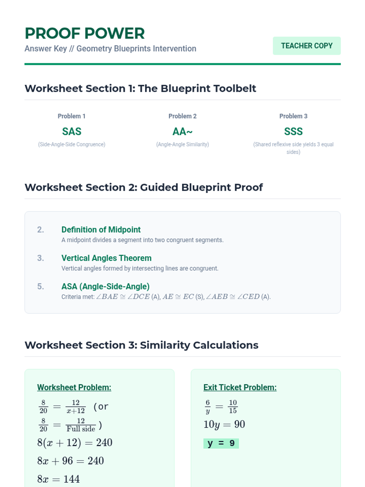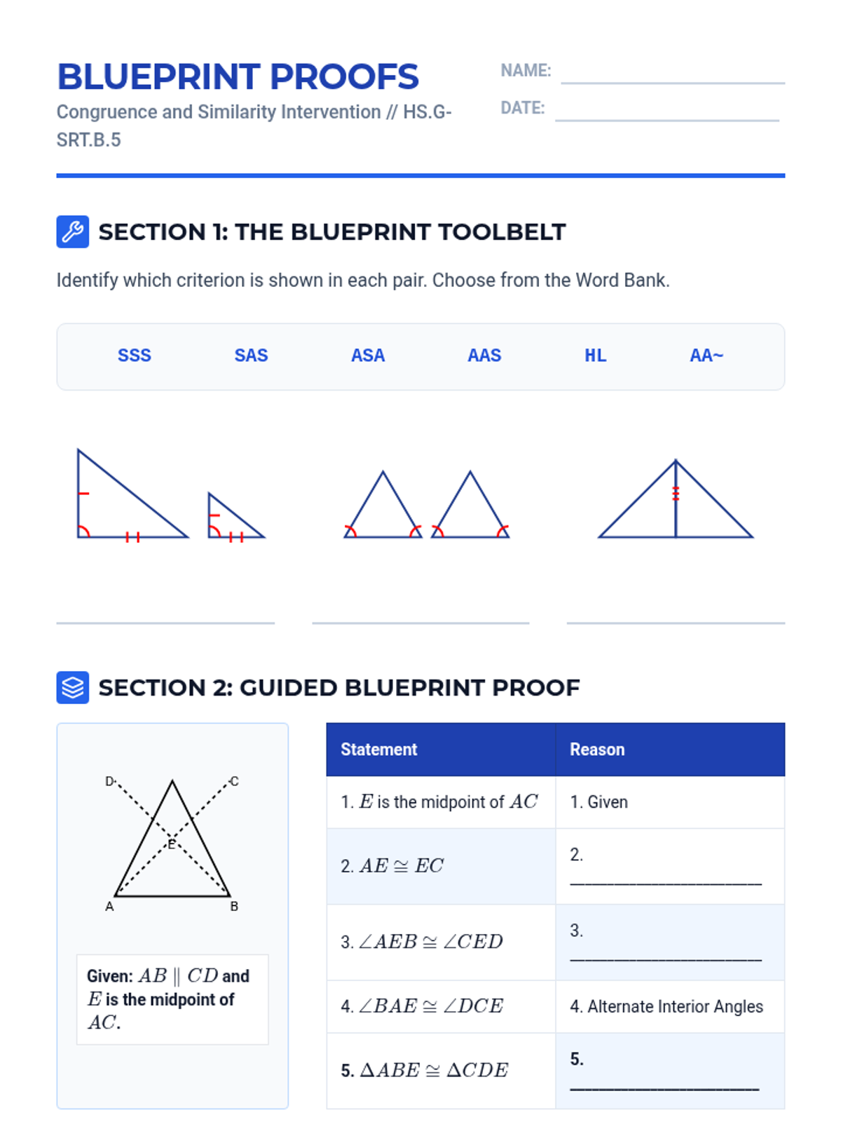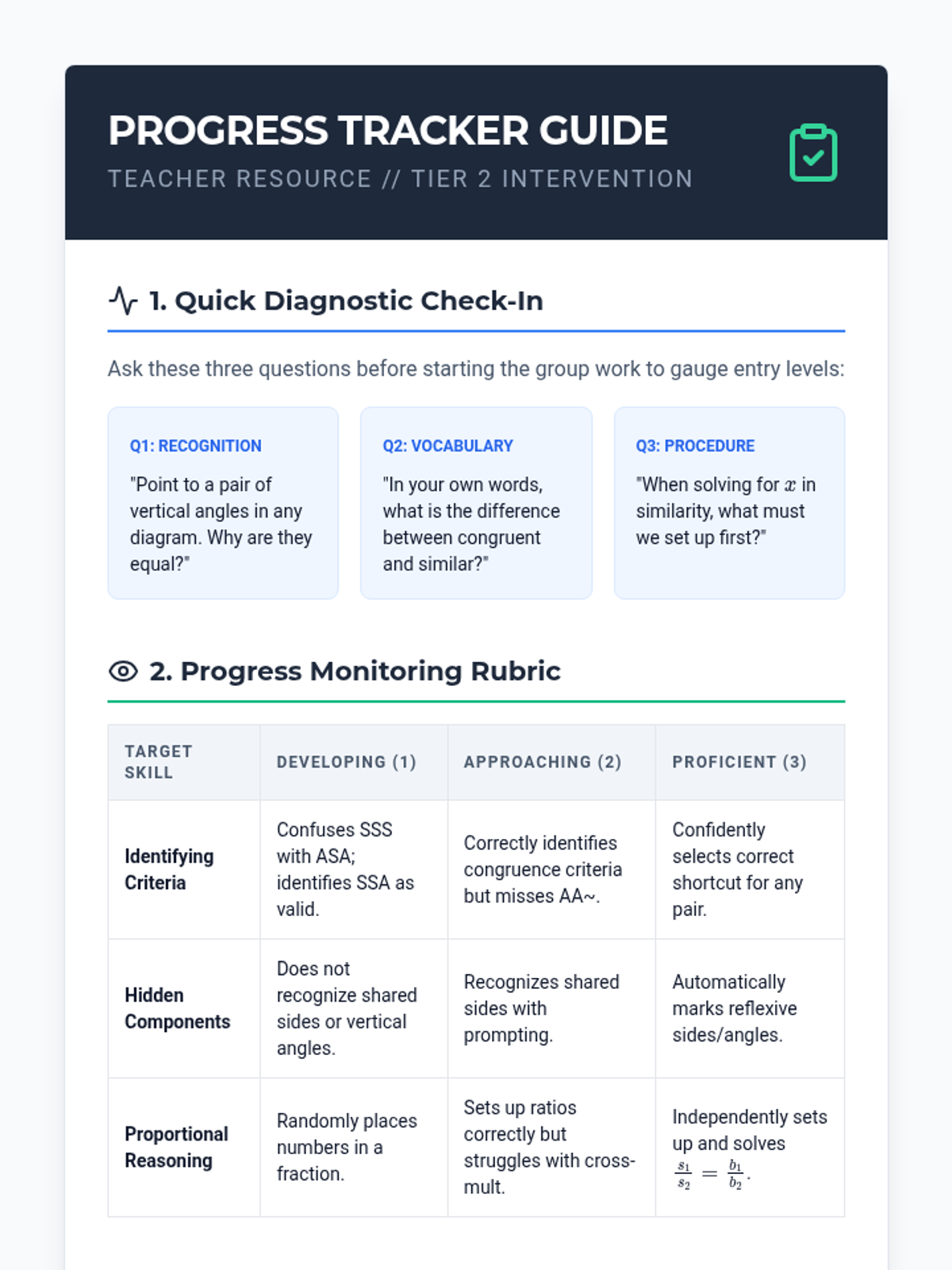 A Tier 2 intervention lesson focused on mastering congruence and similarity criteria through scaffolded proofs and real-world solving. Students will use SSS, SAS, ASA, AAS, HL, and similarity shortcuts to analyze geometric figures.