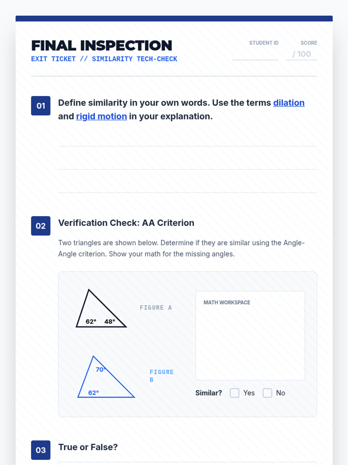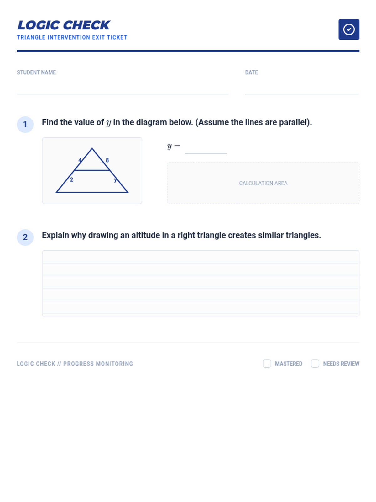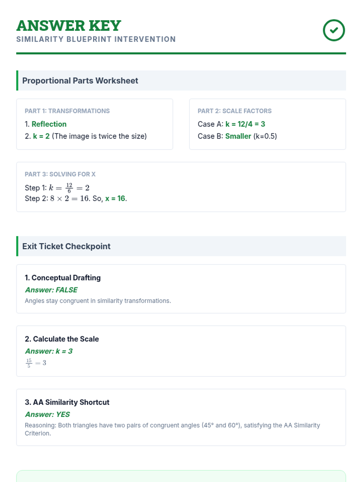 A Tier 2 intervention lesson focused on mastering congruence and similarity criteria through scaffolded proofs and real-world solving. Students will use SSS, SAS, ASA, AAS, HL, and similarity shortcuts to analyze geometric figures.