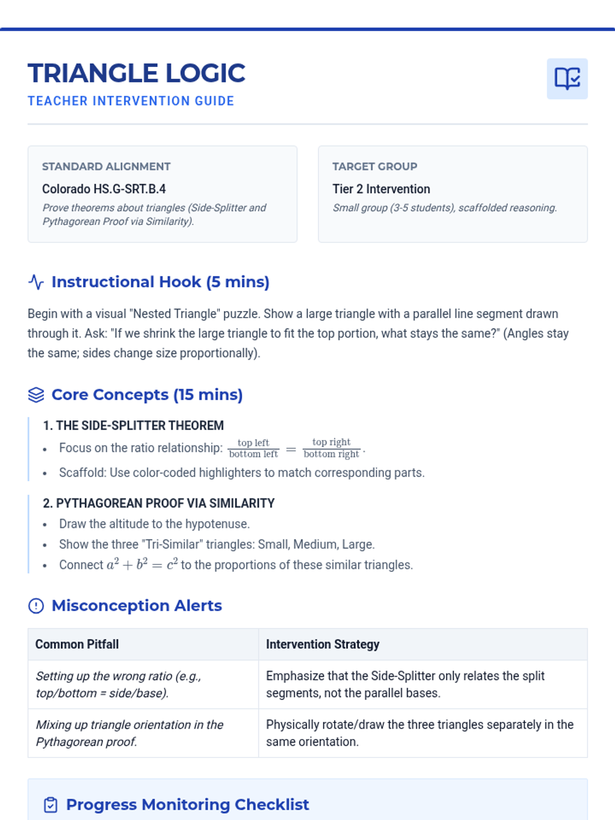 A targeted Tier 2 intervention lesson focusing on visual proofs for the Side-Splitter Theorem and the similarity-based proof of the Pythagorean Theorem, designed for struggling high school learners.