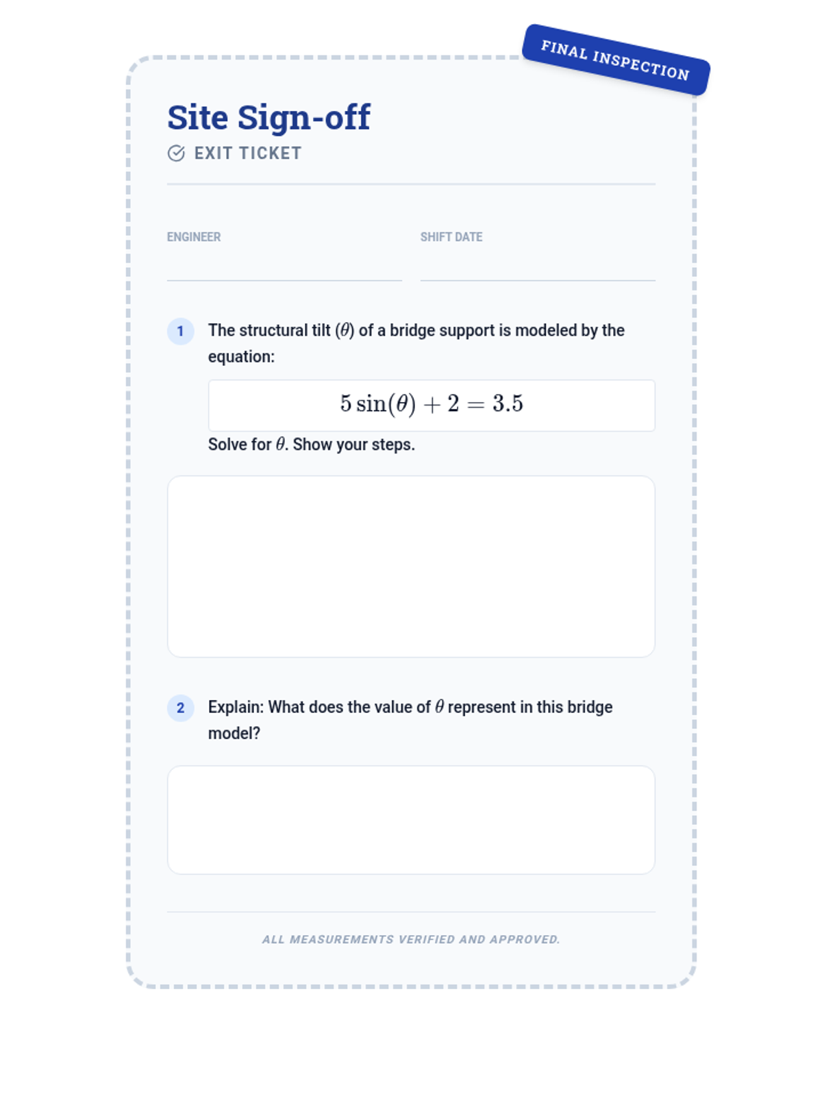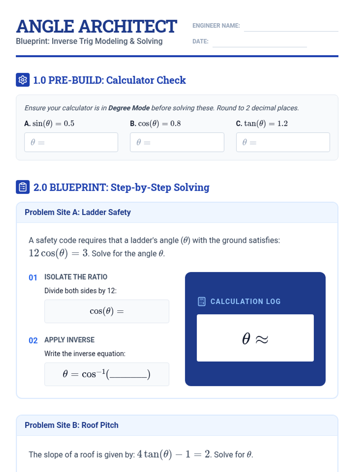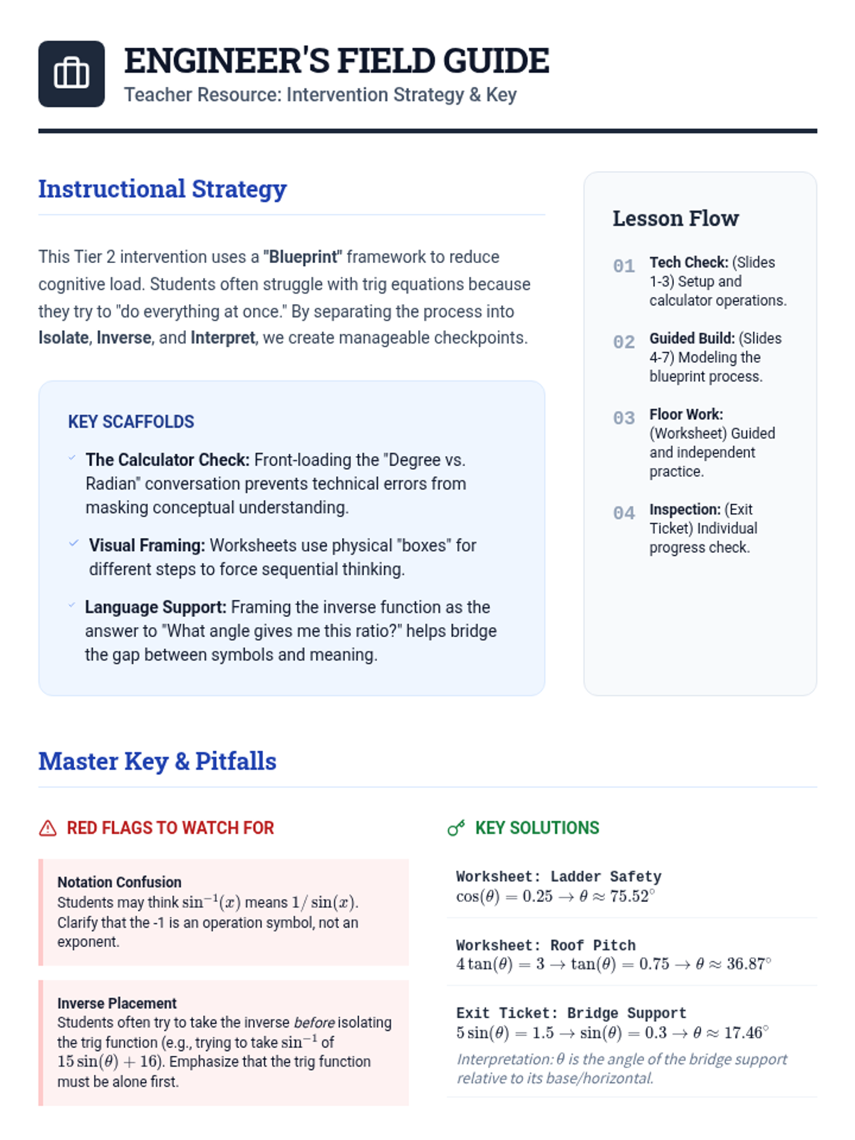 A targeted intervention lesson for high school students focused on solving trigonometric equations using inverse functions. This lesson uses a scaffolded 'blueprint' approach to help students navigate calculator settings, step-by-step equation solving, and interpreting results in real-world modeling contexts.