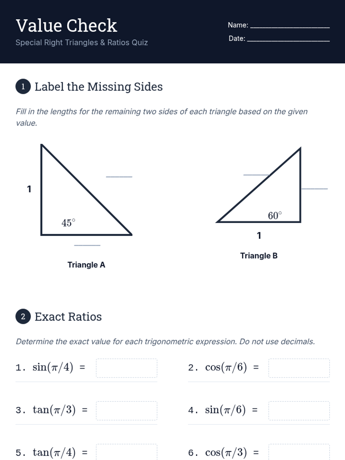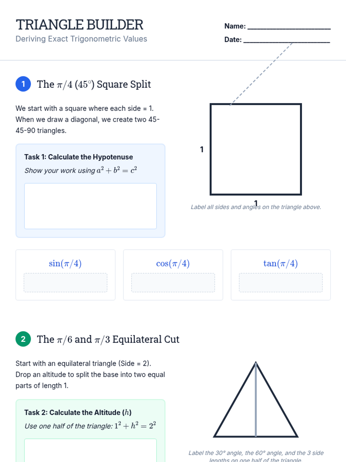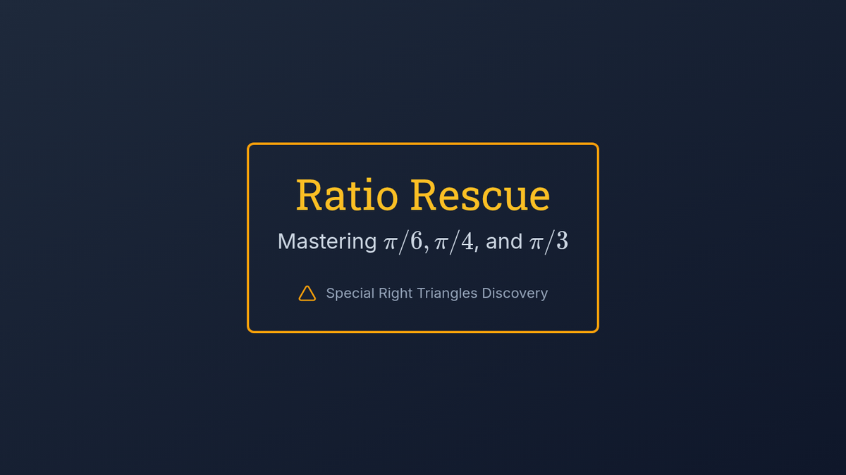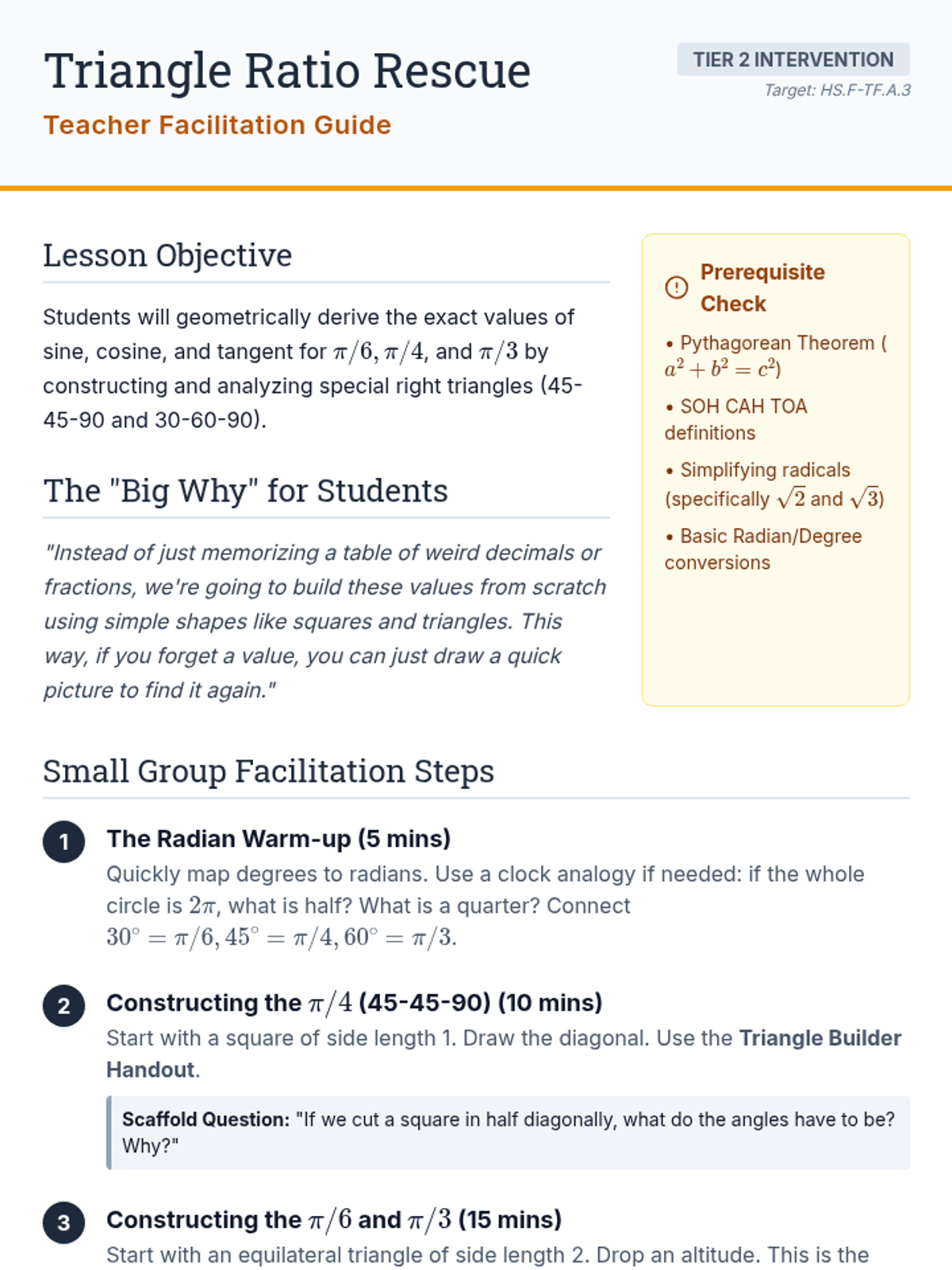 A targeted intervention lesson for small groups to geometrically derive trigonometric ratios for pi/3, pi/4, and pi/6 using special right triangles. This lesson focuses on conceptual understanding through construction and pattern recognition.