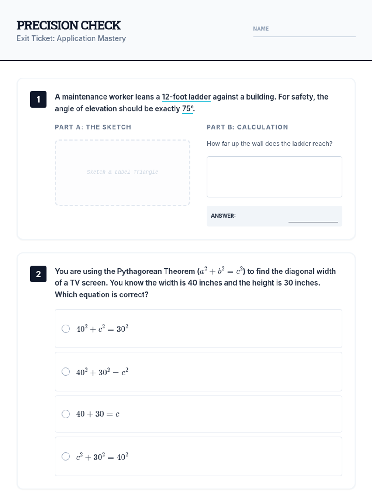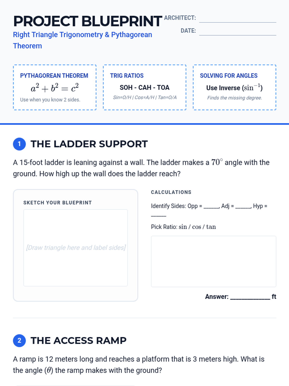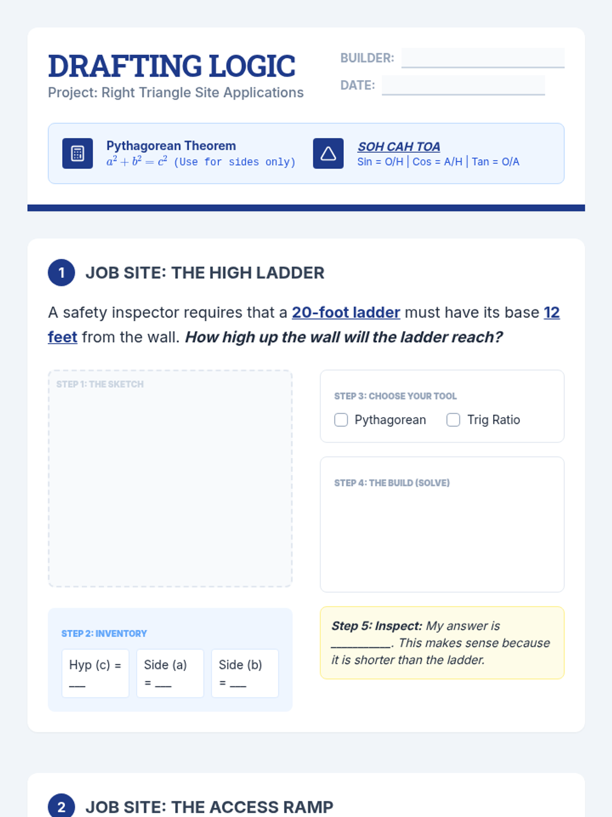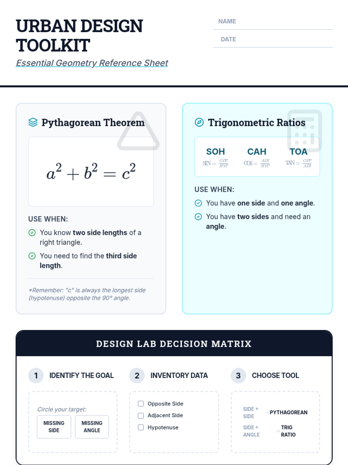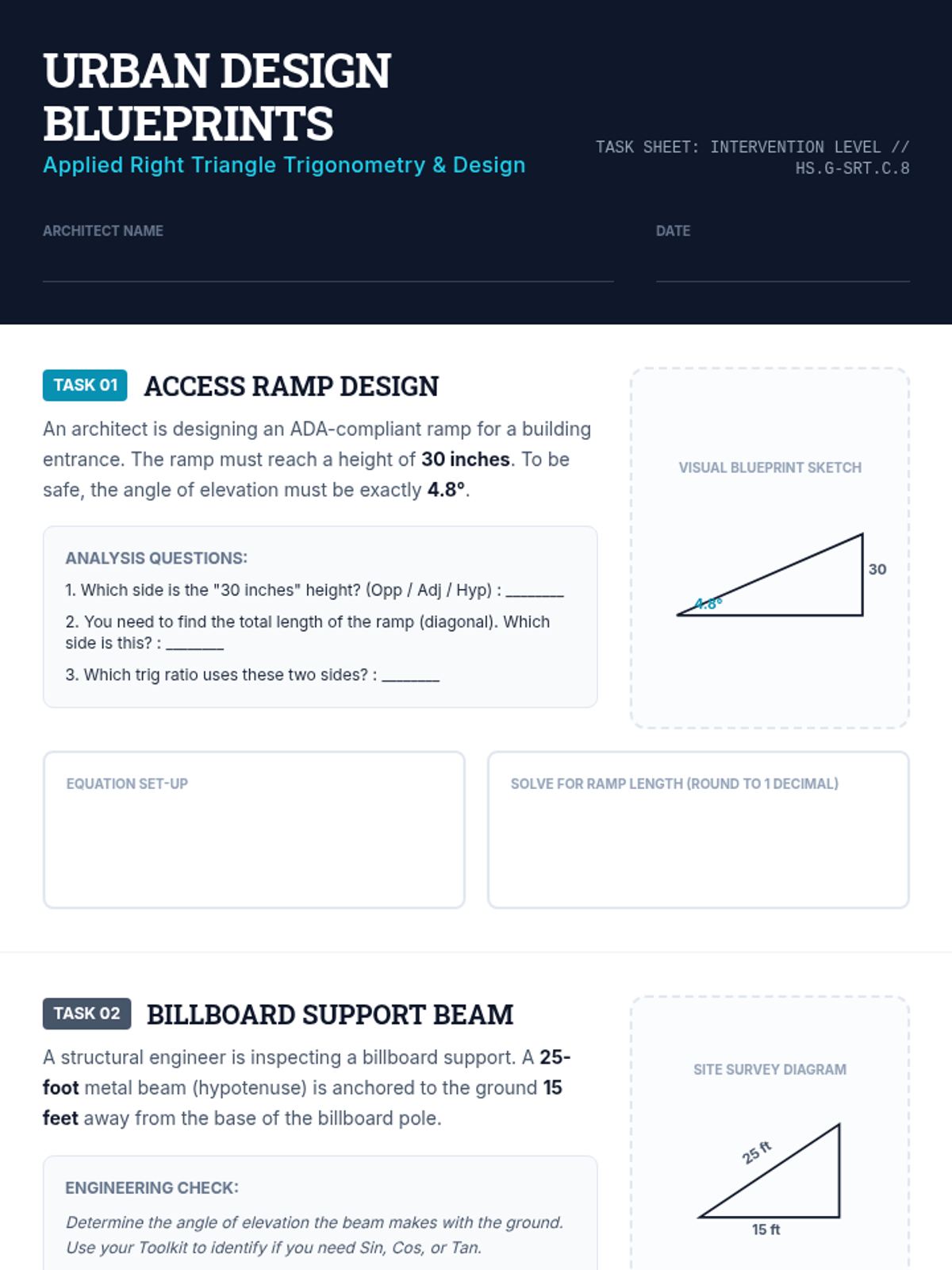 A Tier 2 intervention lesson focused on applying right triangle trigonometry and the Pythagorean Theorem to real-world design and measurement challenges using scaffolded graphic organizers.