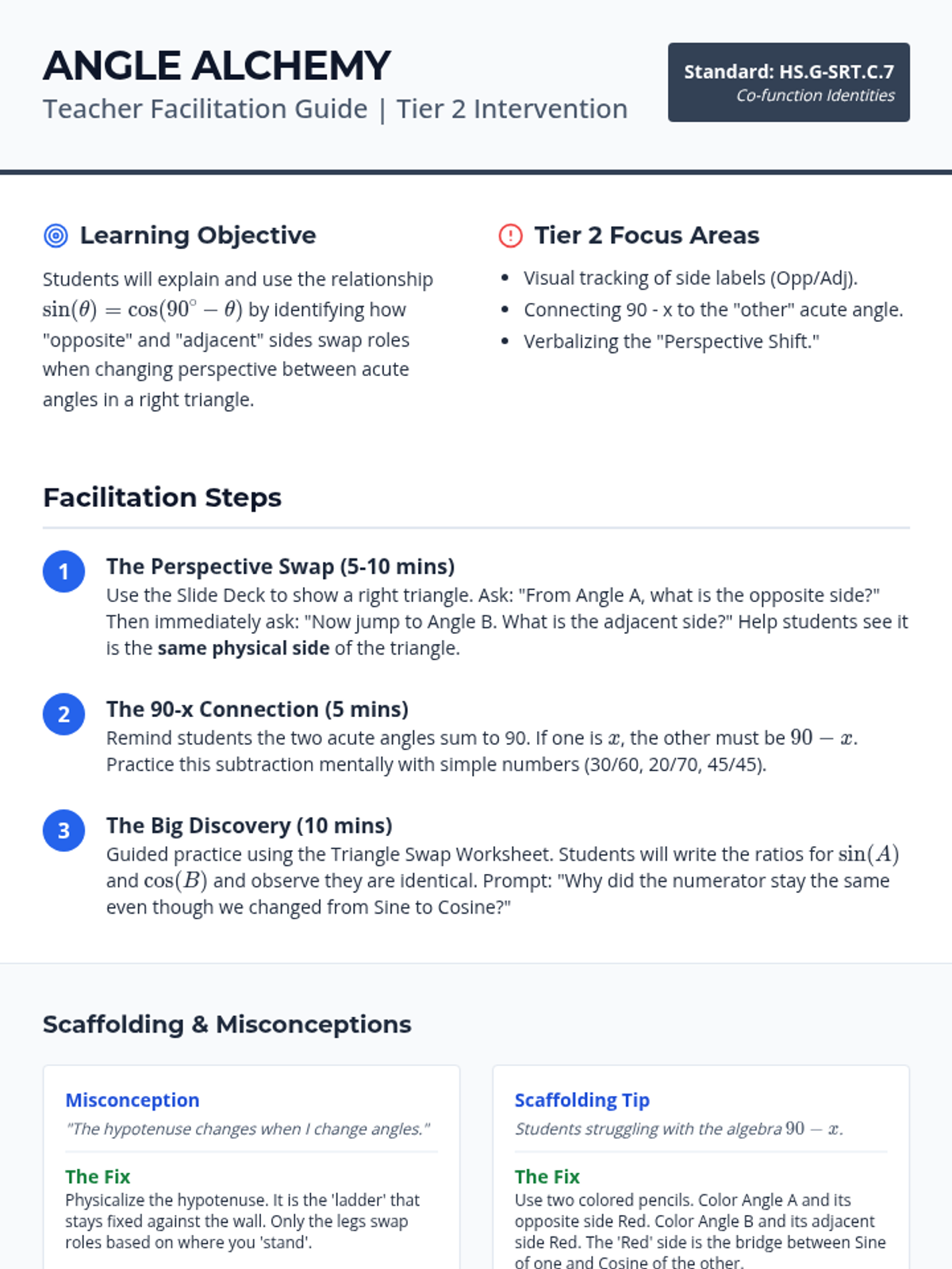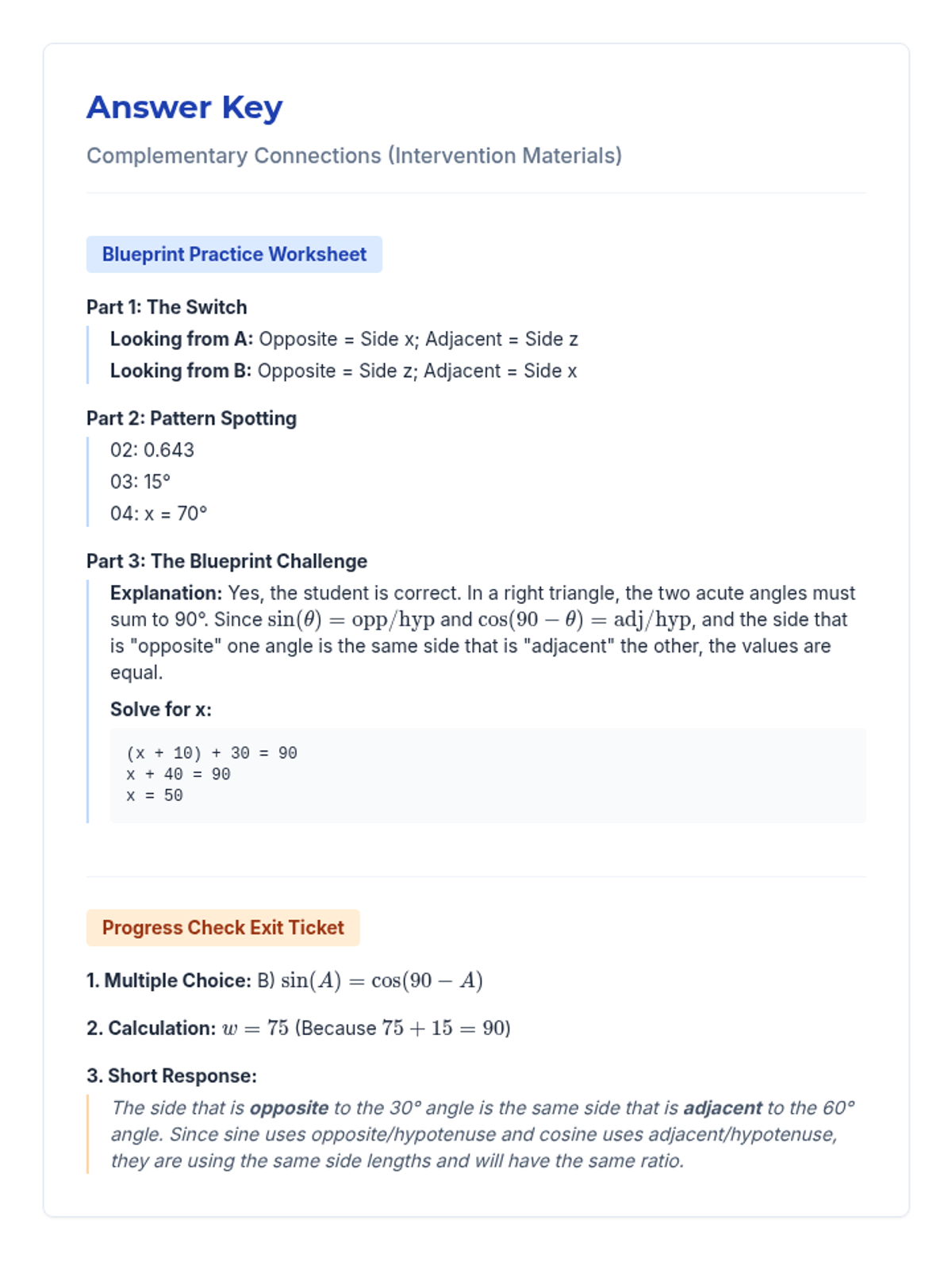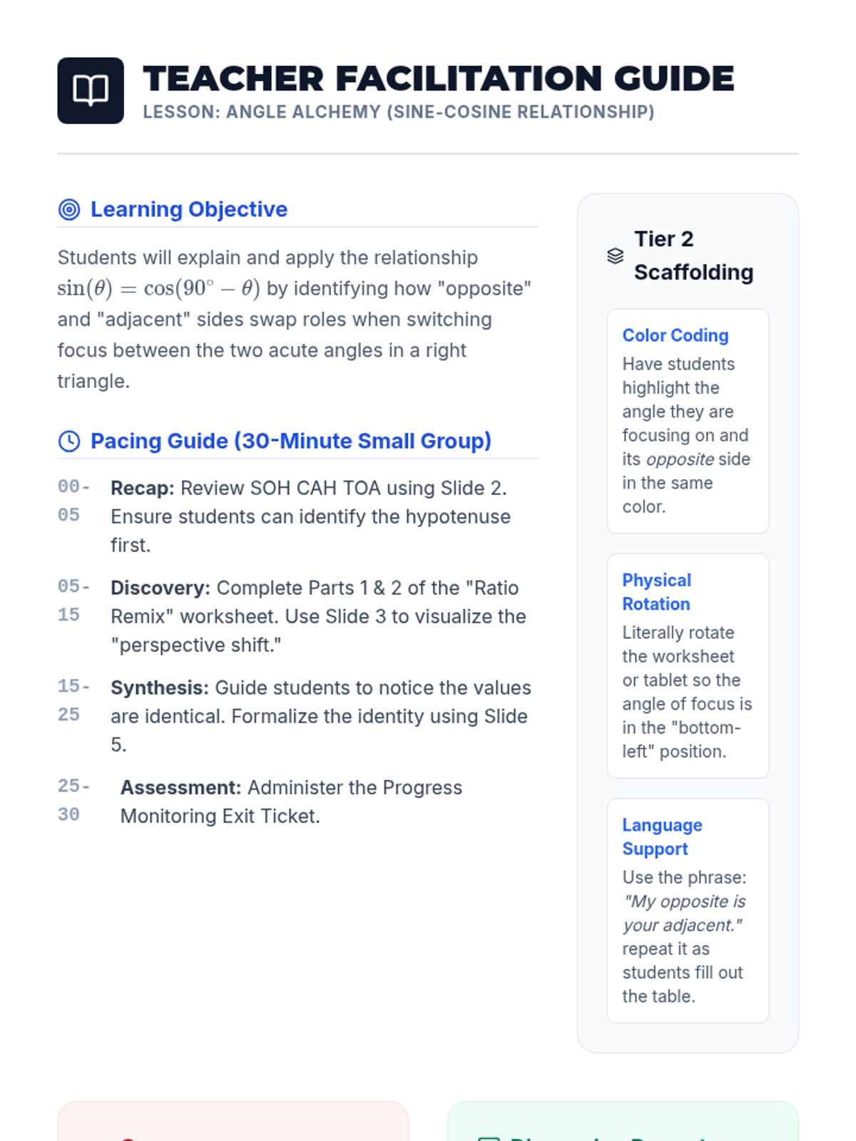 A targeted intervention lesson focused on the relationship between sine and cosine in complementary angles. Designed for Tier 2 small group support with scaffolded visual aids and progress monitoring.