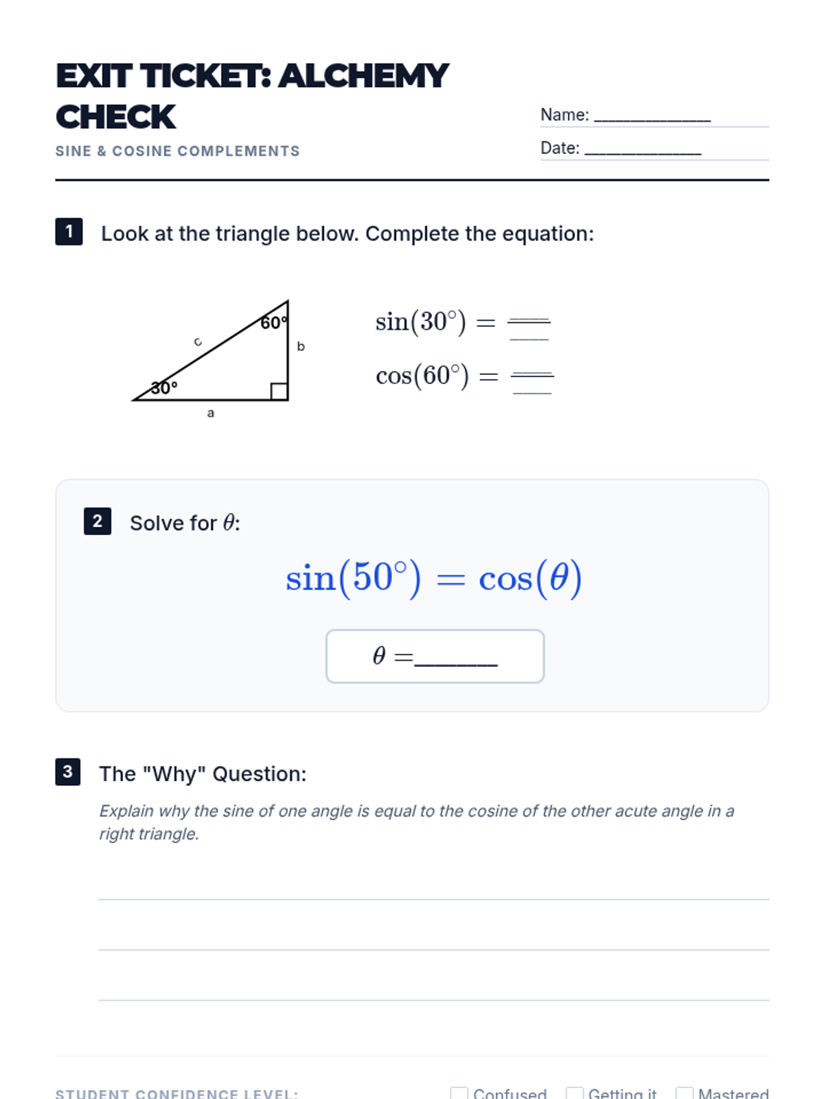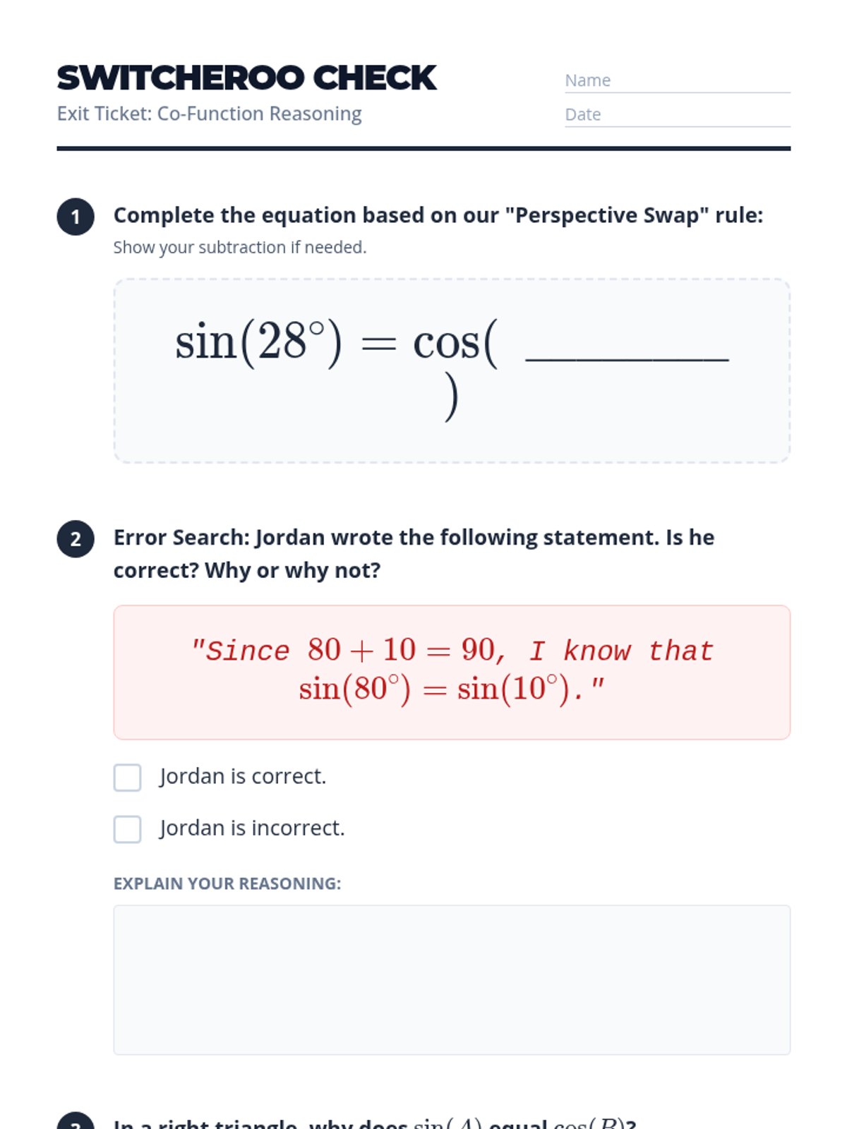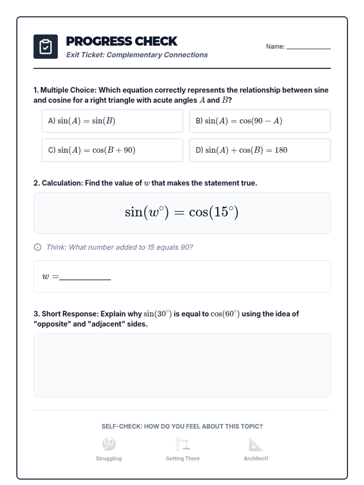 A targeted intervention lesson focused on the relationship between sine and cosine in complementary angles. Designed for Tier 2 small group support with scaffolded visual aids and progress monitoring.