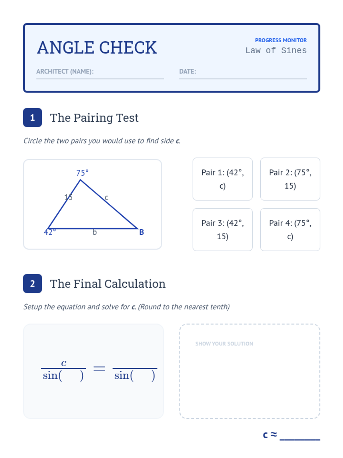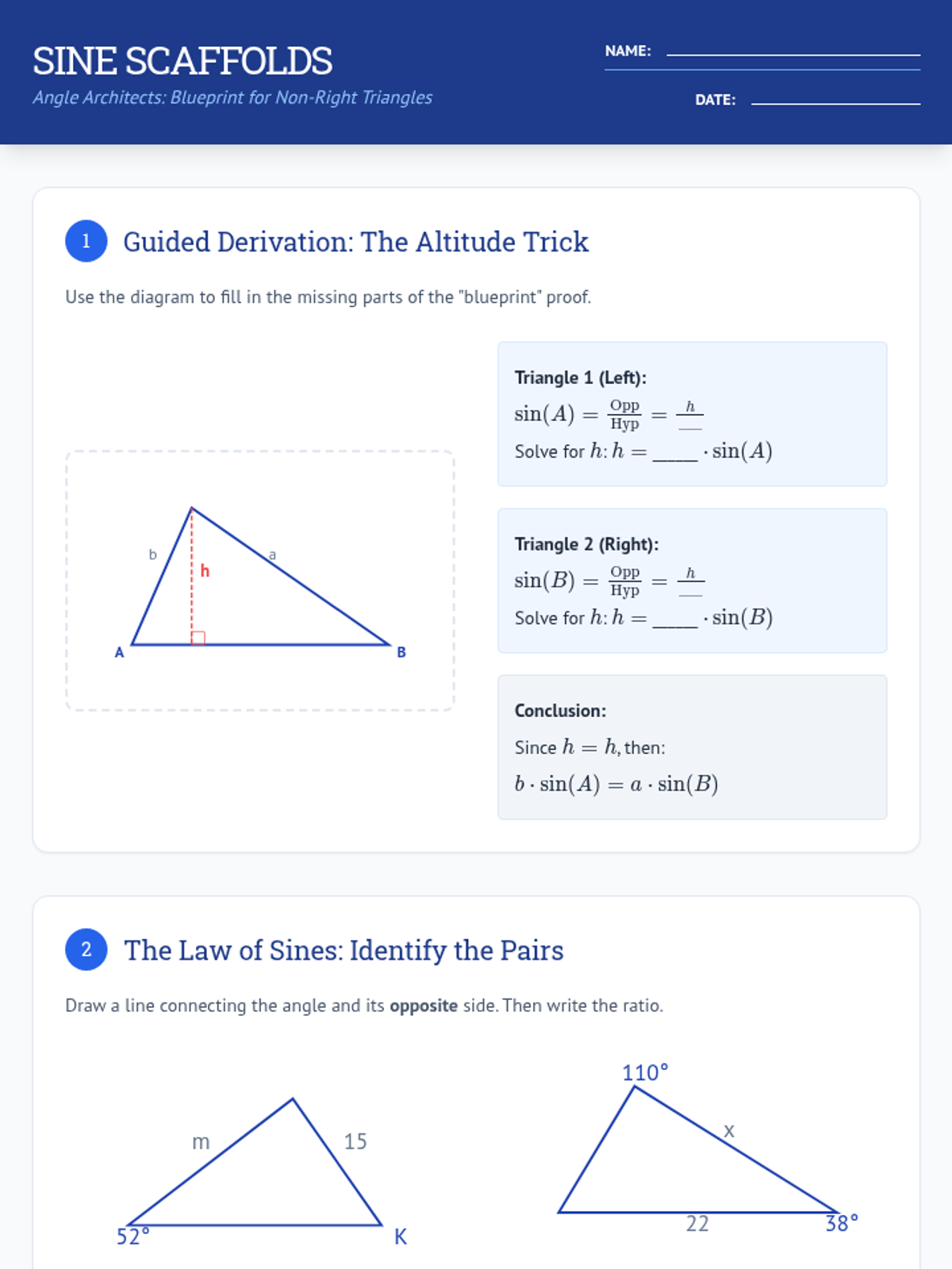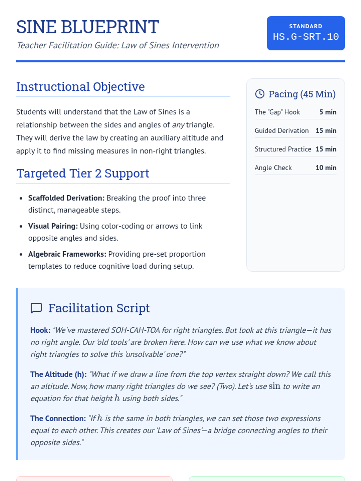 A targeted Tier 2 intervention lesson for High School Geometry students to derive and apply the Law of Sines through scaffolded proofs and structured practice.