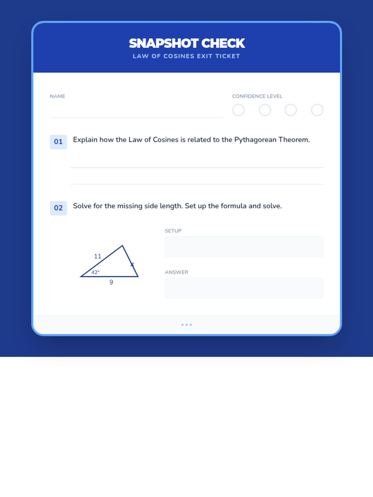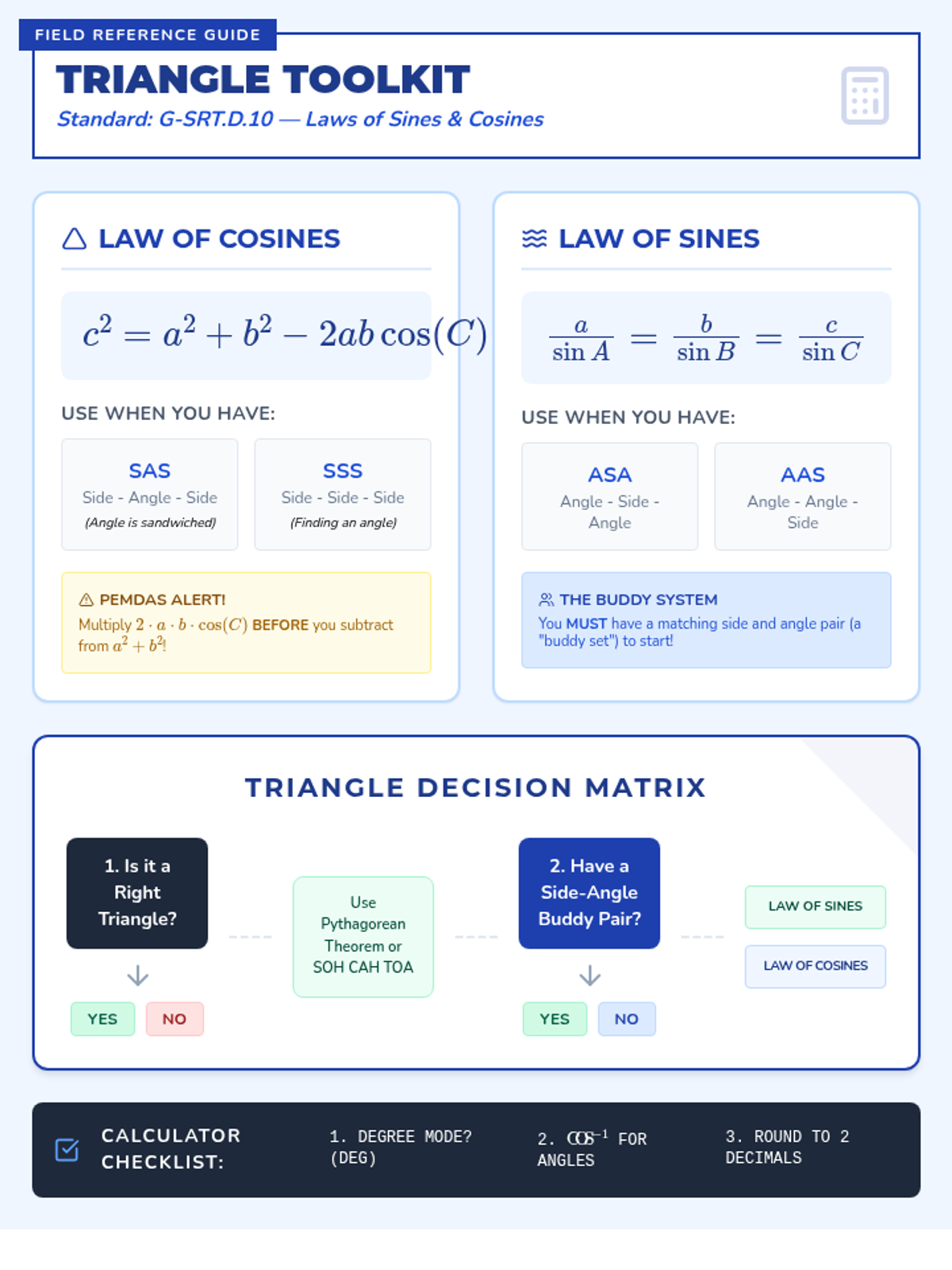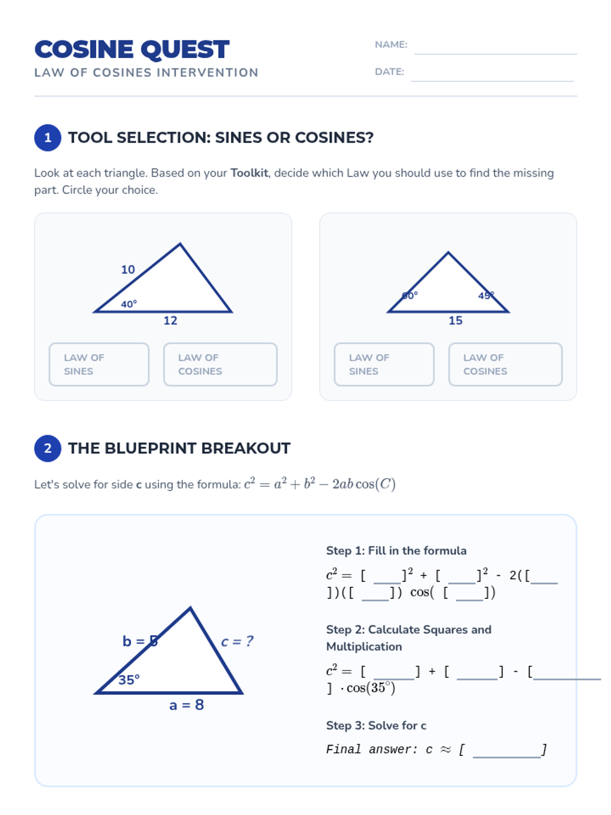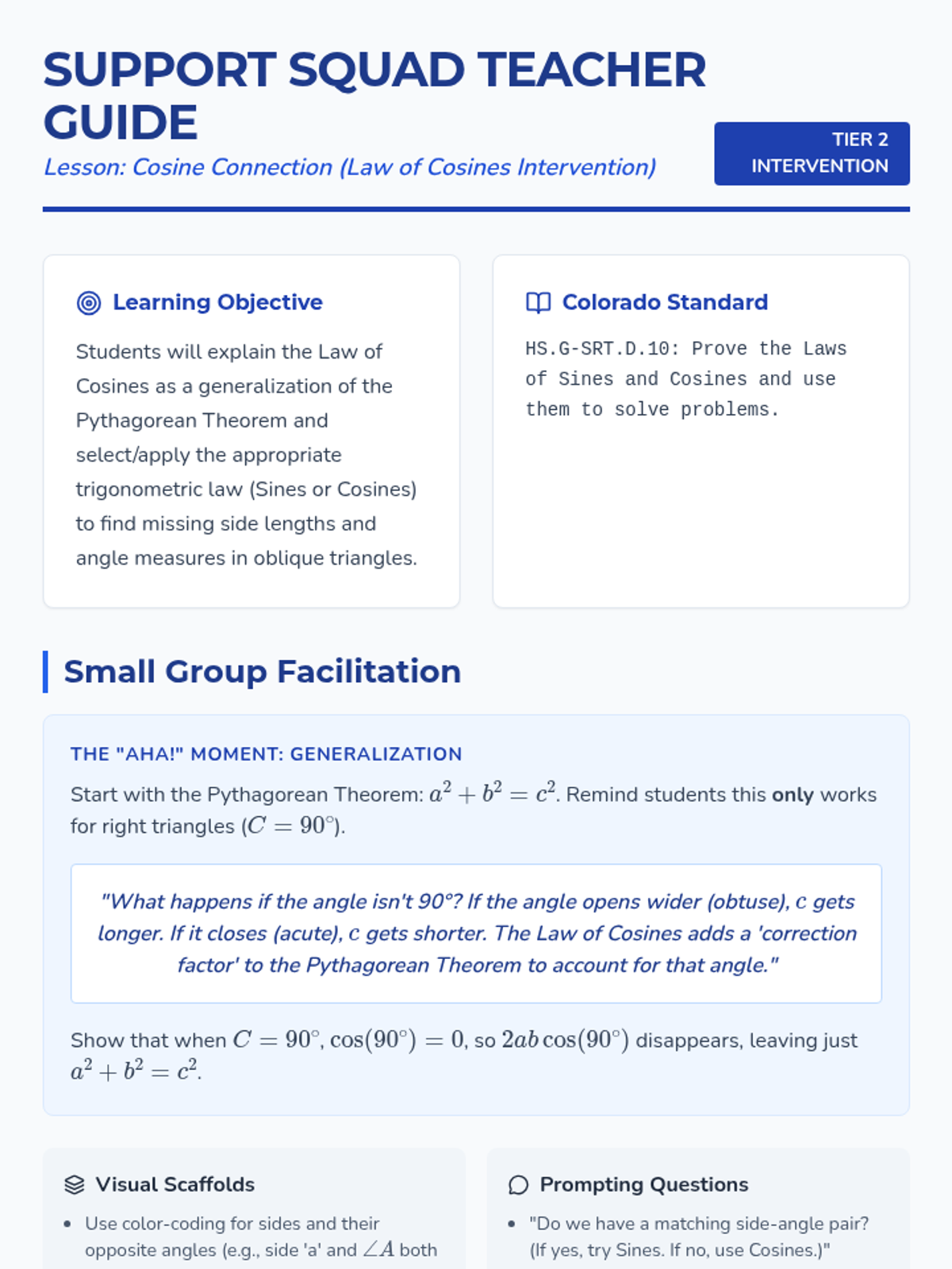 A targeted intervention lesson designed to help students connect the Law of Cosines to the Pythagorean Theorem and apply trigonometric laws to solve oblique triangles. Features visual scaffolds, step-by-step worked examples, and decision-making tools for choosing between laws.