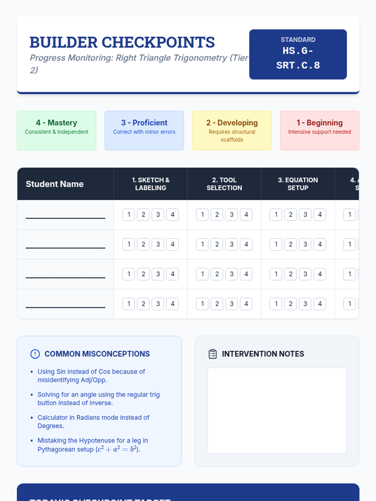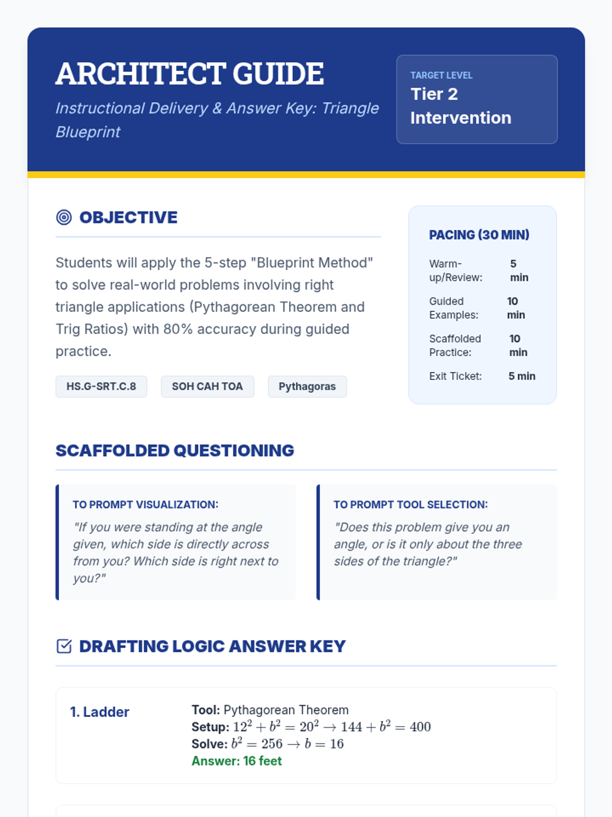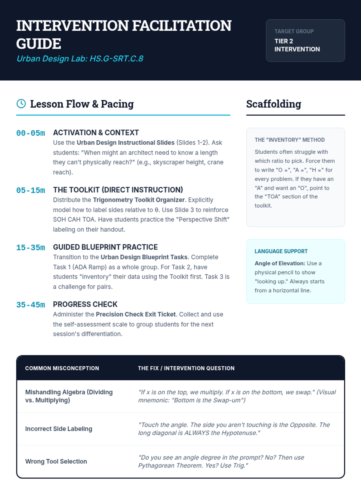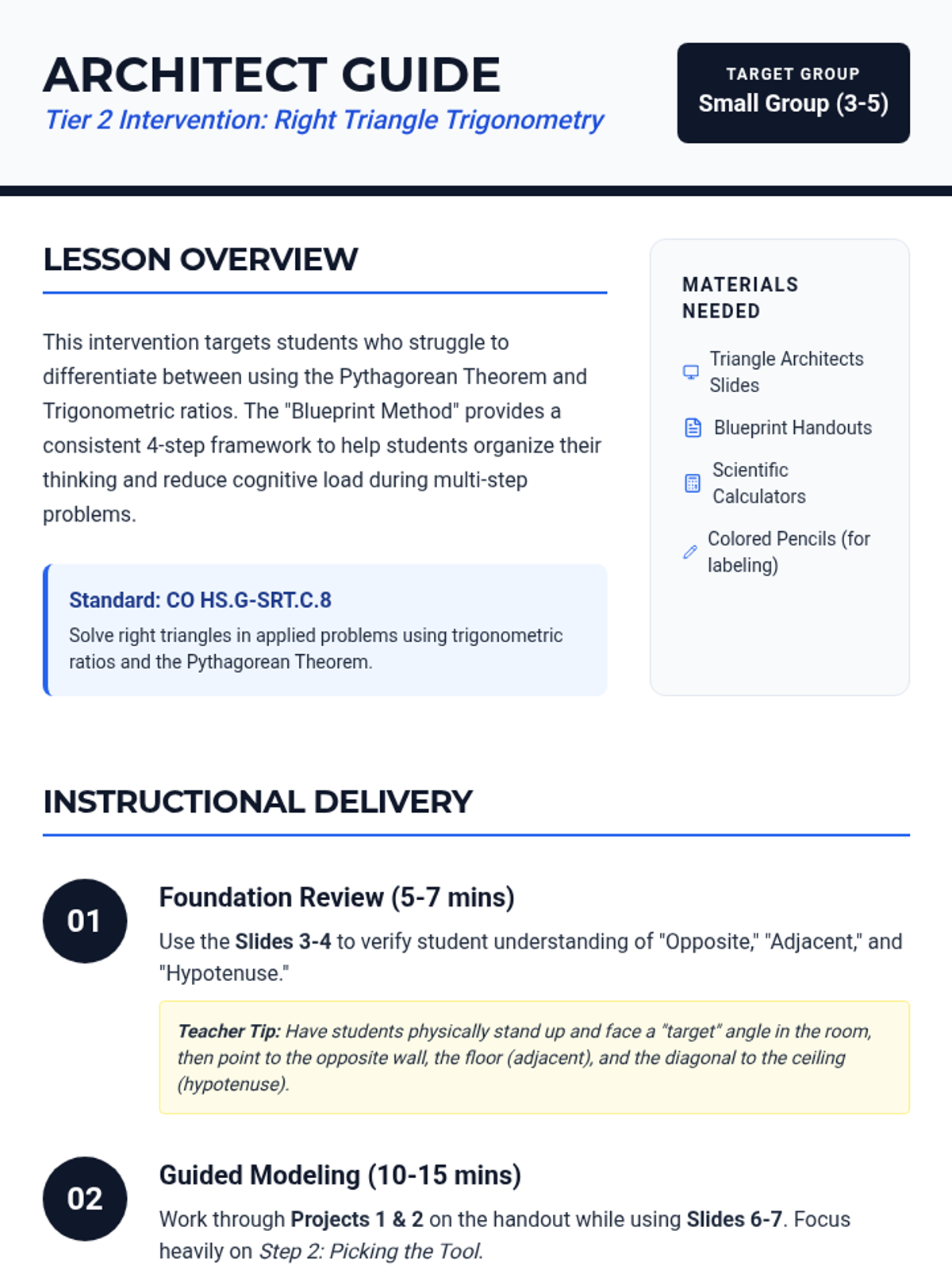 A targeted Tier 2 intervention lesson focusing on using trigonometry and the Pythagorean Theorem to solve real-world right triangle problems with scaffolded support.