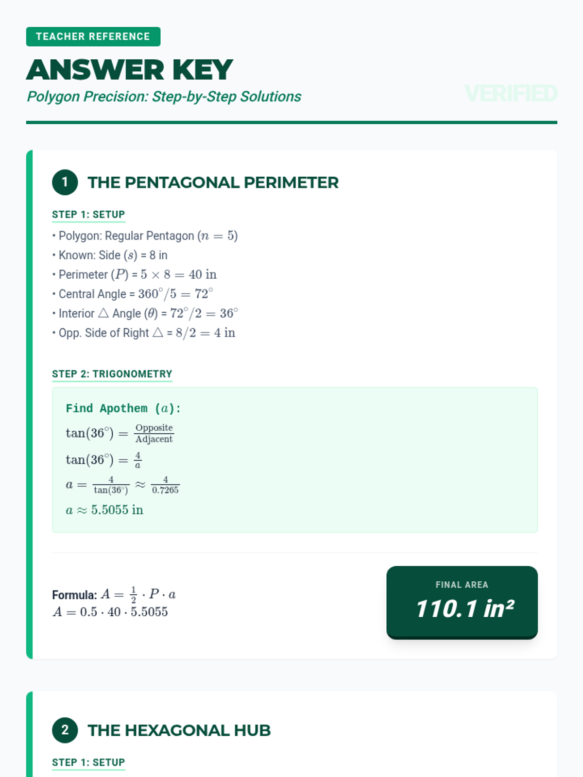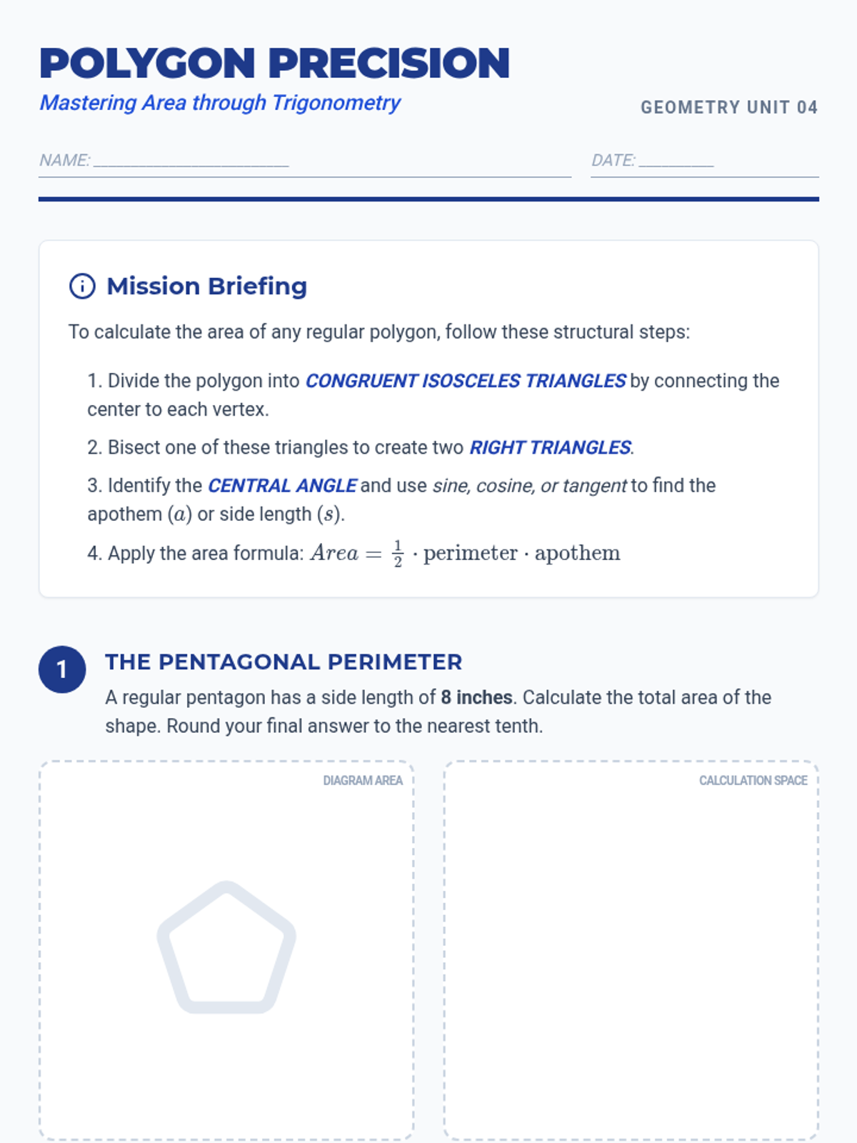 A lesson focused on calculating the area of regular polygons by decomposing them into triangles and applying trigonometric ratios to find missing dimensions.