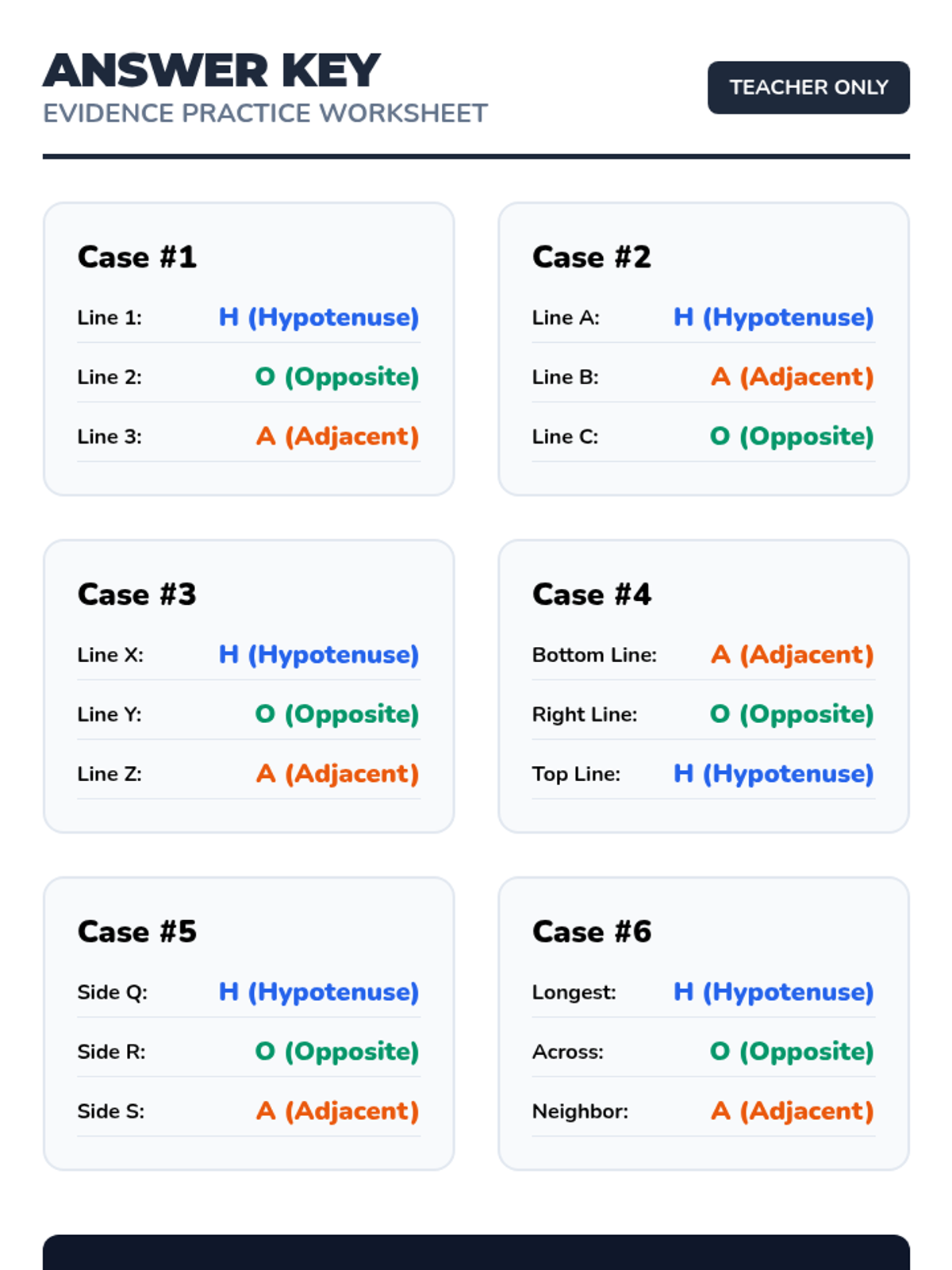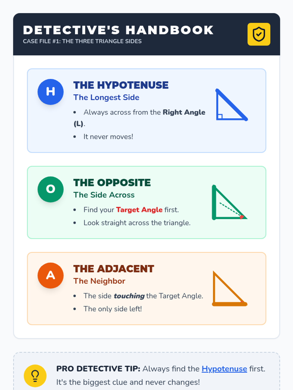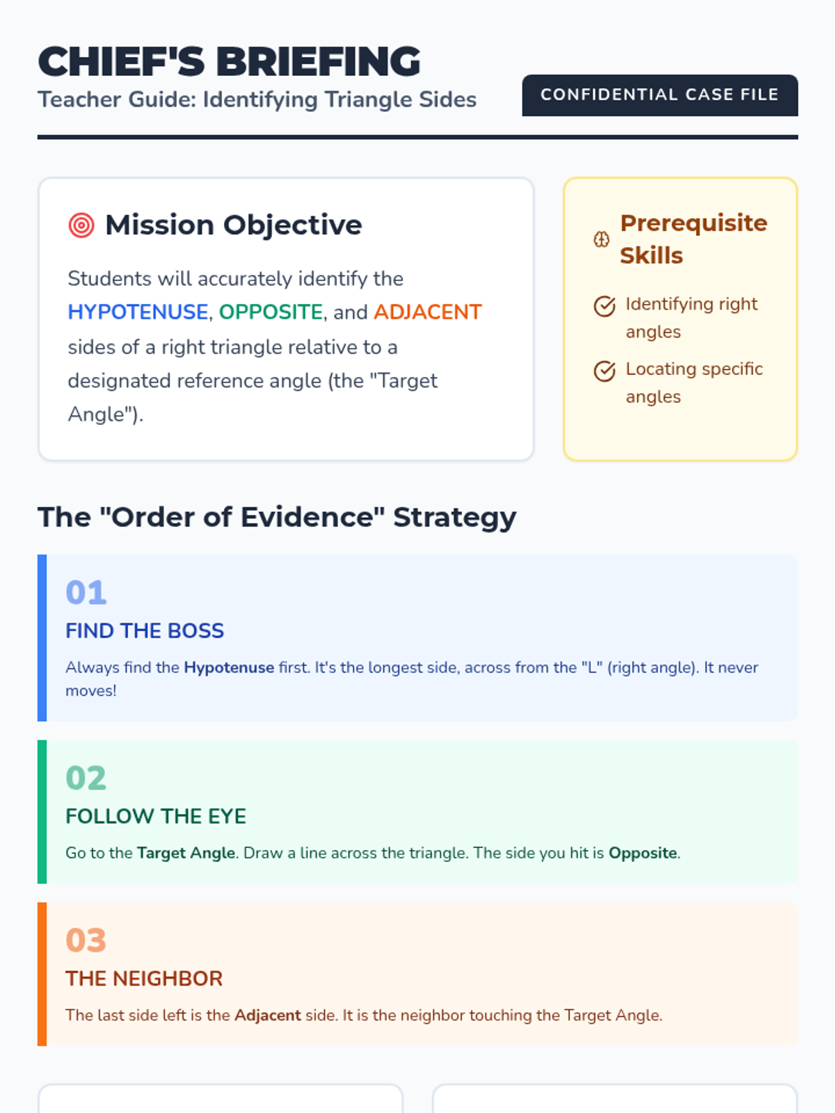 A foundational geometry lesson focused on identifying the three sides of a right triangle (hypotenuse, opposite, and adjacent) relative to a reference angle, designed for cross-categorical special education settings with high visual support.