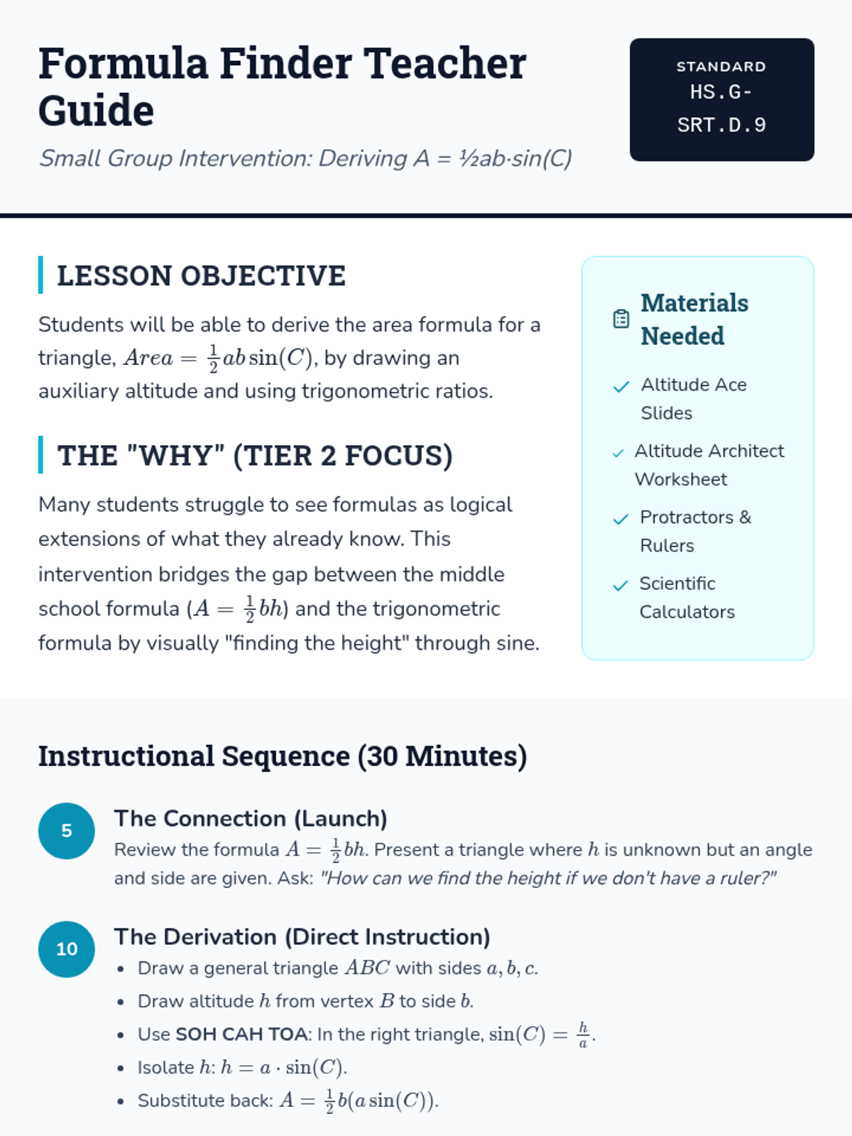 A targeted intervention lesson focused on deriving the triangle area formula using trigonometry and auxiliary altitudes, specifically designed for Tier 2 small group support.