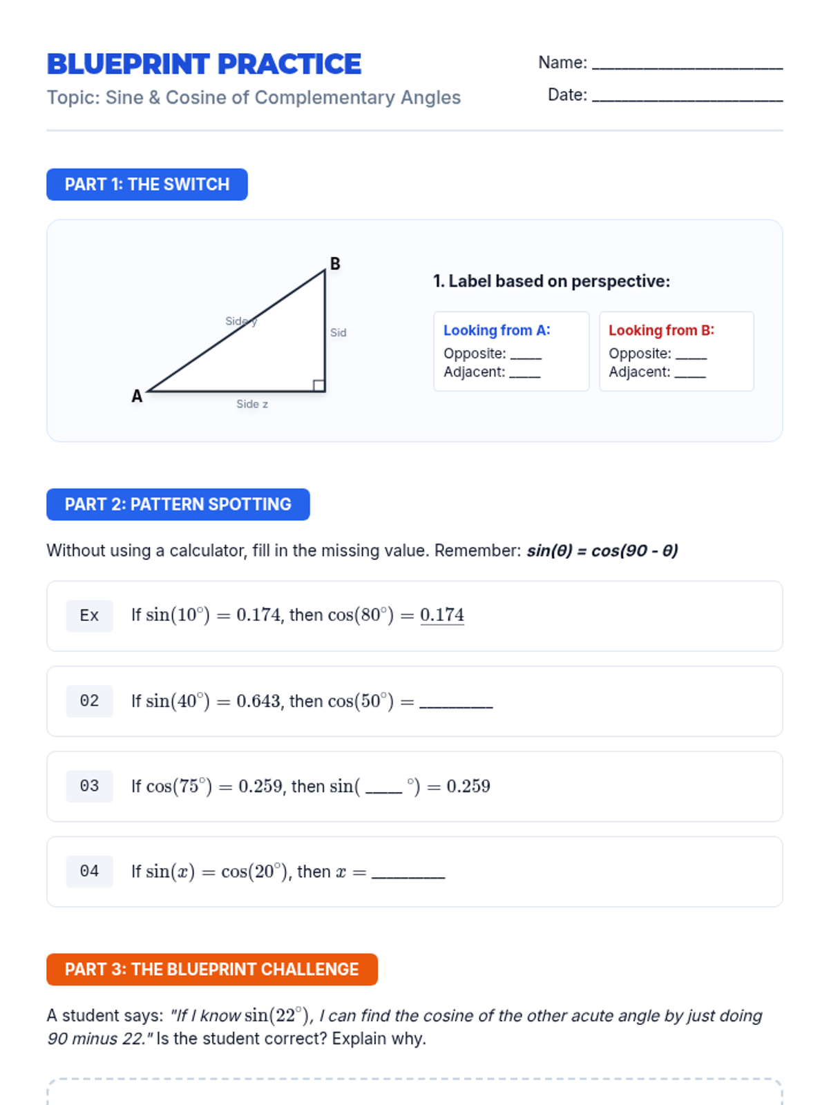 A Tier 2 intervention lesson focusing on the complementary relationship between sine and cosine using structured discovery and numerical patterns. Students will move from calculating ratios to identifying the $\sin(\theta) = \cos(90^\circ - \theta)$ identity.