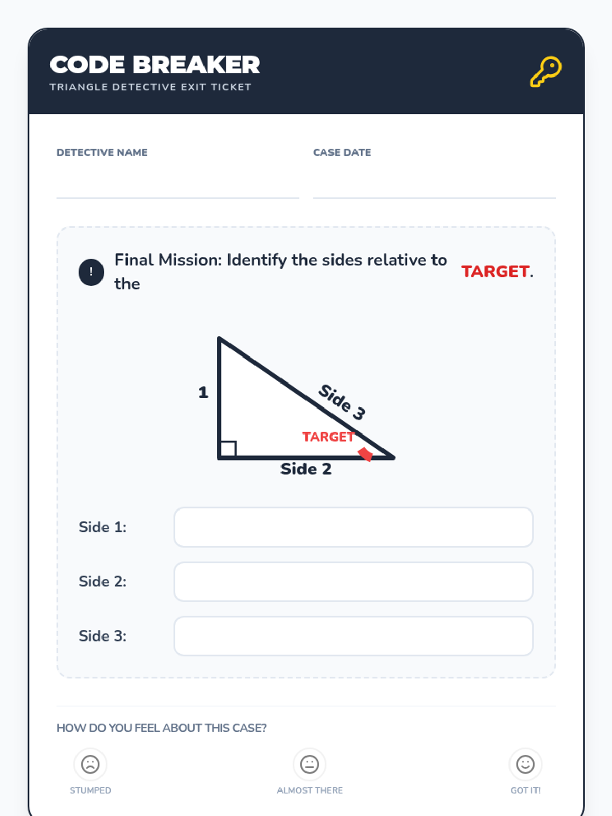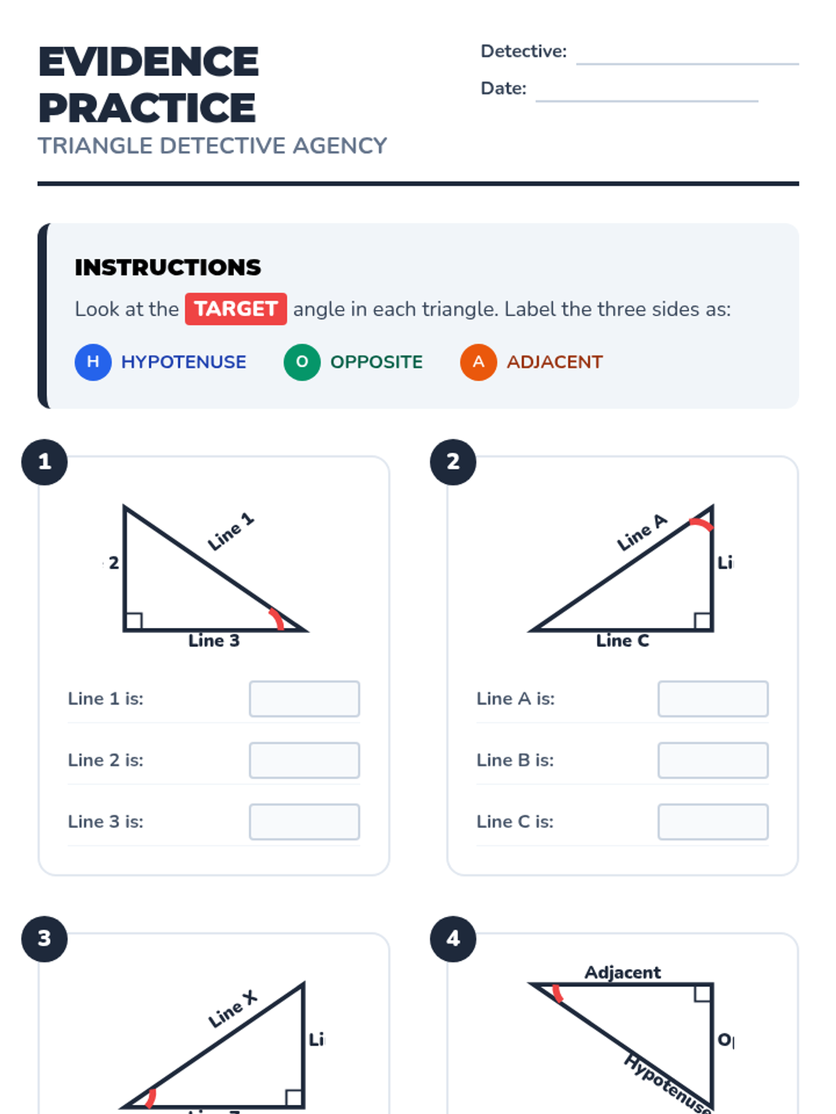 A targeted intervention lesson for Tier 2 students to discover trigonometric ratios (Sine, Cosine, Tangent) through hands-on measurement and comparison of similar right triangles. This lesson emphasizes the property that side ratios remain constant for specific angles regardless of triangle size.