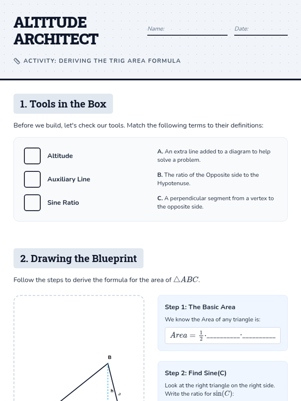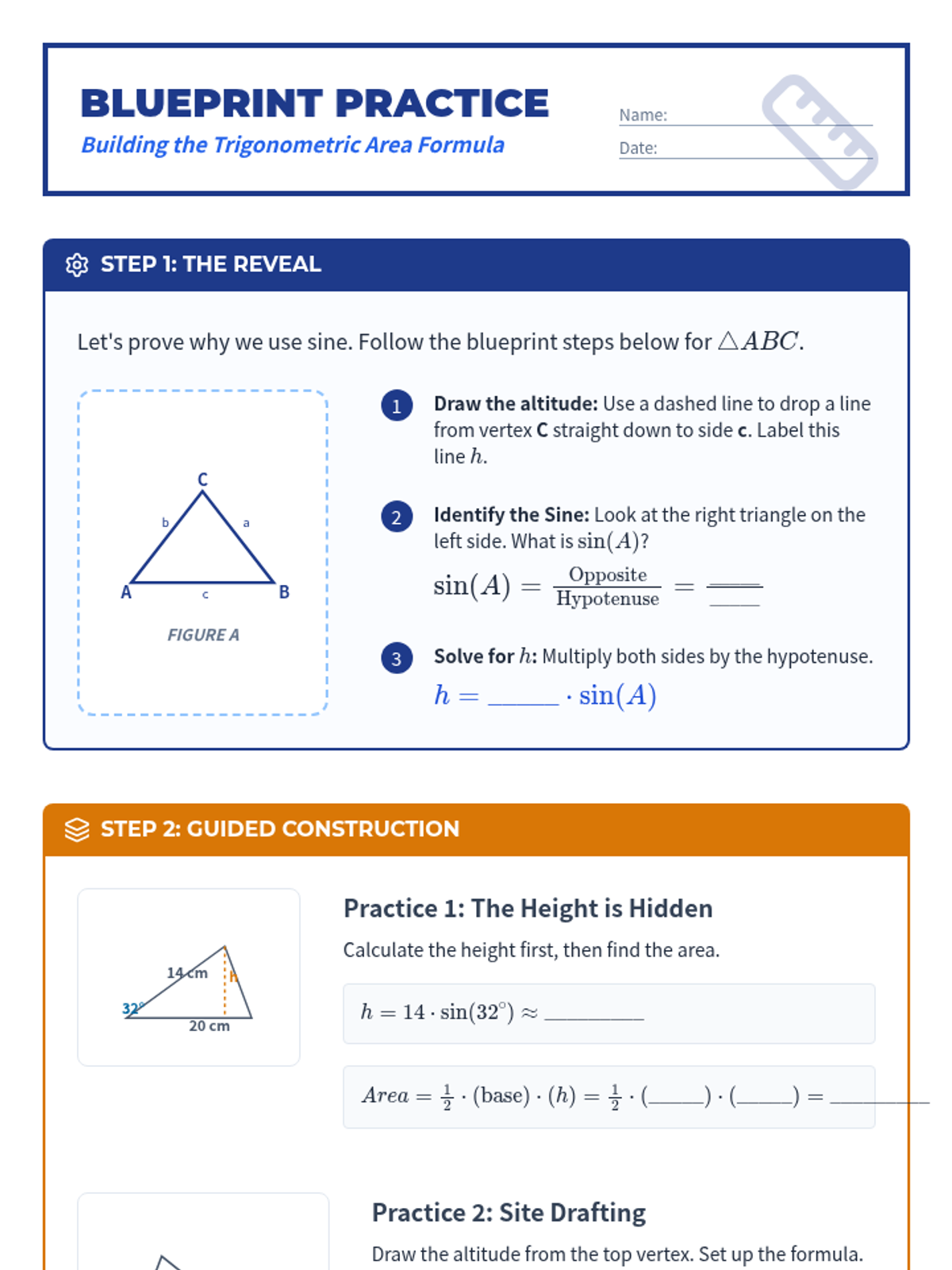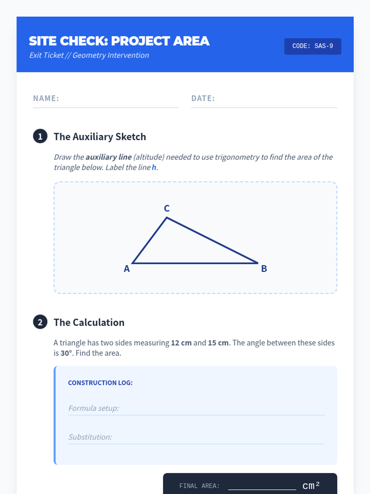 A targeted intervention lesson focusing on the derivation and application of the trigonometric triangle area formula through visual scaffolding and auxiliary lines.