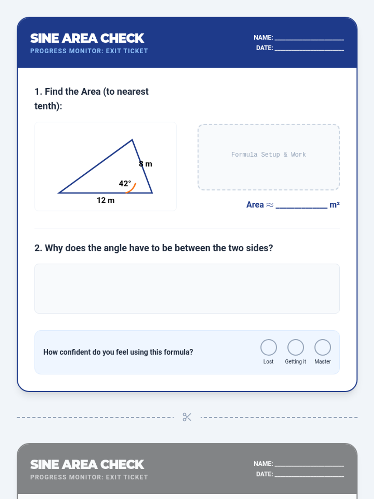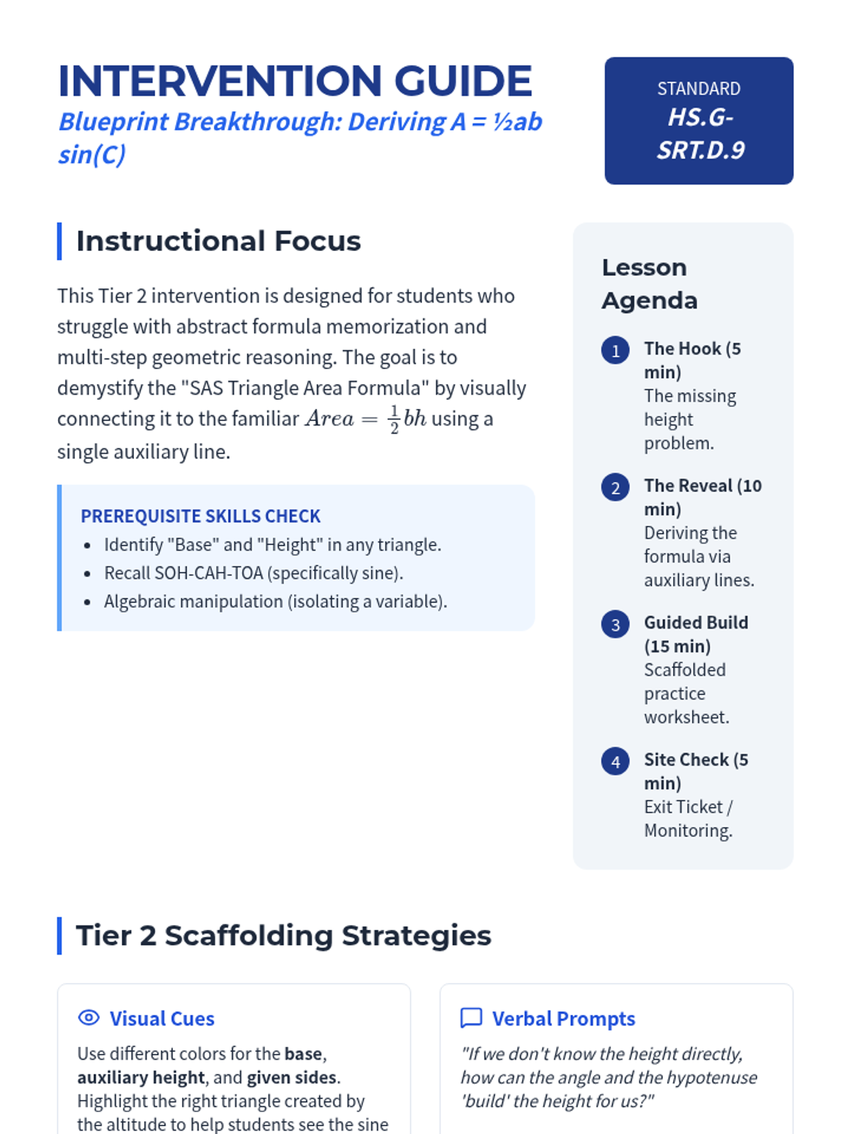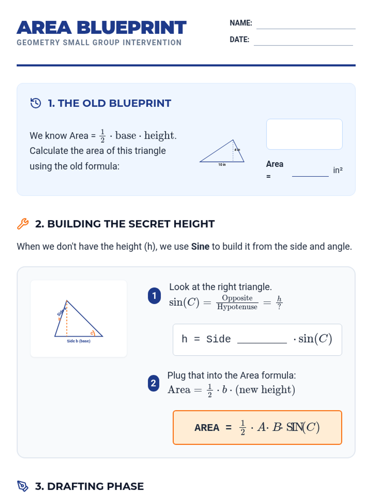 A Tier 2 intervention lesson focused on deriving and applying the sine formula for triangle area, transitioning students from the basic base-height formula to trigonometry-based calculations.