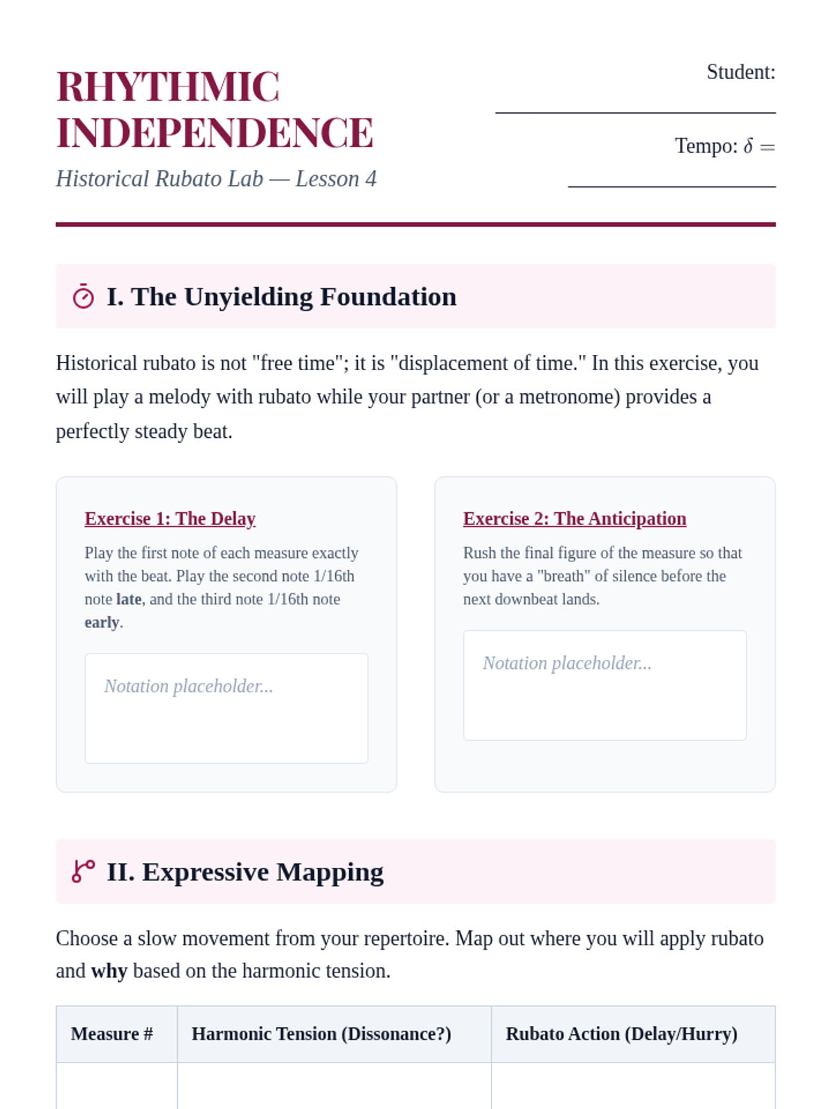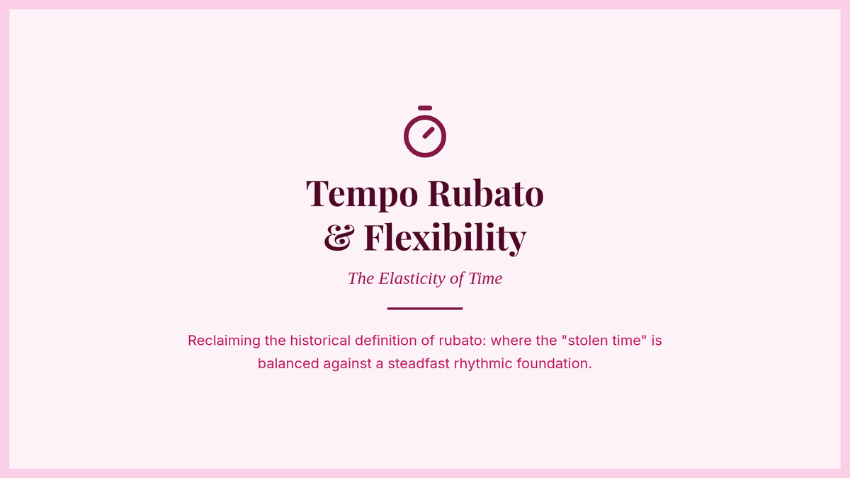 An investigation into historical rubato, contrasting the steady-beat accompaniment with the flexible melodic line.
