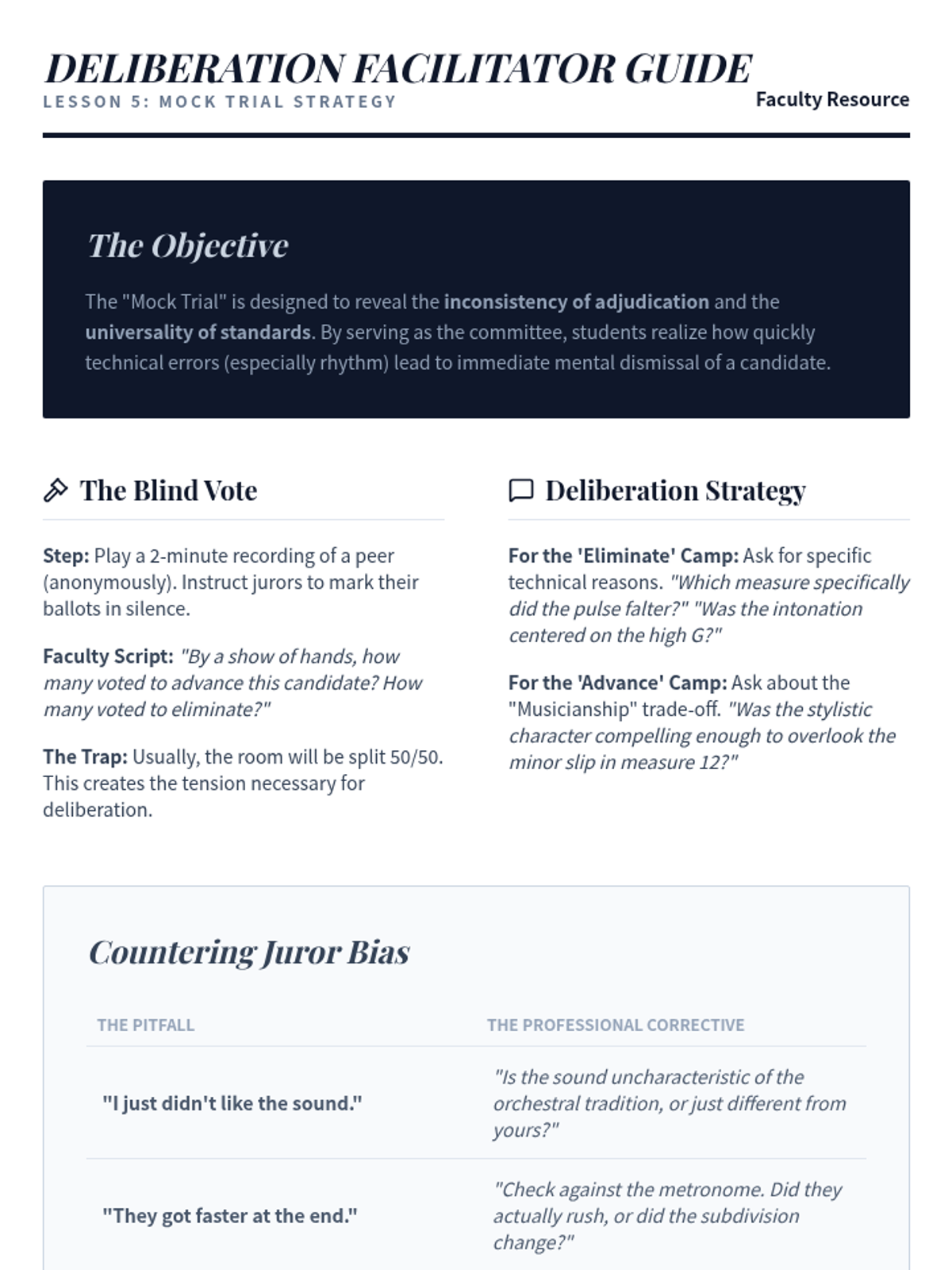 Students reverse roles to serve as the audition committee, adjudicating peer recordings and discussing the nuances of professional standards. This lesson provides insight into the committee's decision-making process.