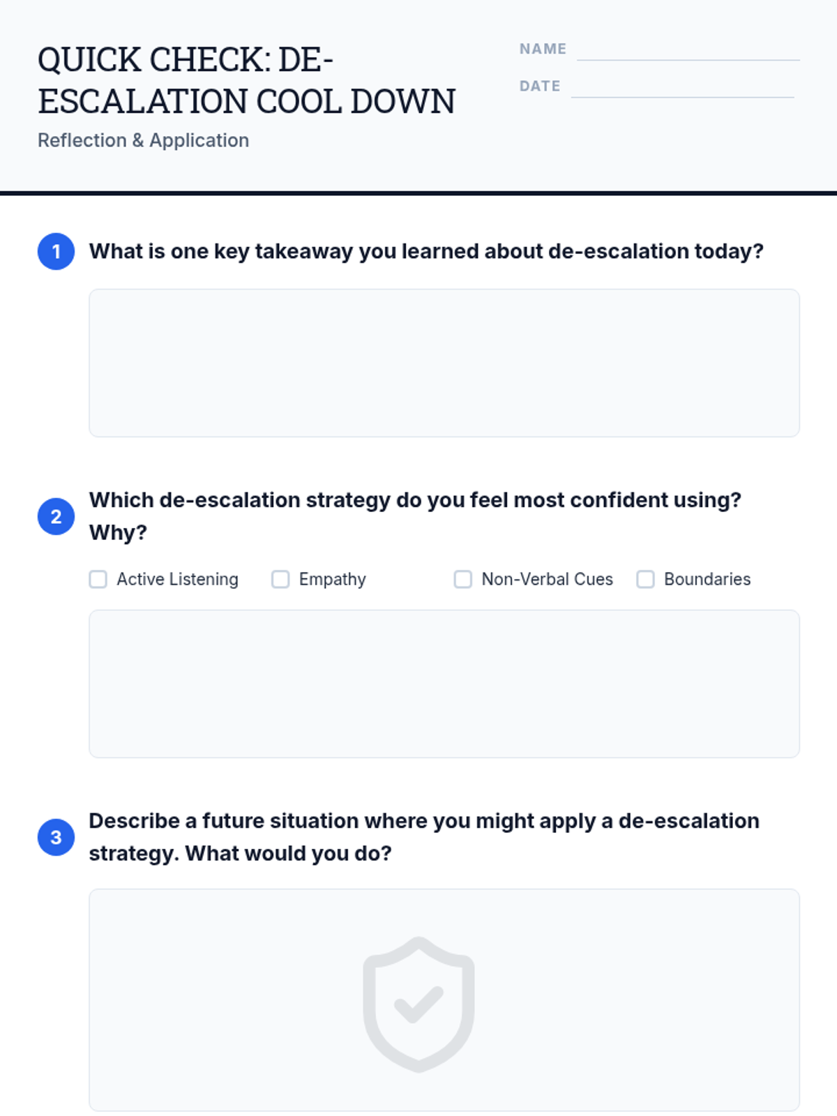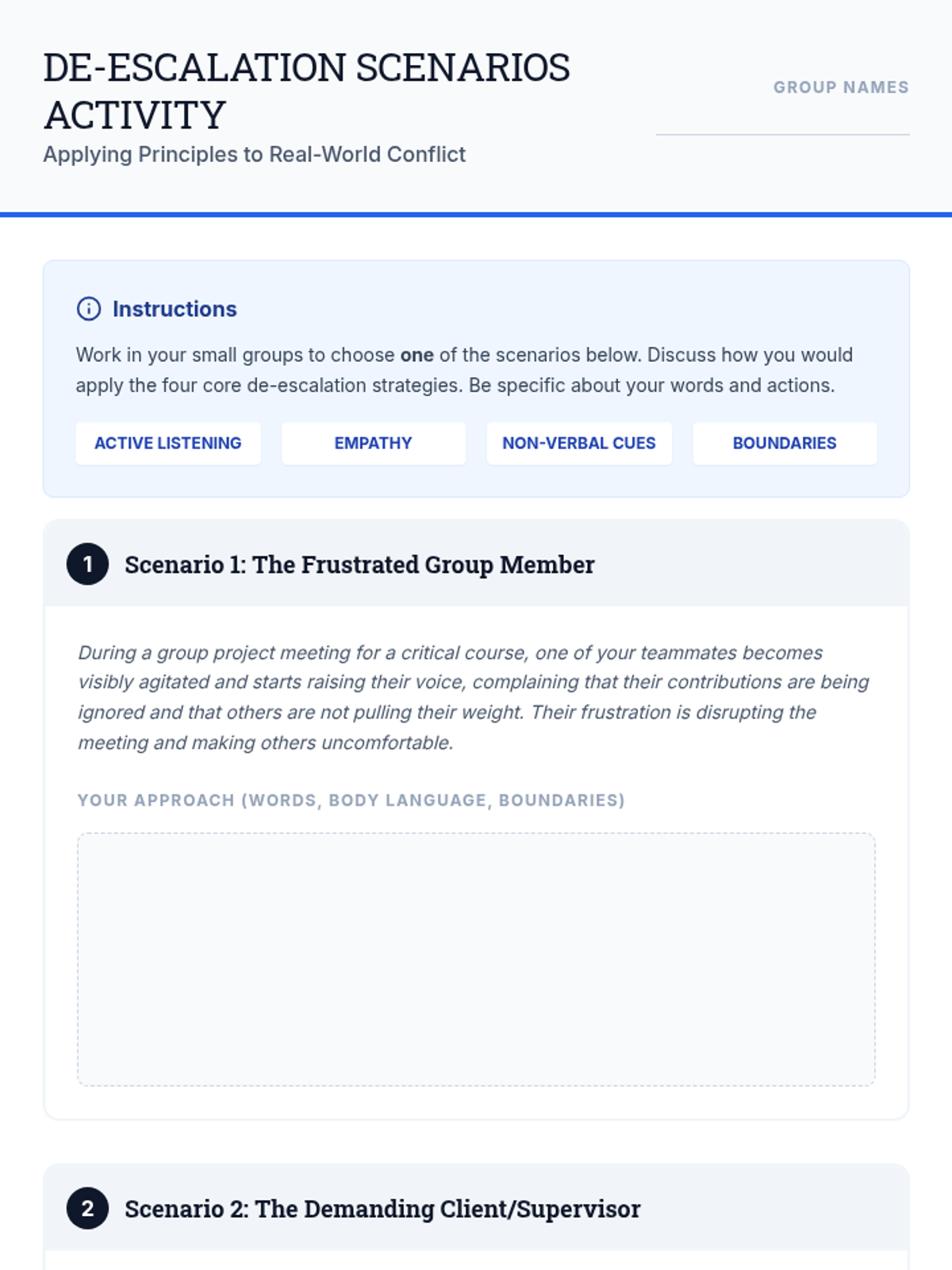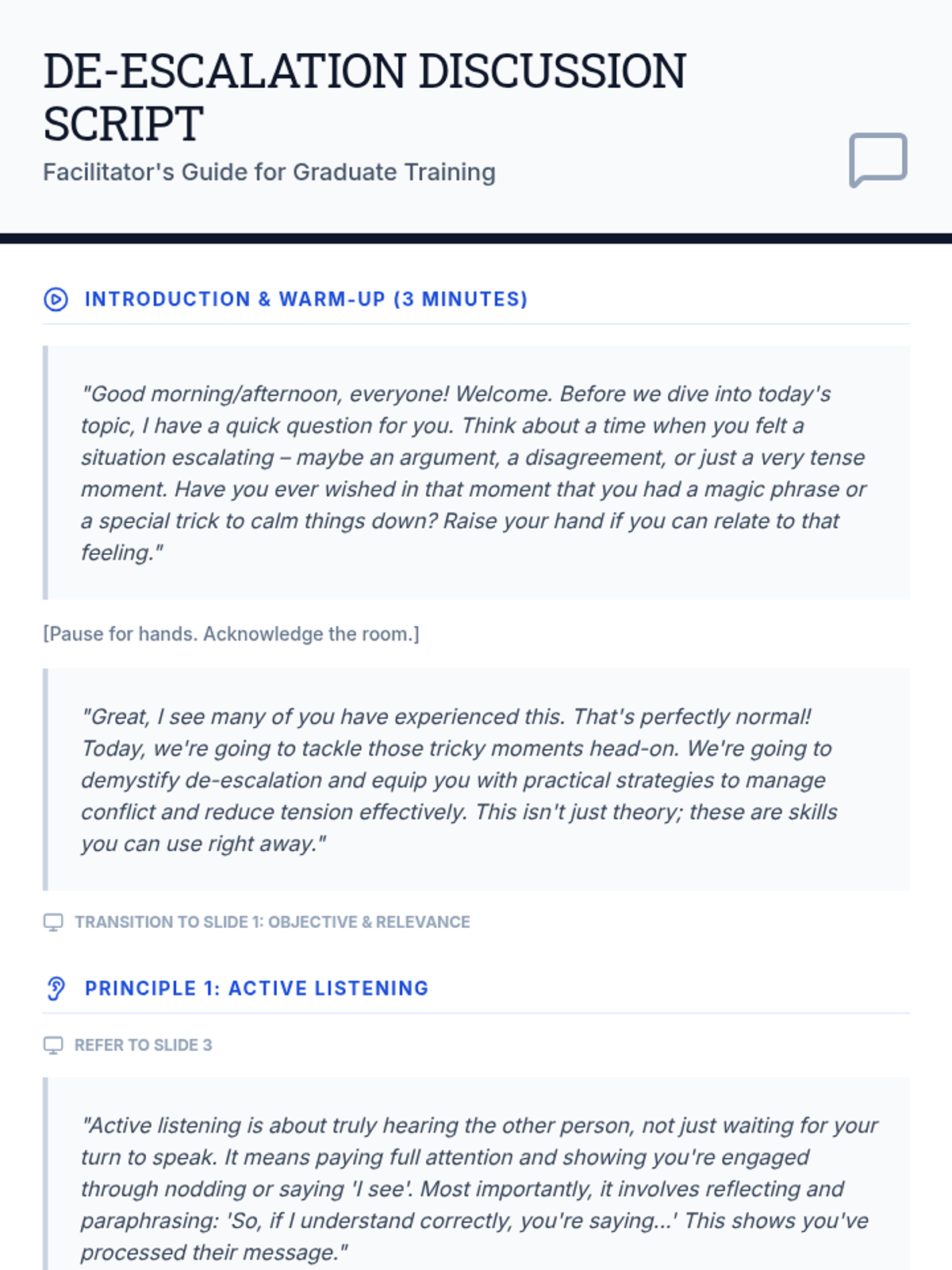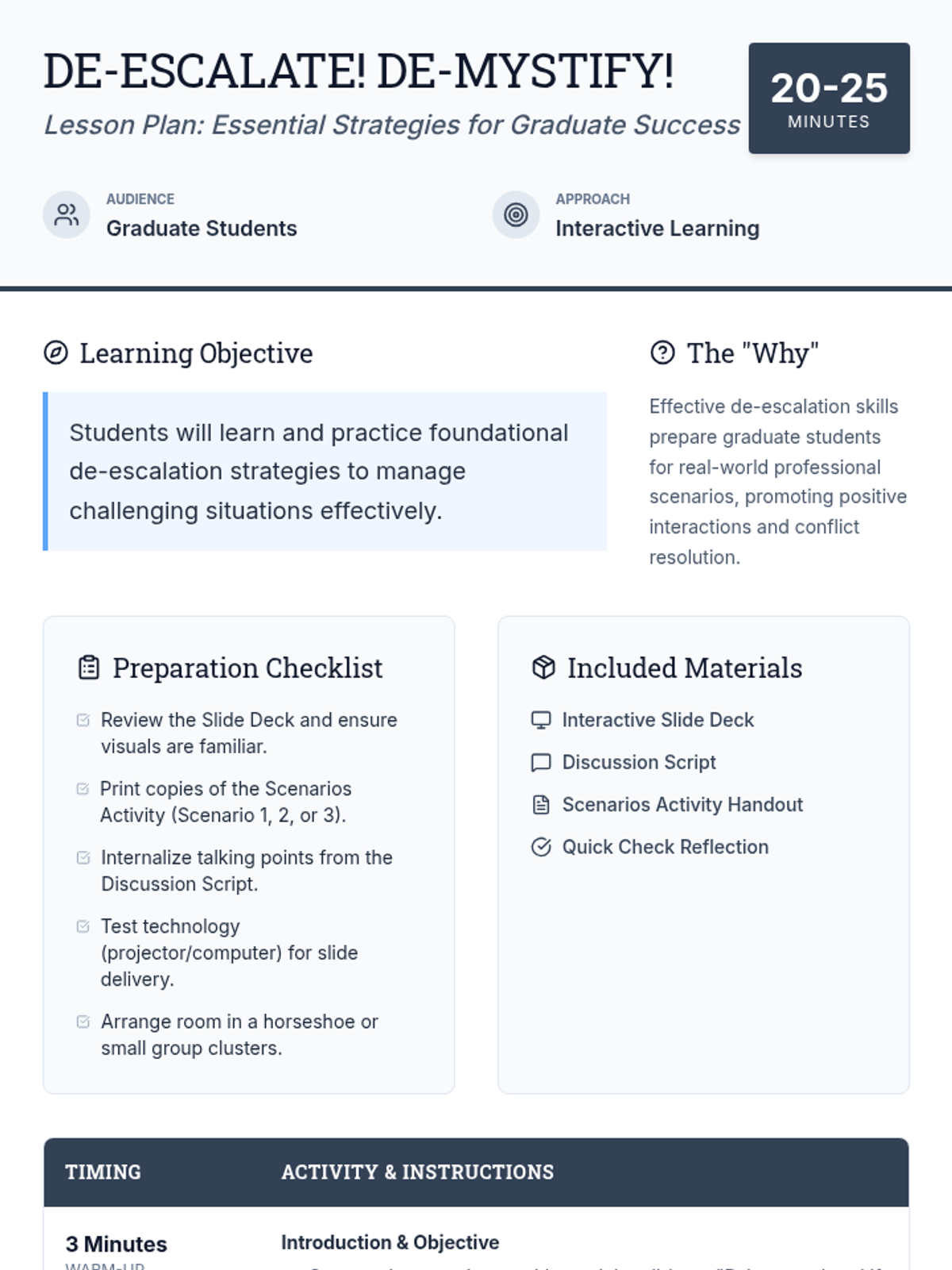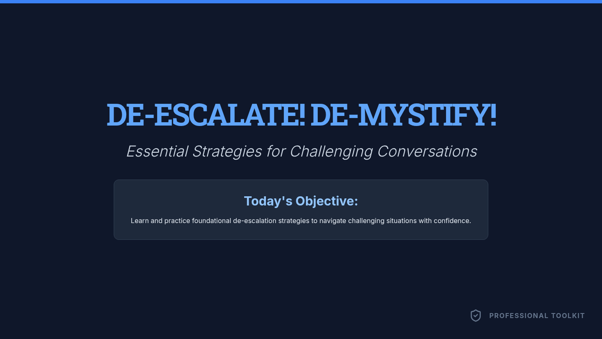 A 20-25 minute interactive lesson for graduate students focused on foundational de-escalation strategies, including active listening, empathy, and boundary setting.