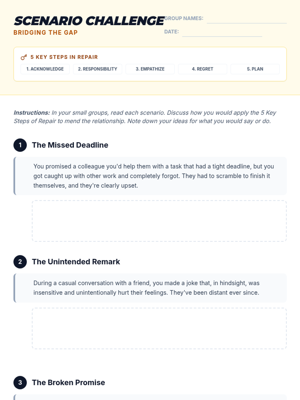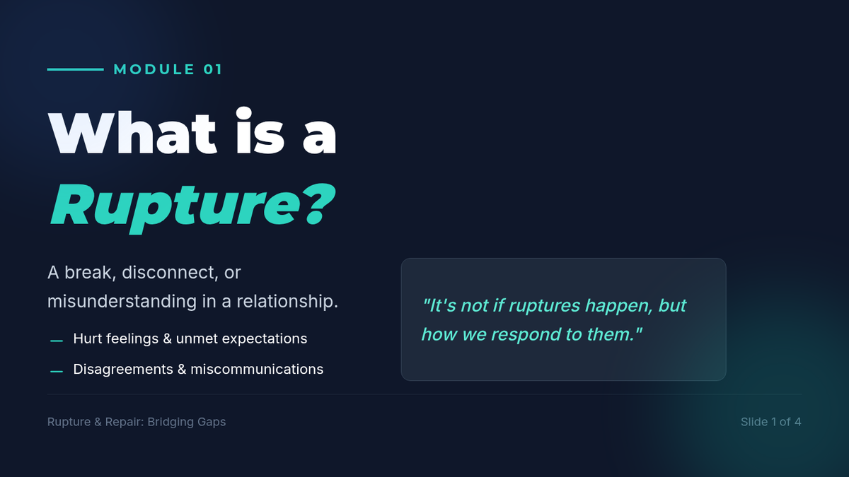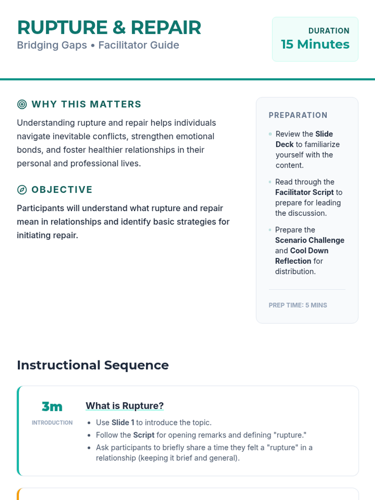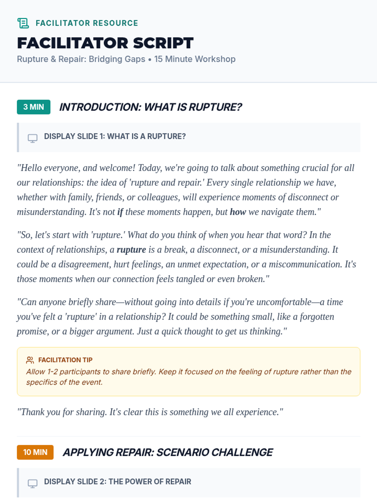 A 15-minute workshop for adults that introduces the concept of rupture and repair in relationships, offering practical steps to mend connections and build stronger bonds.