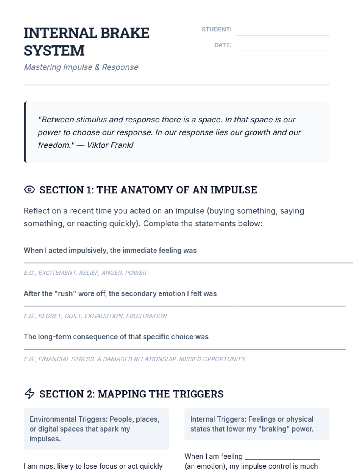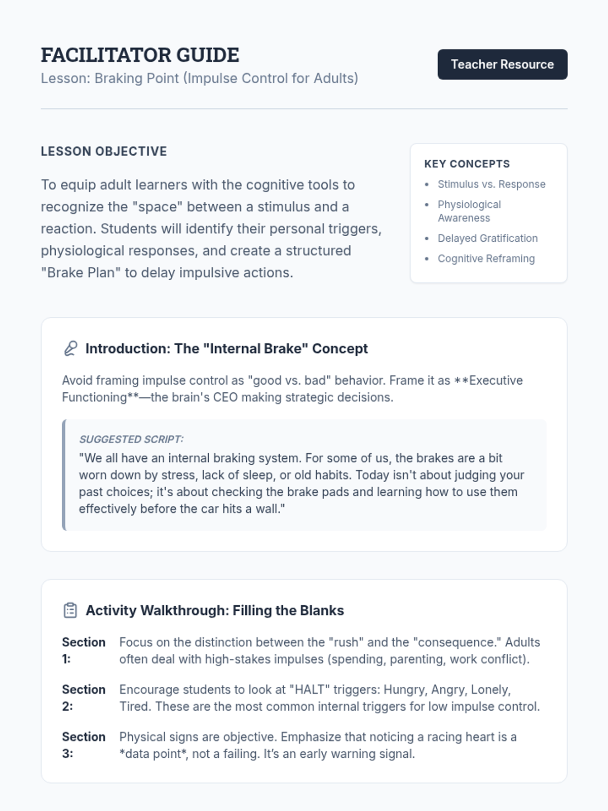 A lesson designed for adult learners to develop self-awareness regarding impulsive behaviors and create a concrete management plan.