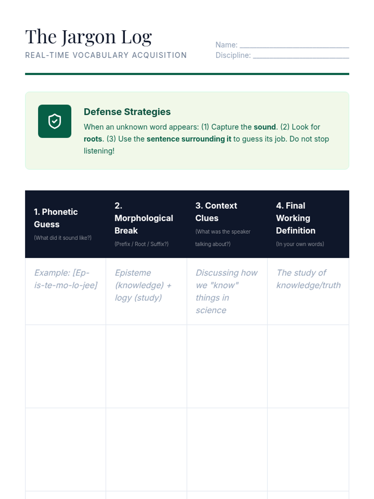 Students develop strategies for handling unfamiliar discipline-specific terminology in real-time. Techniques include phonetic approximation, context-based inference, and morphological analysis, culminating in the creation of an interdisciplinary glossary.