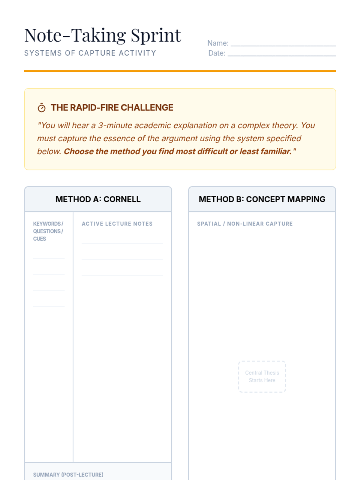 Learners evaluate linear (Cornell) and non-linear (Concept Mapping) note-taking systems. Through a seminar simulation, they determine which methodologies best capture different types of academic information, from timelines to theoretical frameworks.