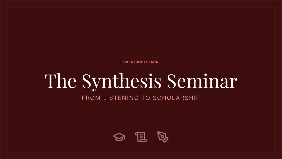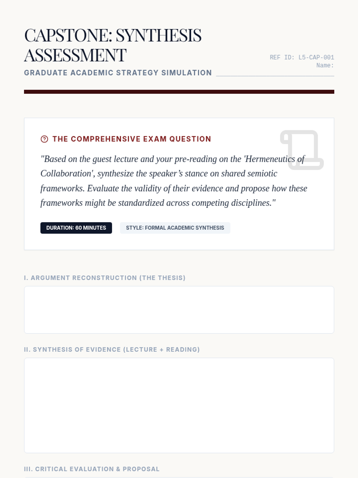 In this capstone, students attend a full-length lecture and produce a synthesized summary integrating notes with external readings. This simulates the authentic graduate task of reconstructing arguments for comprehensive examinations.