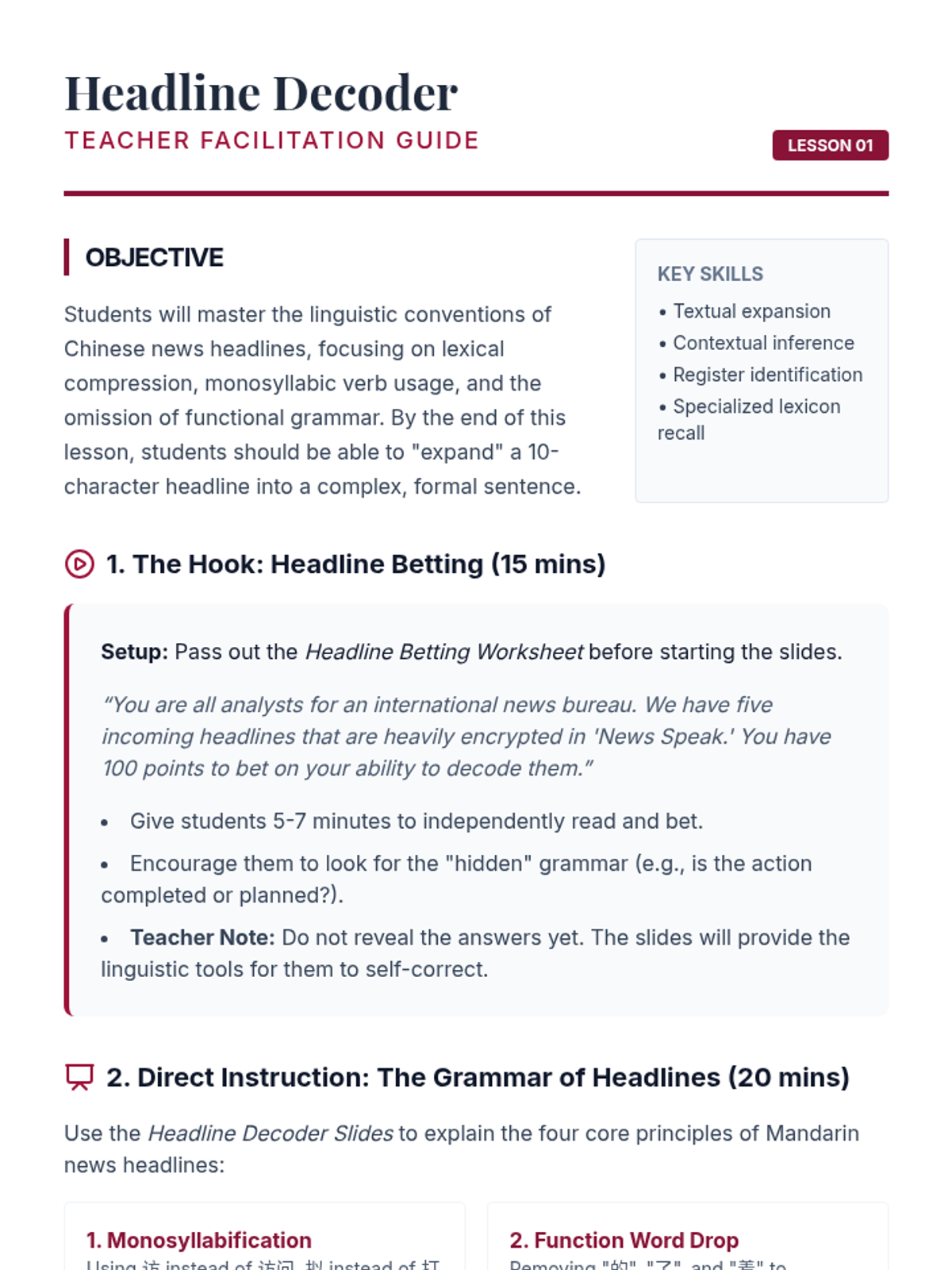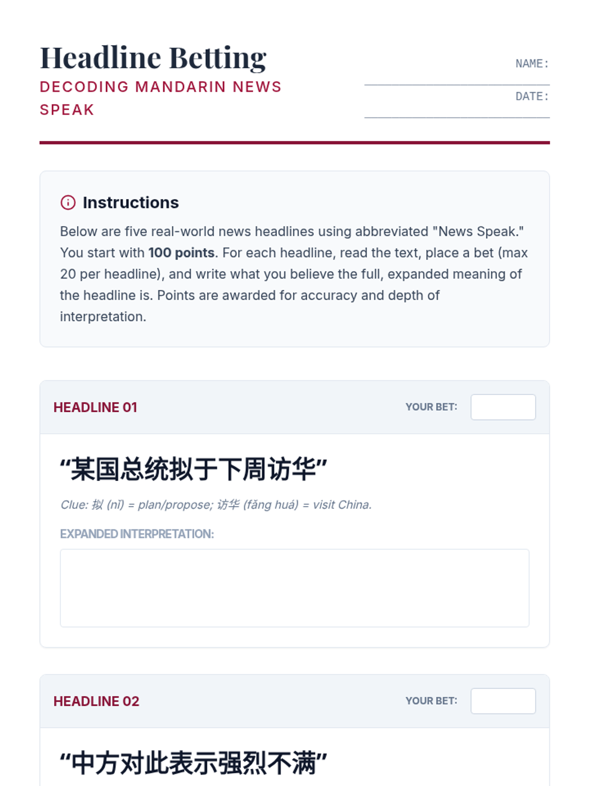 Students learn the abbreviated grammar and specialized vocabulary unique to Chinese news headlines, practicing the expansion of compressed text into full sentences.