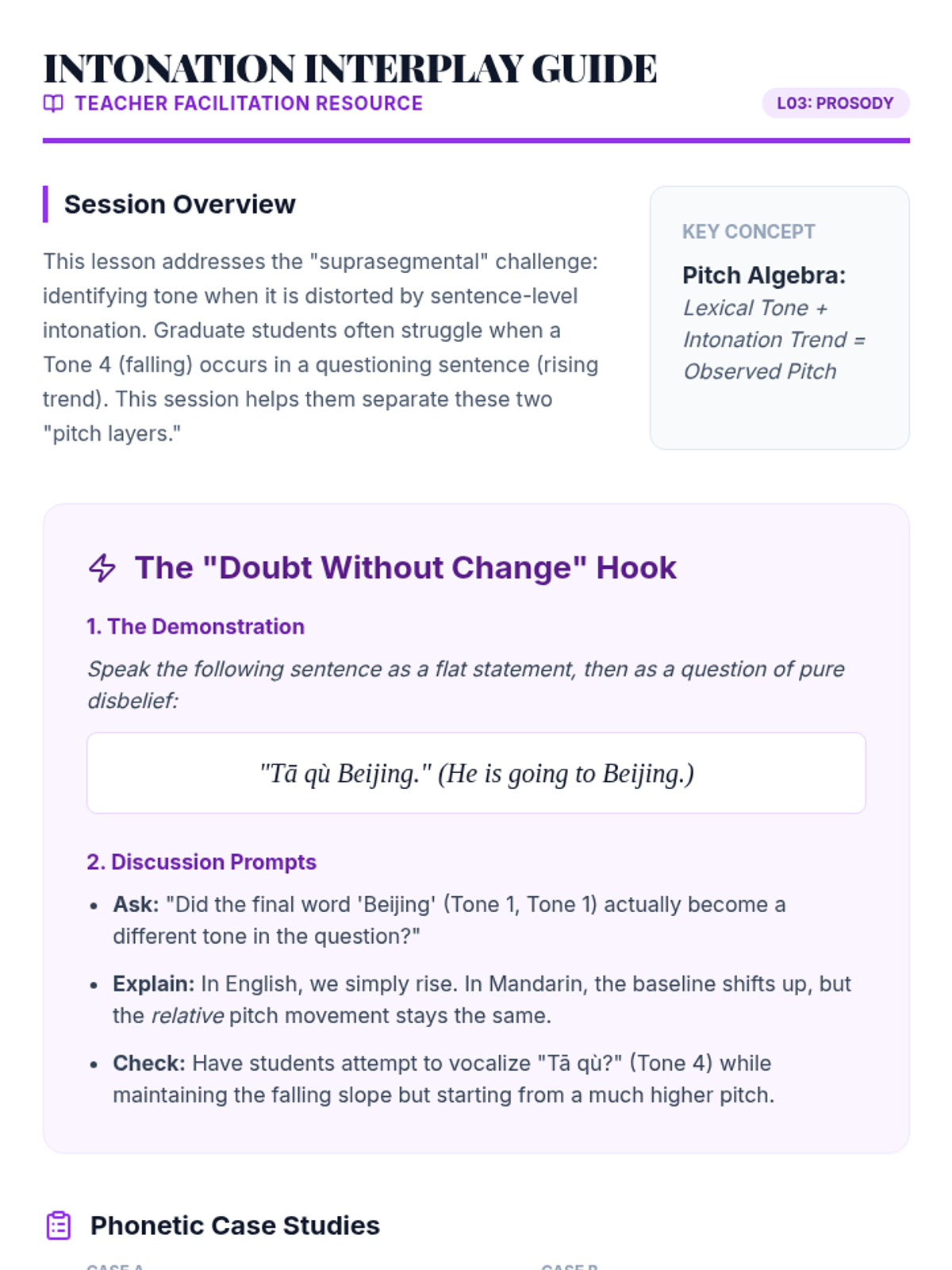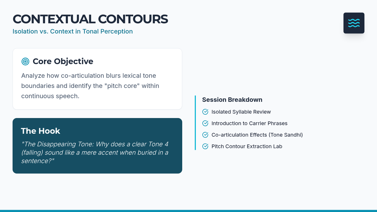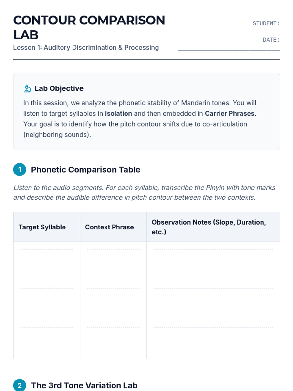 Students analyze the phonetic shifts of tones when moved from isolation into carrier phrases, focusing on co-articulation and pitch contour core.