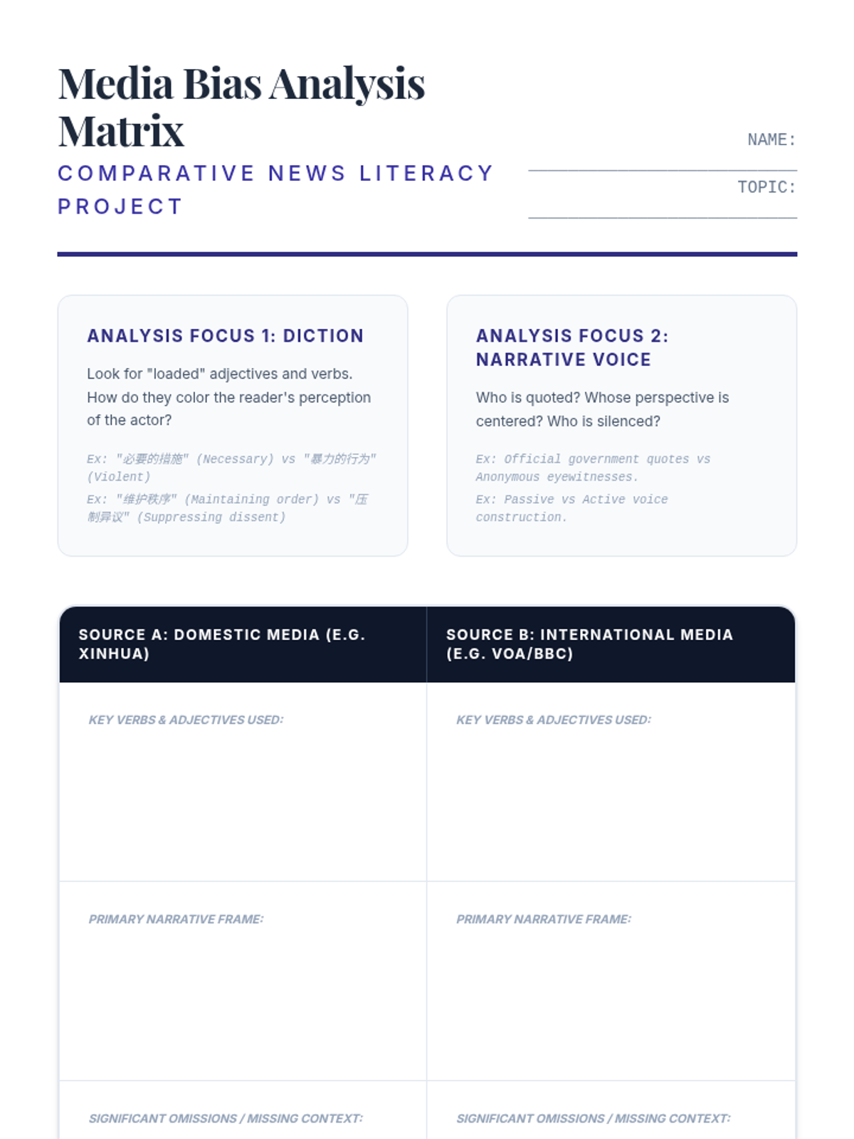 Students compare domestic and international Chinese-language media reports on the same events to identify bias, framing, and intended audience through word choice analysis.