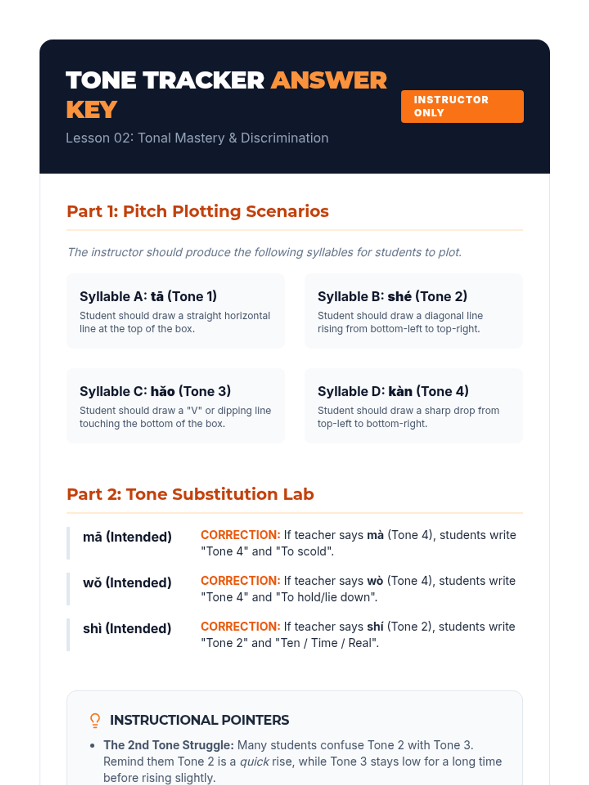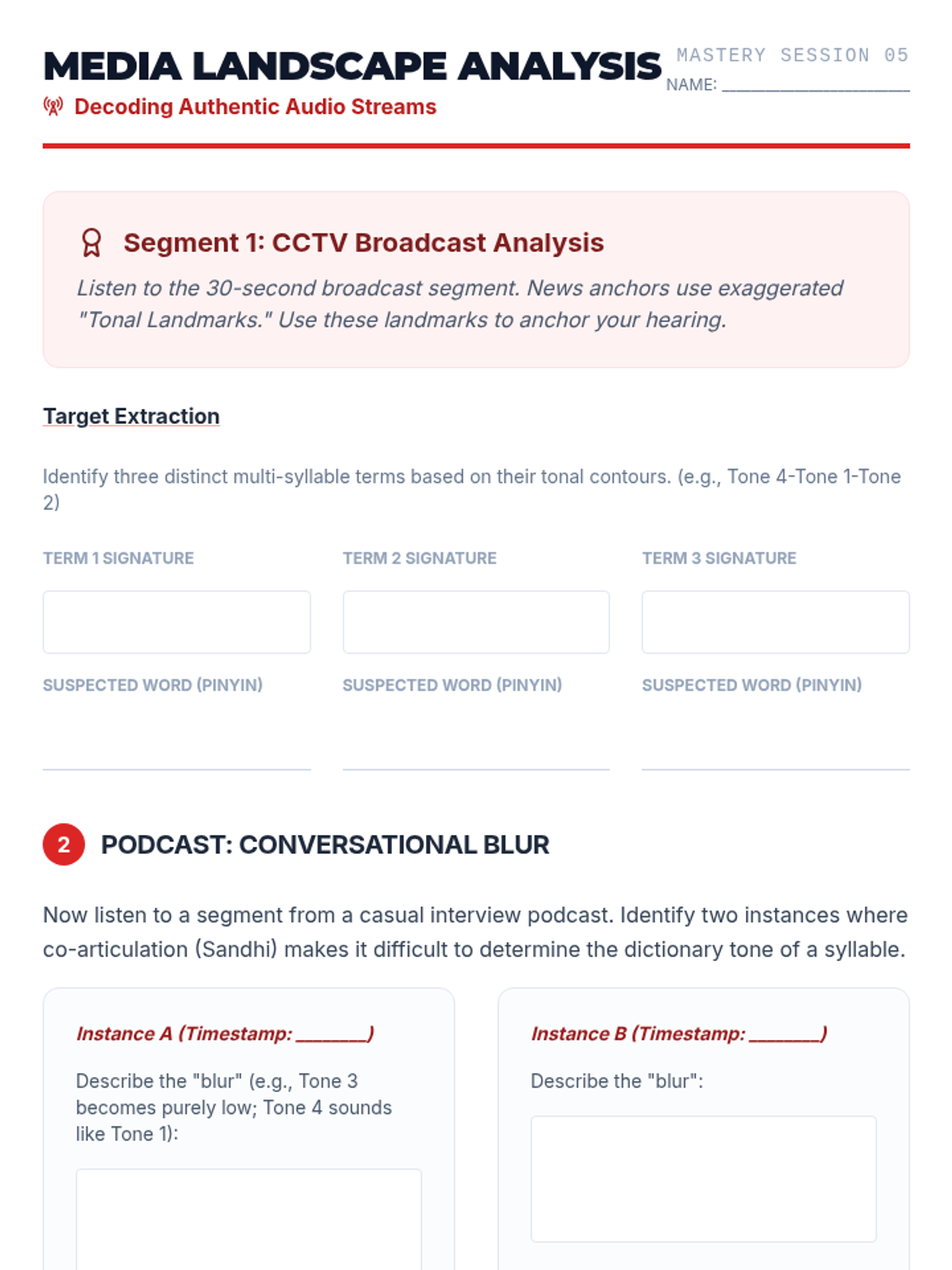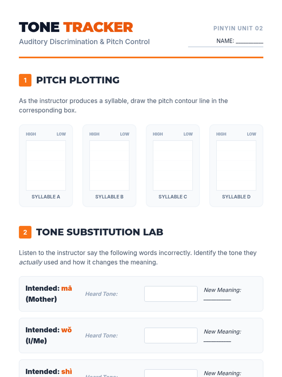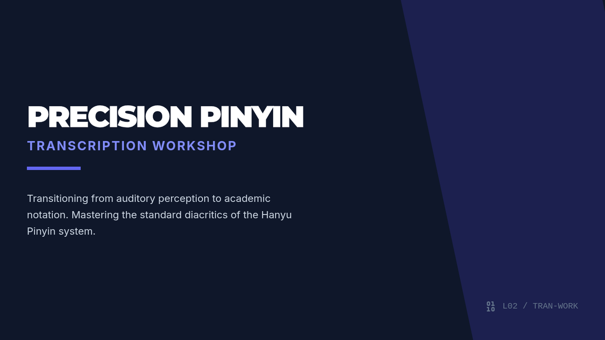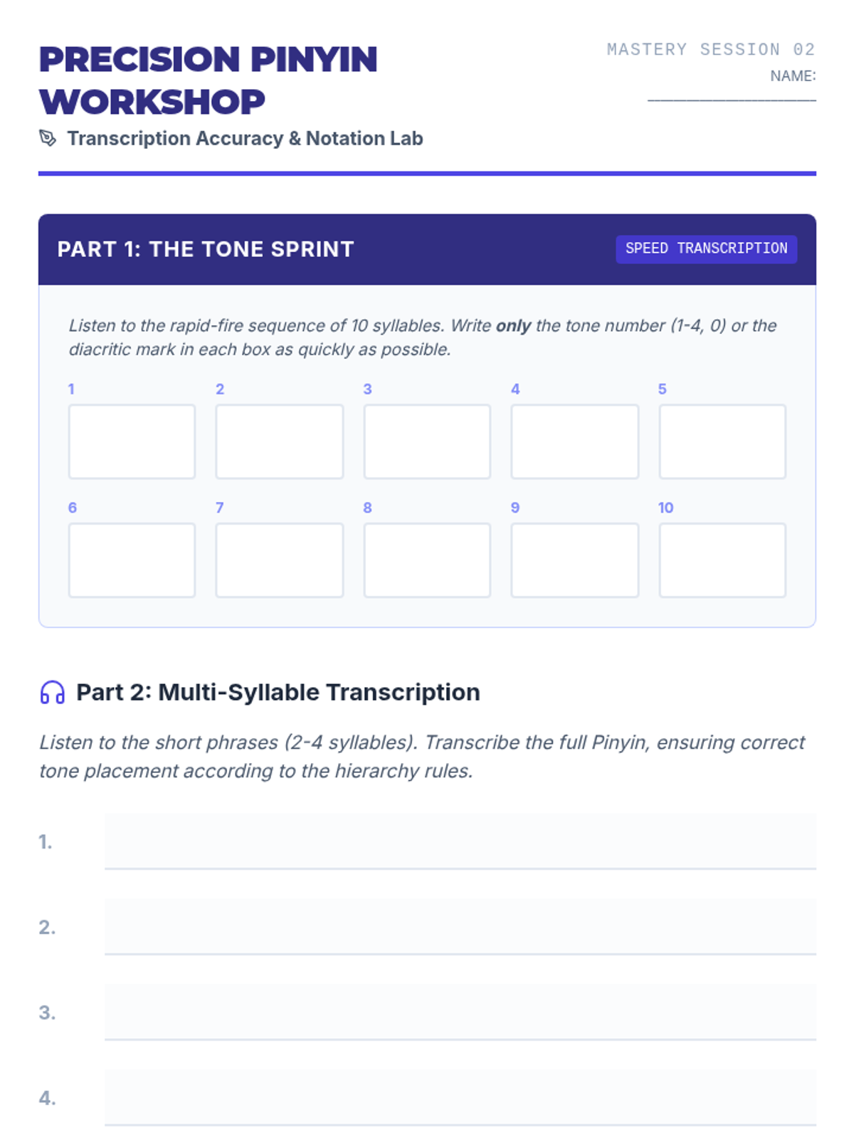A rigorous workshop focusing on accurate Pinyin transcription of tones from audio stimuli, emphasizing detail and pattern recognition.