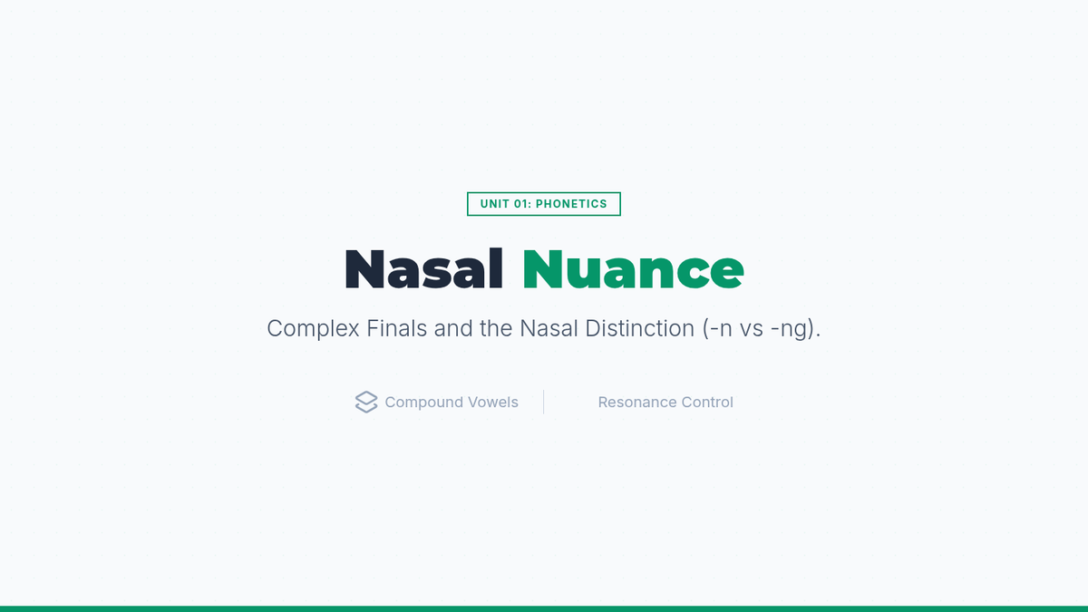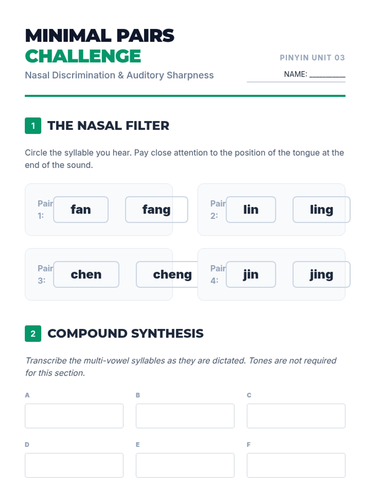 Covers complex vowel combinations and the distinction between front and back nasal endings (-n vs -ng) through auditory discrimination exercises.