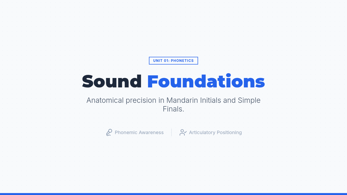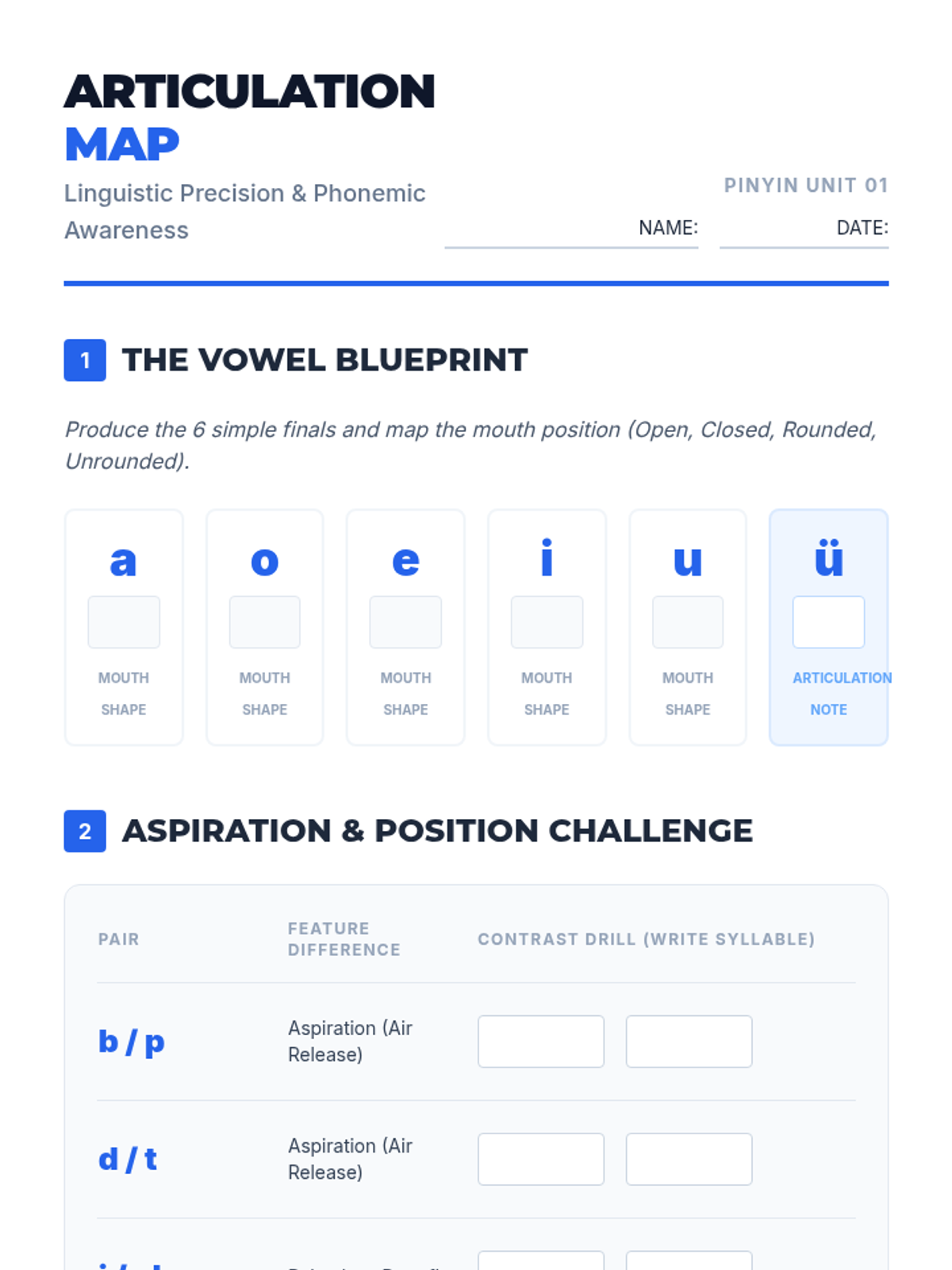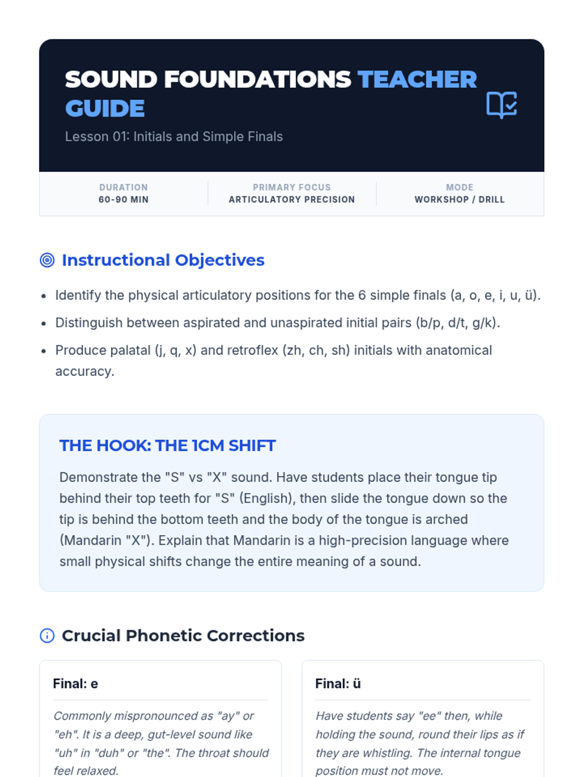 Focuses on the articulatory positions of Mandarin initials and simple finals, emphasizing phonemic awareness and correct mouth positioning for sounds unique to Mandarin.