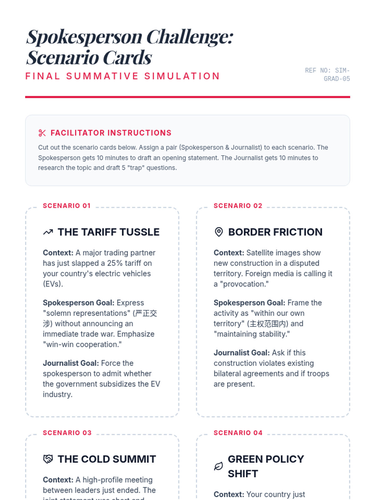 In a culminating simulation, students act as spokespersons or journalists, using formal diplomatic registers to draft statements, ask questions, and handle inquiries.