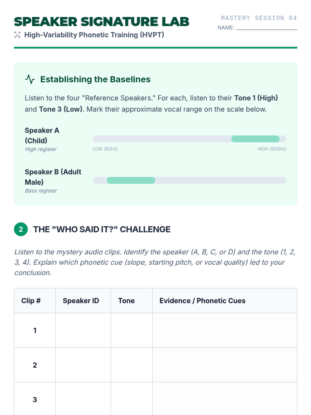 Training the ear to recognize tones across a wide variety of speaker types and vocal baselines to generalize phonetic knowledge.