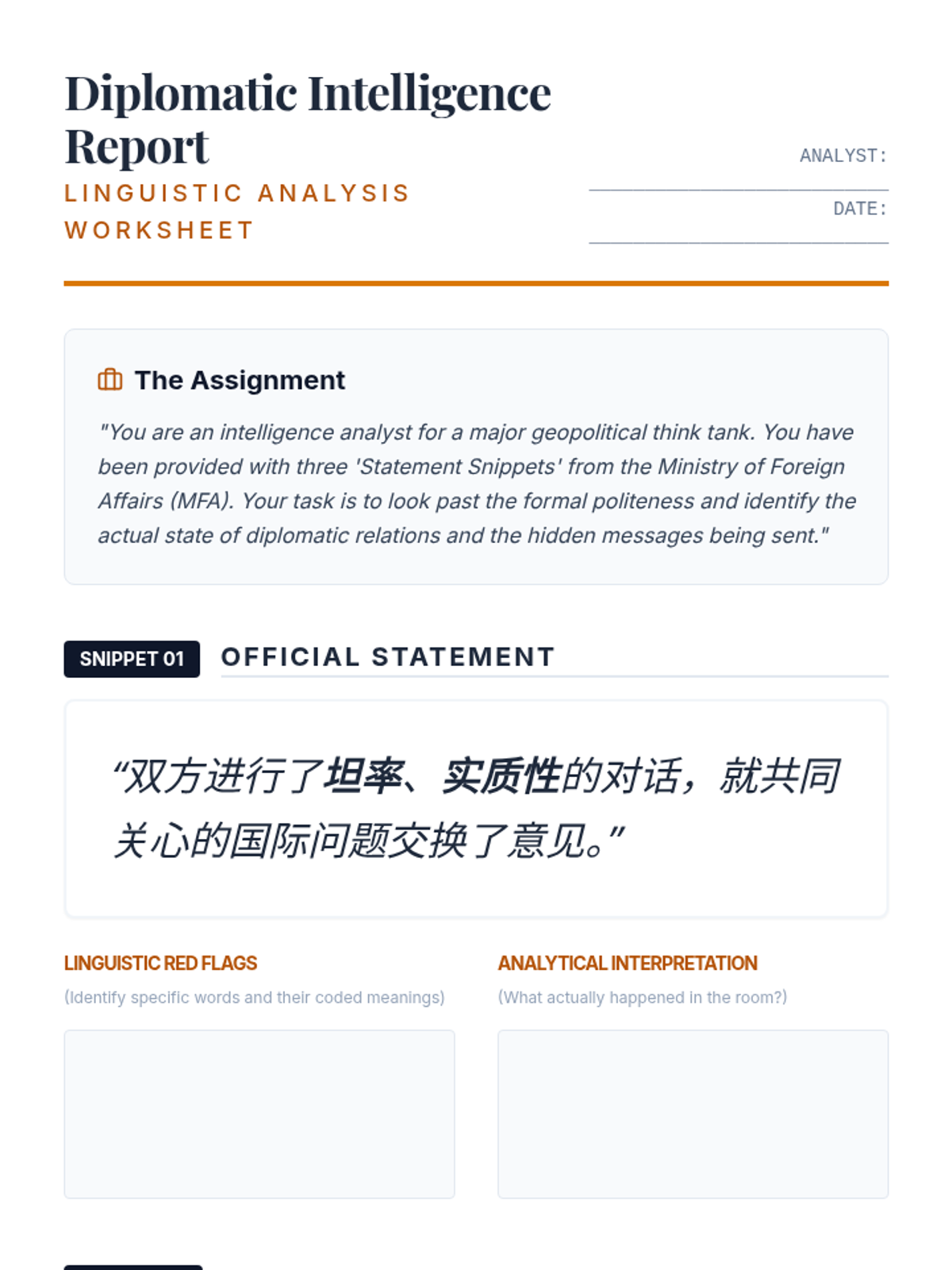 This lesson analyzes the standardized vocabulary of diplomacy, teaching students to interpret the severity of international relations through specific adjectives and formulaic phrases.