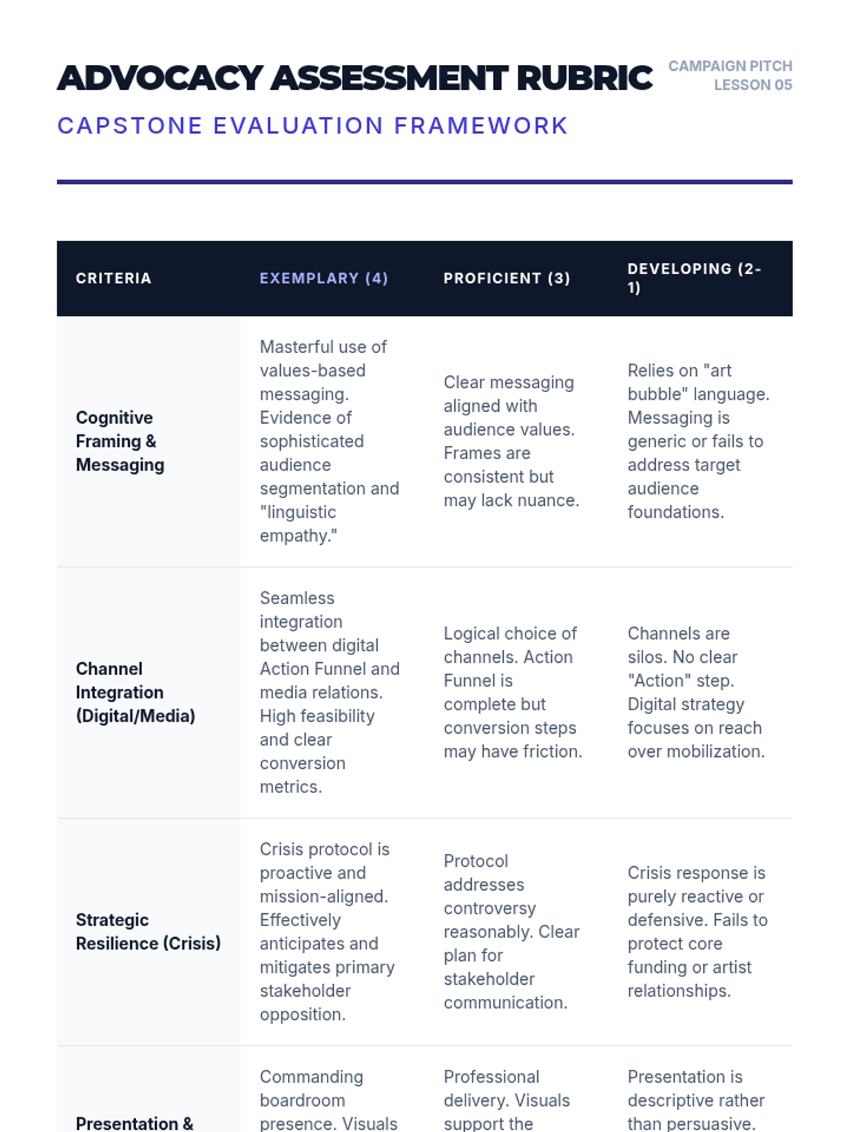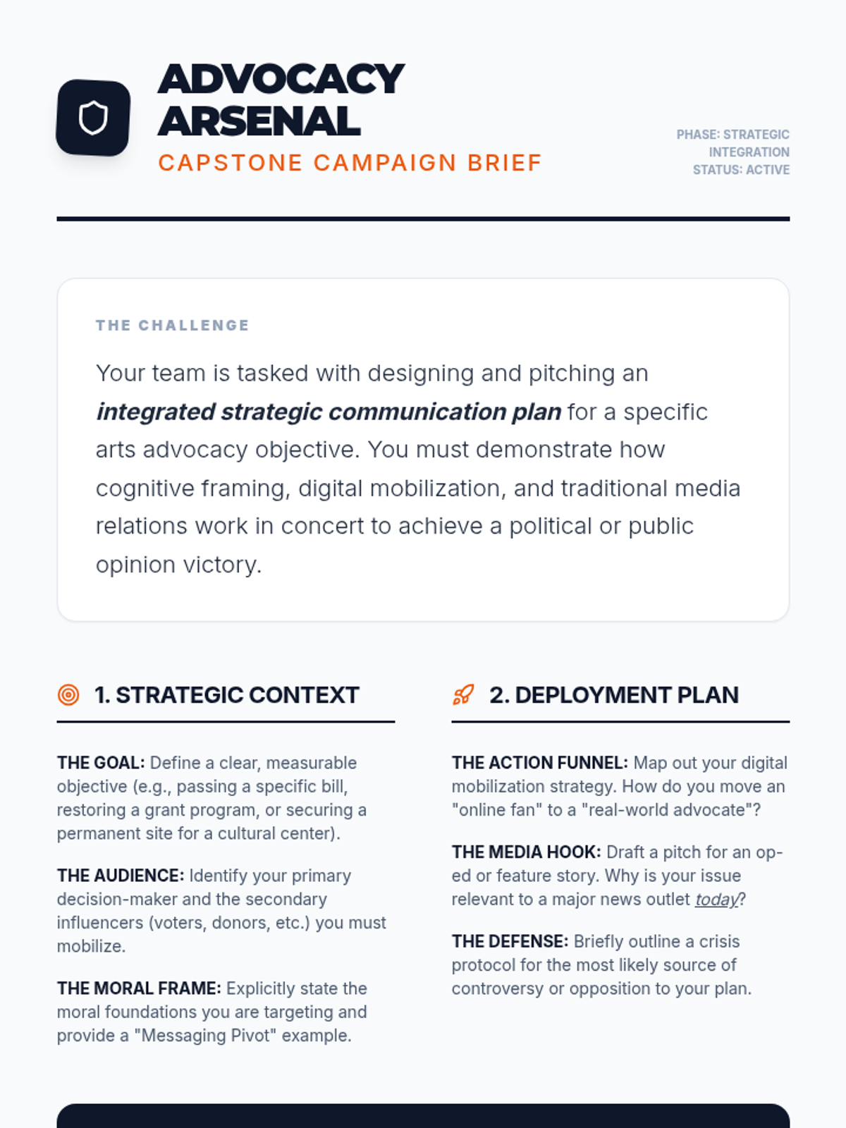 Synthesize all sequence concepts into a final campaign pitch. Students present integrated strategic communication plans for specific advocacy objectives to a mock board.