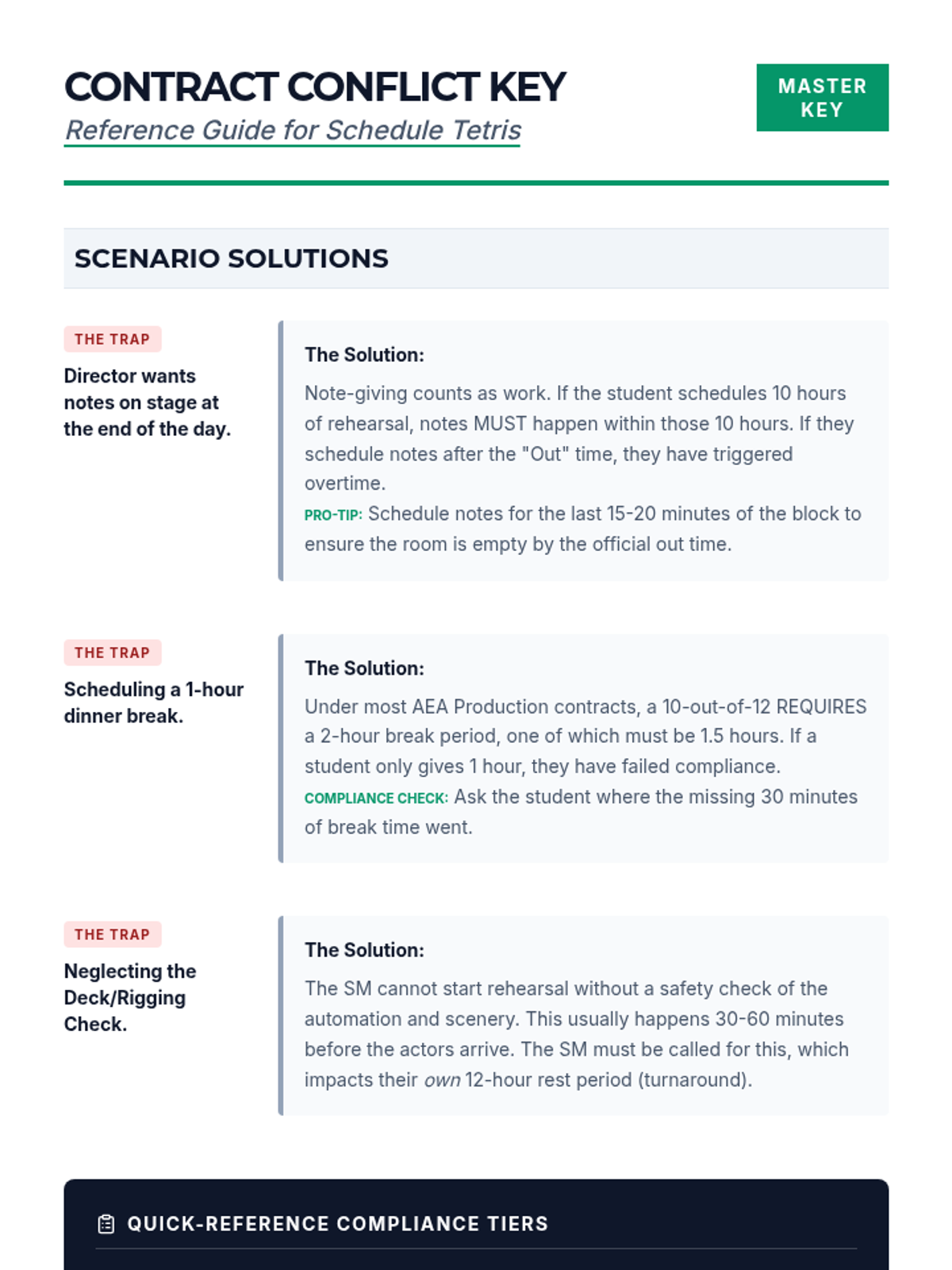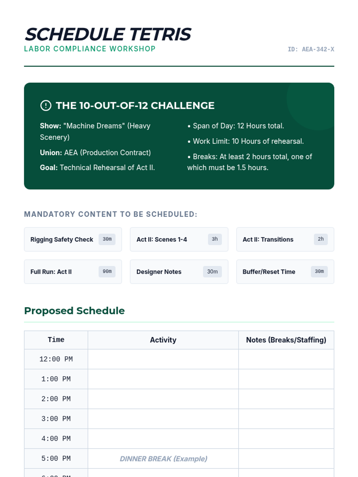 Navigate the complex landscape of theatrical unions (AEA/IATSE). Apply contract rules to real-world scheduling and grievance scenarios in a professional environment.