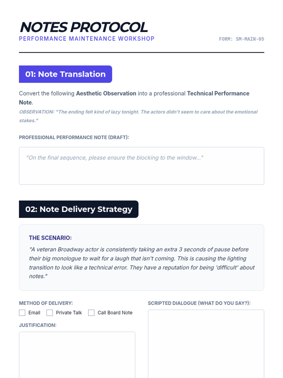 Learn the art of maintaining a production's artistic integrity over a long run. Master the delicate skill of giving notes to professional actors and combating performance drift.