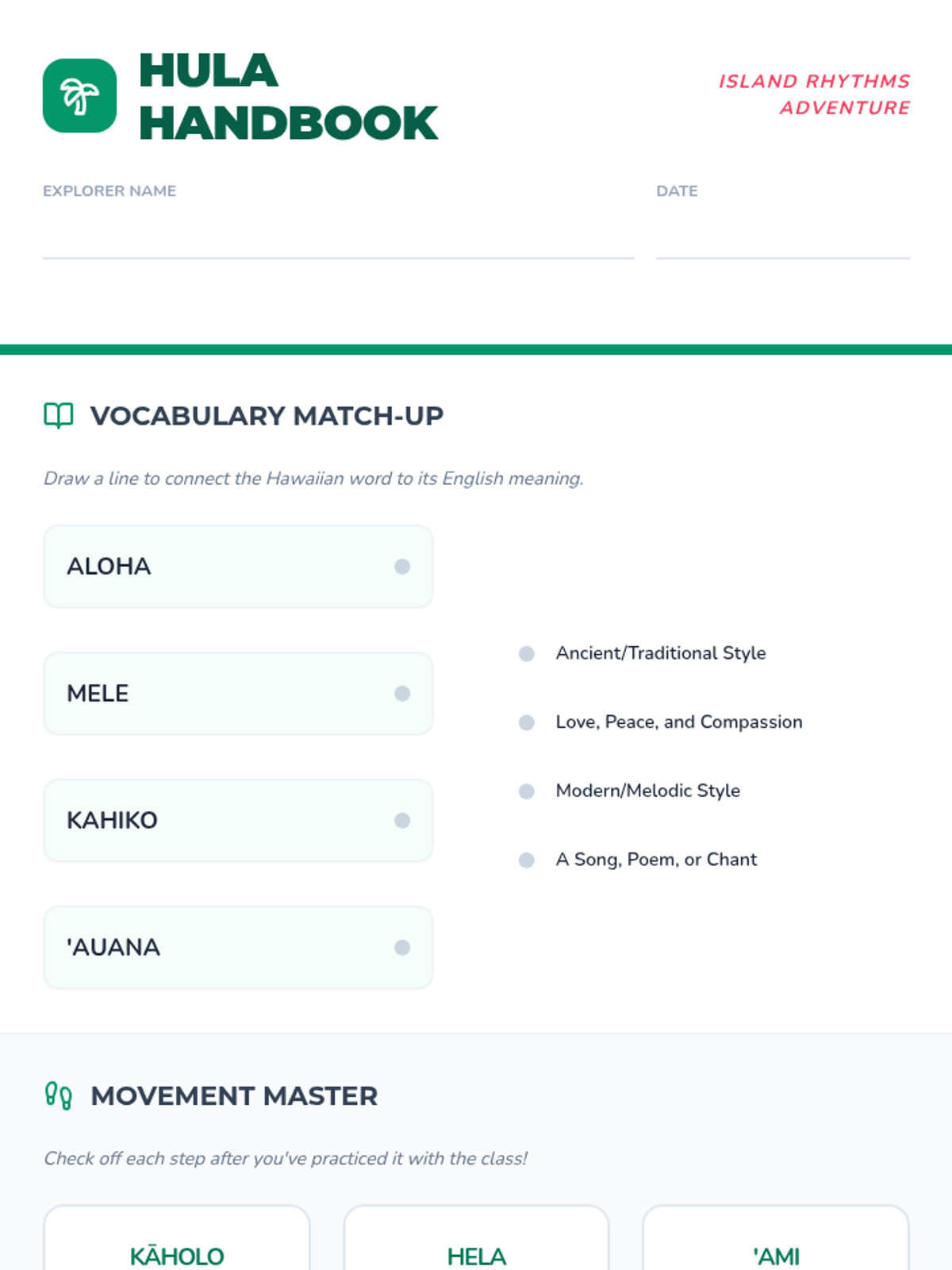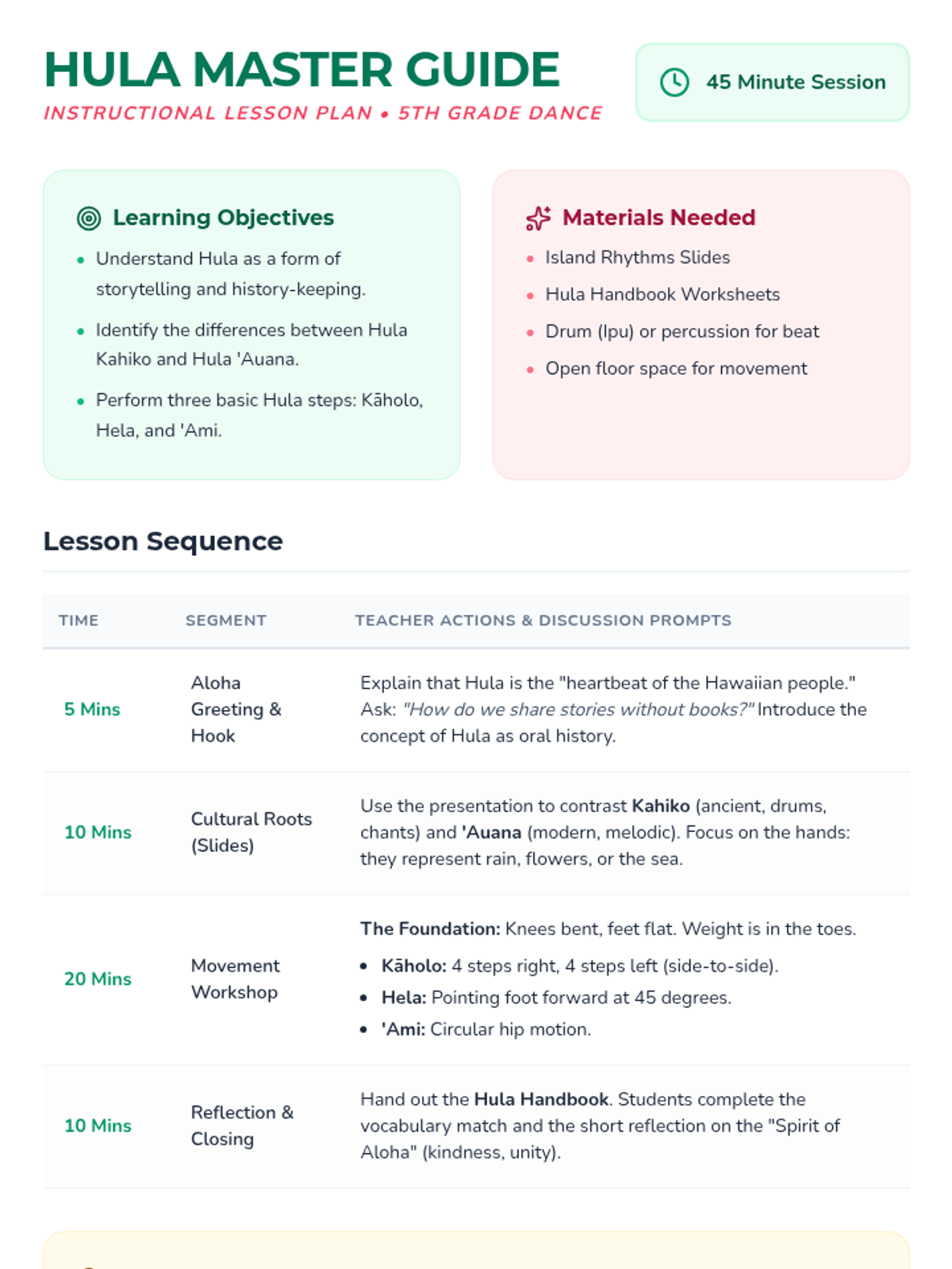 A comprehensive introduction to Hawaiian Hula for 5th graders, covering cultural history, the two main styles (Kahiko and 'Auana), and fundamental footwork. Students will learn how Hula serves as a method of storytelling and history-keeping.
