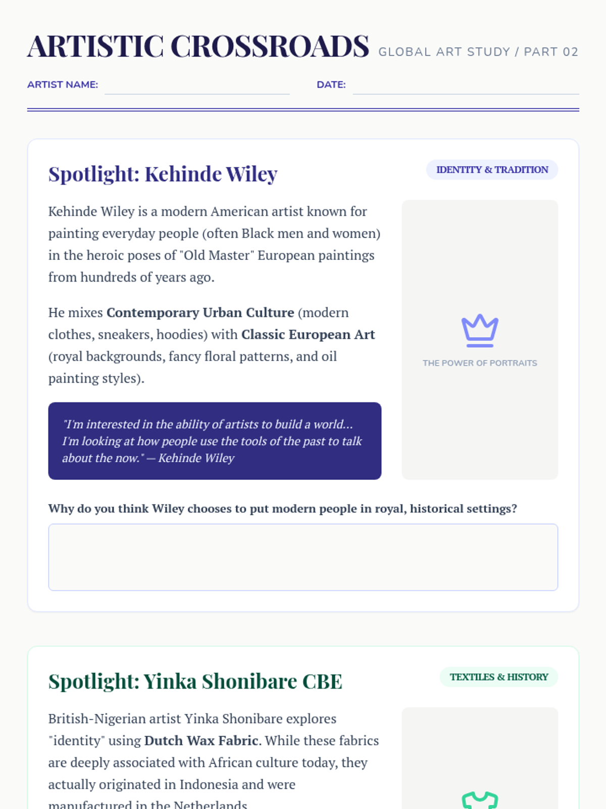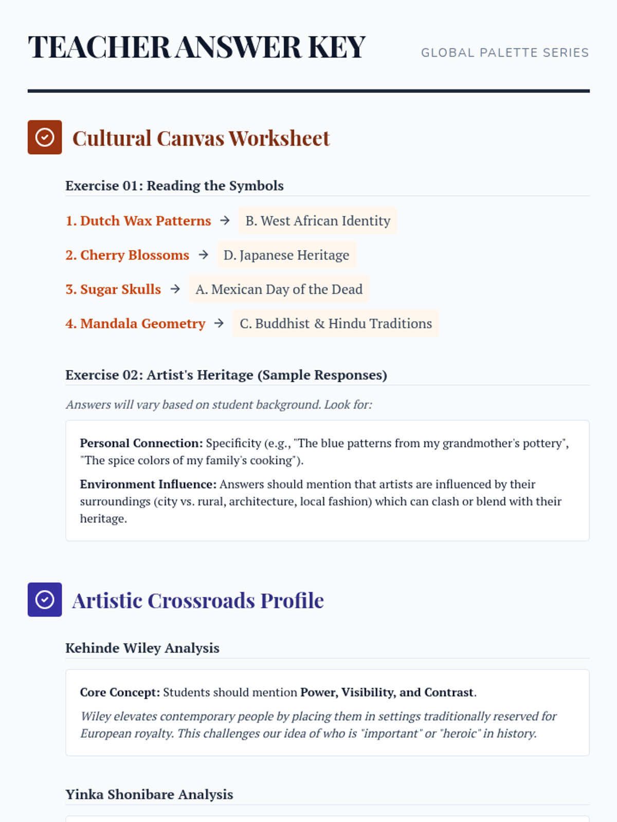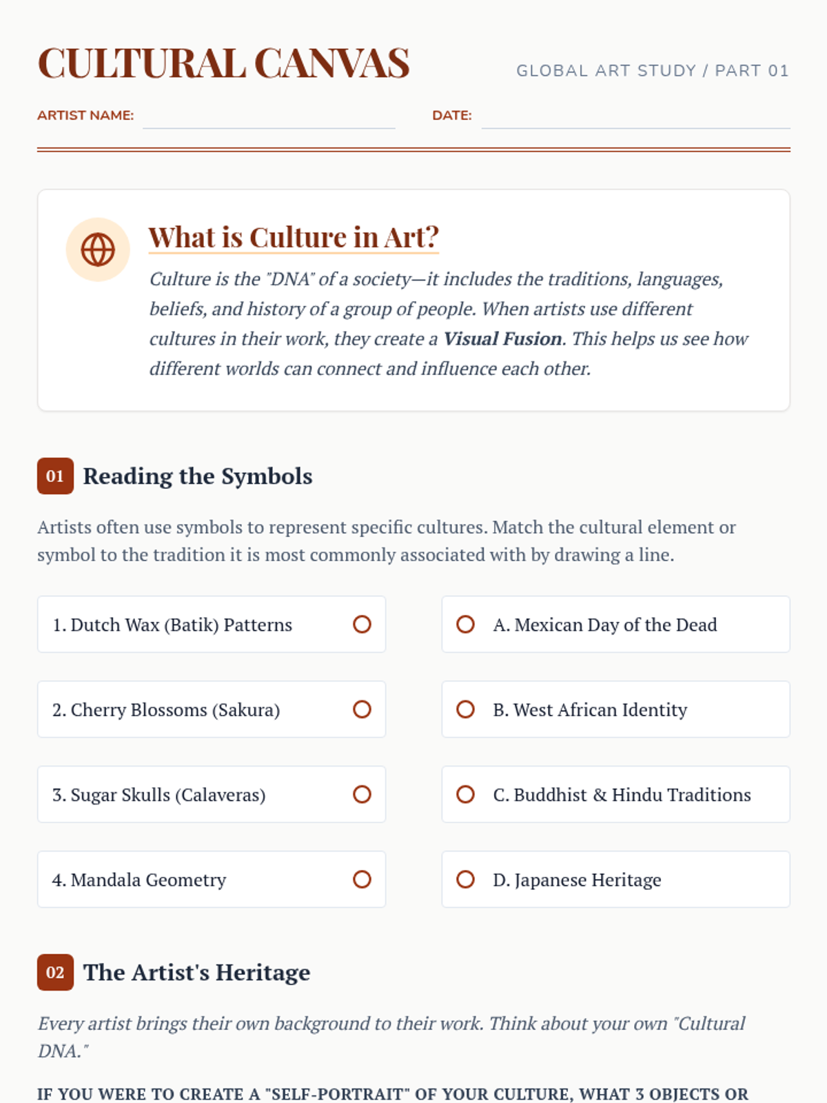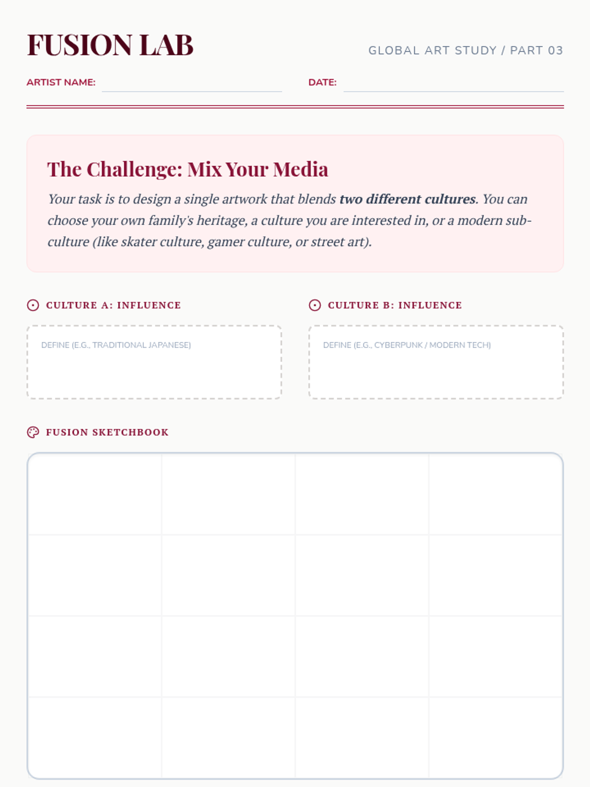 This lesson explores how artists blend and draw inspiration from various cultures, focusing on cultural fusion, symbolism, and identity in global art. Students will analyze contemporary artists and create their own fusion-inspired designs.