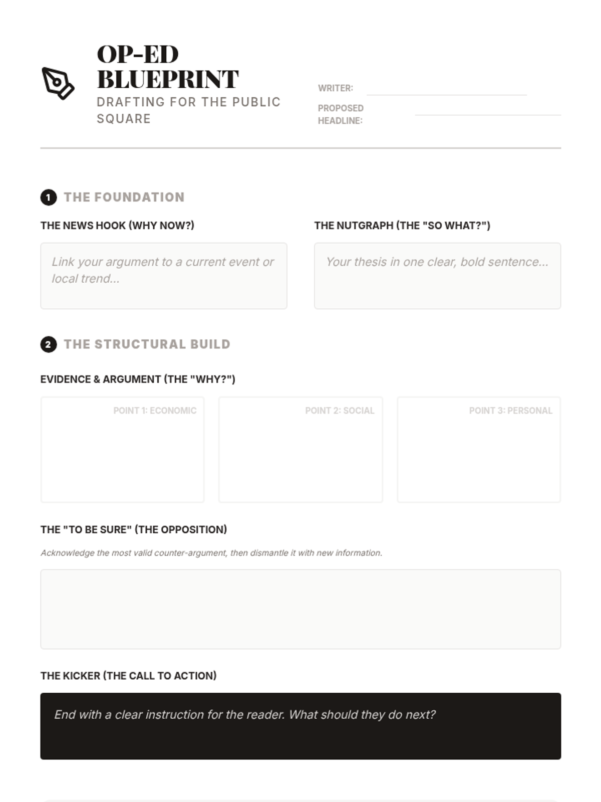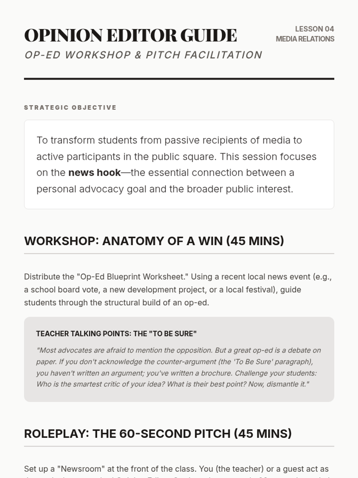 Master the mechanics of traditional media relations, from drafting persuasive op-eds to pitching stories. Students learn to frame local arts issues as essential public interests.
