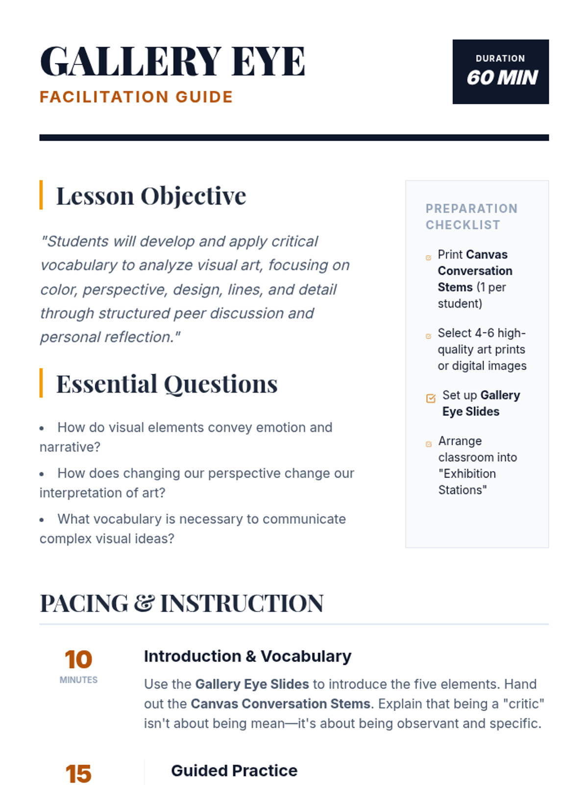 A lesson designed to help students analyze and discuss visual art using specific vocabulary and sentence stems focused on color, perspective, design, lines, and detail.