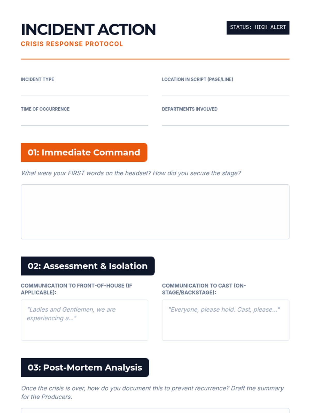 Simulate high-pressure technical rehearsals. Develop crisis communication skills and command presence to manage equipment failures and artistic disputes under the clock.