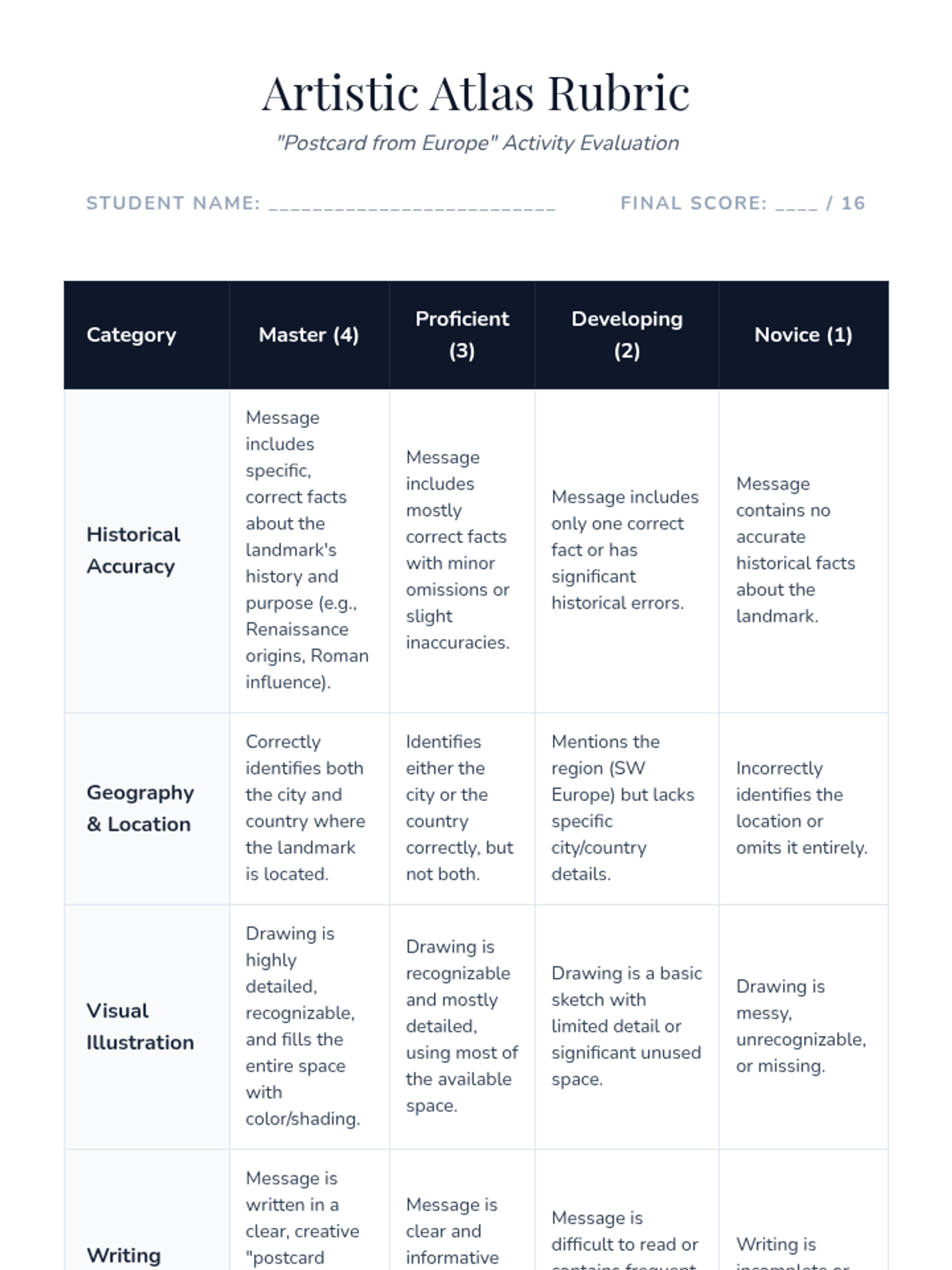 Students will explore the iconic art and architecture of Southwestern Europe, specifically focusing on France, Italy, and Spain. They will analyze the significance of landmarks like the Mona Lisa and the Colosseum before creating a historical postcard to demonstrate their understanding of the region's cultural heritage.