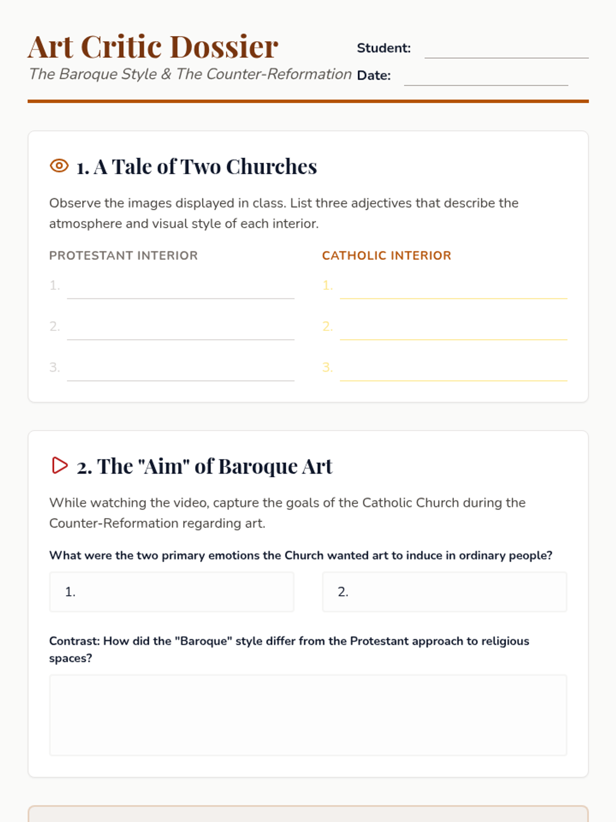 Students will investigate the contrasting aesthetics of Protestant and Catholic art during the Baroque period, focusing on how the Catholic Church used emotional and dramatic art as a tool of the Counter-Reformation to persuade and inspire the faithful.