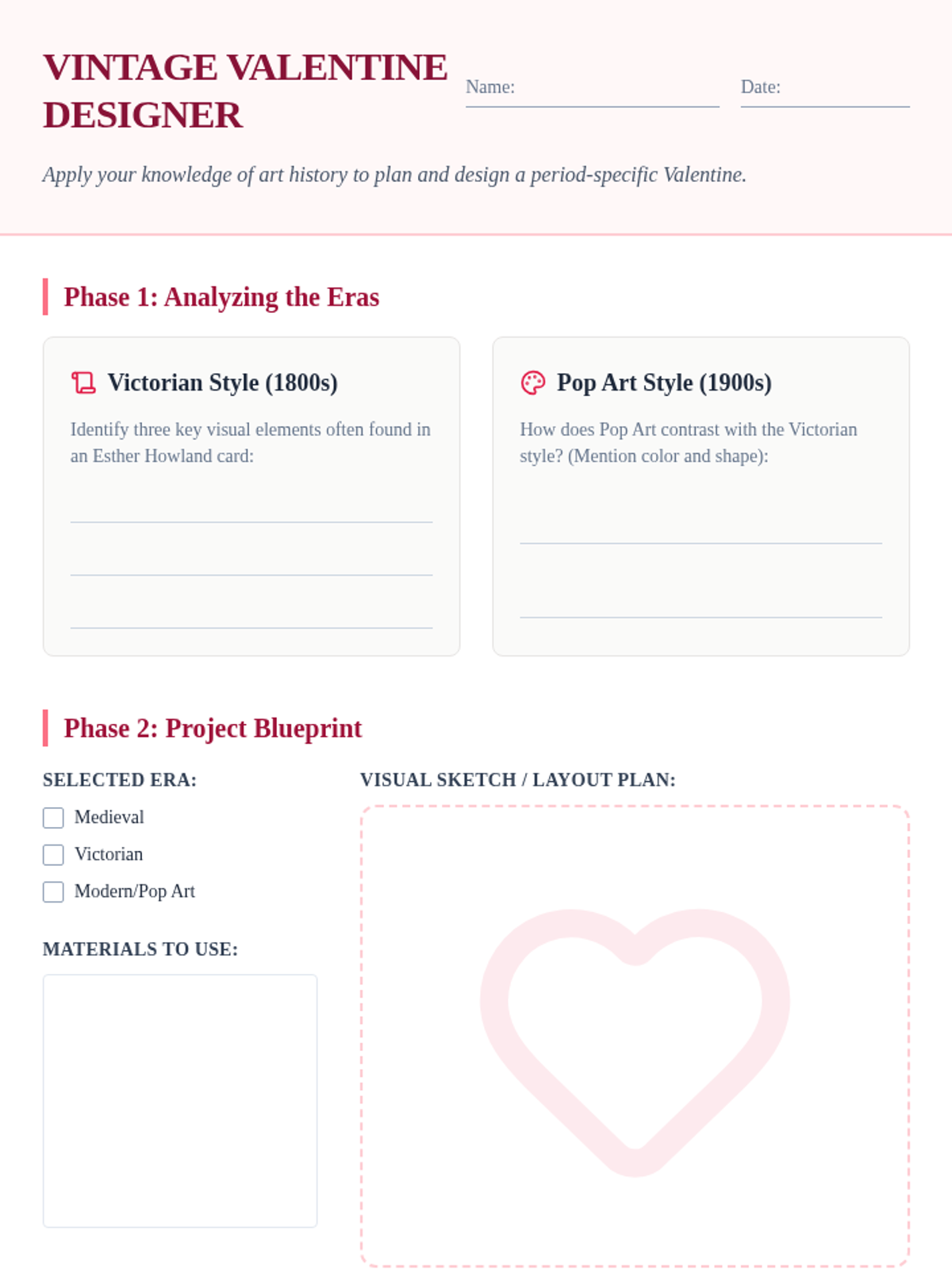 A 45-minute exploration of how Valentine's Day art has evolved from medieval manuscripts to modern pop art, followed by a creative design activity.