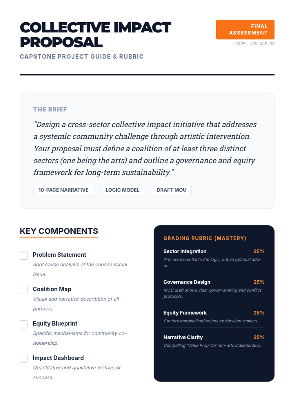 Students develop a proposal for a collective impact initiative that uses the arts to address a specific community issue.
